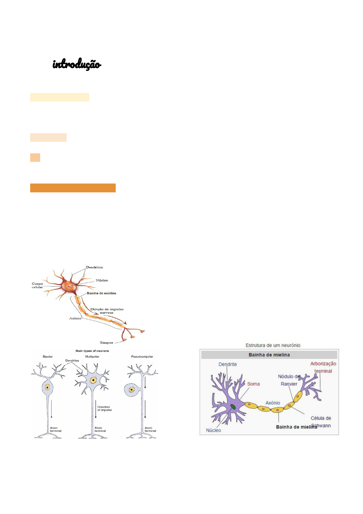 Histologia para Nutrição Segunda Unidade Tecido Ne introdução O tecido nervoso trata-se de um dos tecidos mais especializados do organismo animal e é o principal tecido responsável pela troca rápida de informações dentro do corpo. Esse tecido é sensível aos vários tipos de estímulos que se originam de fora ou do interior do organismo. Junção Mioneura l= Placa motora é a junção do nervo com o músculo. Glia são todas as células de suporte do neurônio do ponto de vista físico e nutricional. células do sitema nervoso central (SNC) 1. neurônios a. NEURÔNIOS BIPOLARES= nos orgãos sensitivos; b. NEURÔNIOS MULTIPOLARES= são os mais abundantes; c. NEURÔNIOS PSEUDOMULTIPOLARES= presentes nos gÂnglios espinais; 1. classificação de neurônios multipolares a. neurônio de golgi tipo i= o axônio tem que ultrapassar a árvore dendrídica; b. neurônio de golgi tipo ii= ele fica no perímetro da árvore dendrítica havendo uma propagação mais rápida; 2. classificação dos neurônios quanto suas funções a. neurônios motores (eferentes) b. neurônios sensoriais (aferentes) c. interneurônios= conexão do neurônio sensitivo e do neurônio motor componentes dos neurônios 1. corpo celular ou pericário a. corpúsculo de nissl= dentro do corpo celular, sendo onde as proteínas são produzidas e levadas ao complexo de golgi para serem empacotadas. sendo essas produzidas por poliribossomas 2. dendritos= ramificações diminutas que entram em contato com axônios de outro neurônio 3. axônios são envoltos por: a. bainha de mielina i. feita de lipídeos ii. produzida por oligodendrócitos (protegem os axônios); b. nódulo de ranvier= é a parte onde não há bainha de mielina e onde há a transmissão no sistema nervoso (nó a nó) c. potenciais de membrana e transmissão do impulso elétrico. 4. comunicação sináptica (impulso nervoso químico)= comunicação de axônio e telodendrono a. membrana pré sináptica b. fenda sináptica Histologia- Profº Pedro Paulo c. membrana pós sináptica 5. tipos de sinapses a. axossomática= axônio + dendrito (corpo celular) b. axodendrítica= axônio com dendrítica c. axoaxônica= axônio + axônio 6. células da glia As principais funções das células da glia são cercar os neurônios e mantê-los no seu lugar, fornecer nutrientes e oxigênio para os neurônios, isolar um neurônio do outro, destruir patógenos e remover neurônios mortos. Mantêm a homeostase, formam mielina e participam na transmissão de sinais no sistema nervoso. a. oligodendrócitos i. Os oligodendrócitos (ou oligodendróglia) são as células da neuróglia, responsáveis pela formação, e manutenção das bainhas de mielinados axônios, no SNC (sistema nervoso central), função em que no sistema nervoso periférico é executada pelas células de Schwann (só que apenas um oligodendrócito contribui para formação de mielina em vários neurônios ao contrário da célula de Schwann que mieliniza apenas um axônio). b. astócitos=Os astrócitos são células da neuróglia, são as mais abundantes do sistema nervoso central e são as que possuem as maiores dimensões.Levam esse nome pelo seu formato (:astro= estrela, cito= célula). ... Osastrócitos, desempenham funções muito importantes, como a sustentação e a nutrição dos neurônios. i. astrócitos fibrosos= presente na substância branca e tem pouca arborização. ii. astrócitos protoplásmaticos= maior arborização e ficam na substância cinzenta iii. pés vasculares= puxa os nutrientes iv. pés perineurais c. micróglia= macrofágos presentes no sn i. sua função é de fagocitose/ apresenta antígeno (em forma de traço= pode ser chamada de célula da glia) 7. substância branca a. fica na parte de dentro no encefálo e fora na médula espinal b. A substância branca se refere a um conjunto de células com funções de apoio, sustentação, isolamento elétrico ou nutrição dos neurônios e gânglios . Consiste principalmente de células gliais e axônios mielíticos. 8. substância cinzenta a. na parte de fora no encéfalo e na parte de dentro na médula espinal. b. Substância cinzenta, matéria cinzenta ou massa cinzenta é um importante componente do sistema nervoso central, consistindo de corpos de células nervosas, células da glia (astroglia e oligodendrócitos), capilares , axônios e dendritos. A substância cinzenta contém o corpo celular do neurônio, em contraste com a substância branca, a qual não contém e, em sua maioria, contém tratos de axônios mielíticos. A diferença de cores provém principalmente da brancura da mielina. Em tecidos vivos, na prática, a substância cinzenta tem uma cor mais cinza-amarronzada, a qual vem dos vasos sanguíneos capilares e dos corpos celulares dos neurônios. Histologia- Profº Pedro Paulo meninges - são faixas de tc que circundam 1. dura máter = protege e possui contato direto com o osso. manter o líquido cefalorraquidiano.tecido conjuntivo denso, contínuo com o perióstio dos ossos da caixa craniana. Já a dura-máter que envolve a medula espinhal, é separada do perióstio das vértebras, originando entre ambos, o chamado espaço epidural, onde são encontradas algumas estruturas como: veias , tecido conjuntivo frouxo e tecido adiposo . A parte da dura-máter que está em contato com a aracnóide é um local de fácil clivagem, onde em algumas situações patológicas, pode haver o acúmulo de sangue externamente à aracnóide, no chamado espaço subdural. 2. aracnóide= formado de tc frouxo. membrana sem vascularização que se divide em duas partes: uma em contato com a dura-máter e sob a forma de membrana, e a outra formada por traves que conecta a aracnóide com a pia-máter. Os espaços entre as traves dão origem ao espaço subaracnóide, onde está presente o líquido cefalorraquidiano, protegendo o sistema nervoso central contra traumatismos. Nesta membrana, existem saliências formadas devido à expansão da a