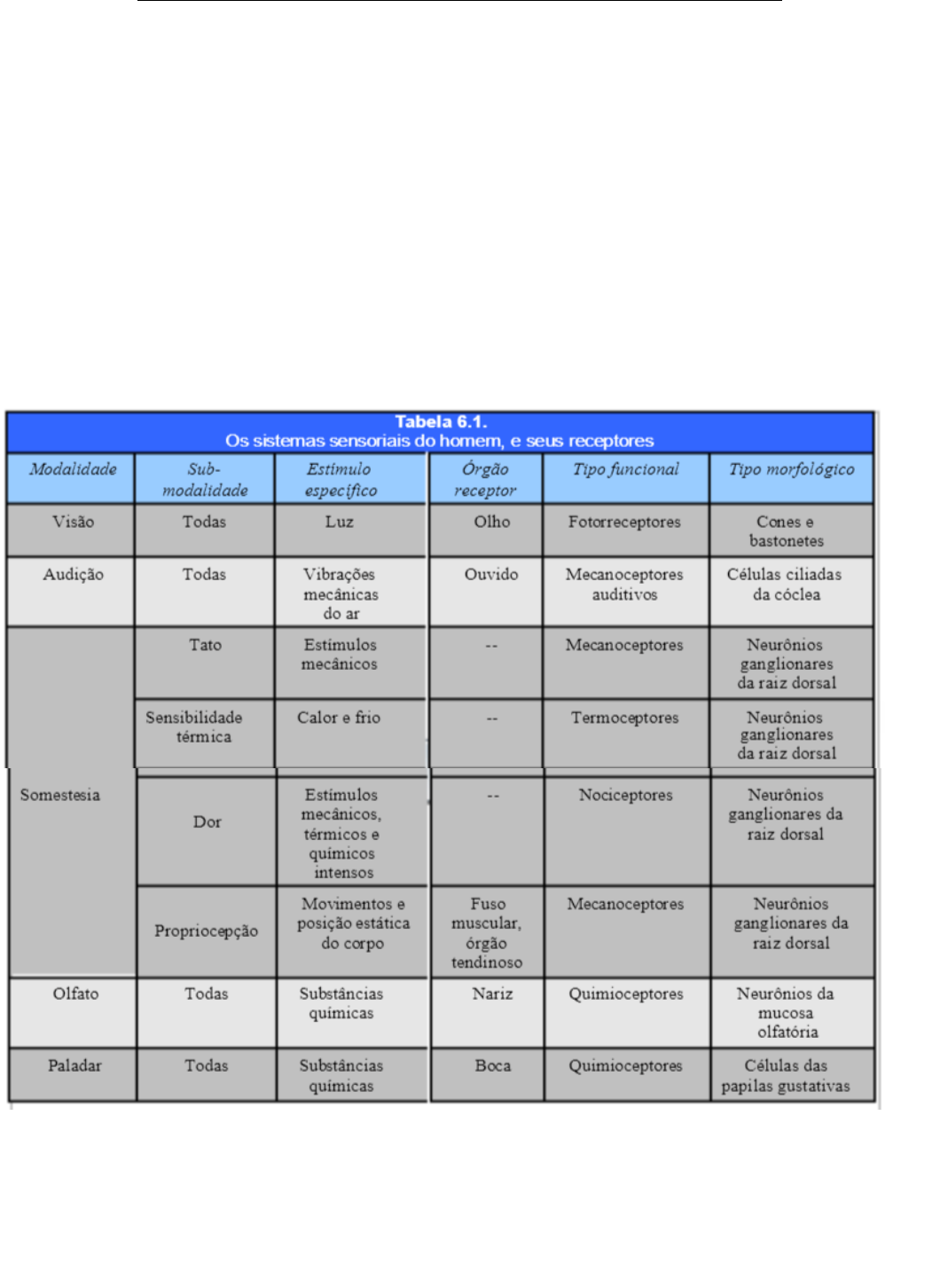 CODIFICAÇÃO SENSORIAL: RECEPTORES SENSORIAIS E SOMESTESIA. Somestesia: sensibilidade no corpo, ou seja, tudo que recebe e se comunica com o ambiente. Um receptor sensorial é a estrutura que reconhece um estímulo no ambiente interno ou externo de um organismo. Os receptores sensoriais localizam-se nos órgãos dos sentidos e são terminais nervosos com a capacidade de receber um determinado estímulo e transformá-lo em impulso nervoso. Esses receptores são classificados de acordo com a natureza do estímulo para os quais são sensíveis. Percepção do ambiente - Sentidos especiais: 5 sentidos 4 sentidos estão localizados na cabeça e 1 localizado no corpo inteiro + sistema sensorial visceral. *Na cabeça: visão, audição, olfação e vestibular. *No corpo inteiro: tato. - Cada sentido desse responde a estímulo de característica de natureza específica: - Cada sentido funciona primariamente a partir de receptores sensoriais. O primeiro contato que o nosso corpo tem com qualquer informação externa do ambiente é através dos receptores sensoriais. Então, cada sentido possui mini órgãos específicos que irão reconhecer o estímulo específico do ambiente, depois irá traduzir isso para o nosso corpo e então entender a informação e atuar sobre essa informação. Quimioceptores, sensíveis à presença ou concentração de determinadas substâncias, como os responsáveis pelo paladar e olfato, Fotorreceptores, sensíveis à luz, como os cones e bastonetes dos olhos, Termoceptores, sensíveis às mudanças da temperatura, Mecanoceptores, responsáveis pelas sensações táteis e auditivas. Nociceptor, envia sinal causando a percepção da dor em resposta a um estímulo. SISTEMA NERVOSO SENSORIAL: ESTÍMULOS. - Ocorrerá um estímulo externo (cheiro, gosto, barulho, luz). Esse estímulo será percebido pelos receptores sensoriais, chamado de potencial receptor (quando o primeiro estímulo é ativado no receptor). A informação será repassada ao longo da via ascendente pelos neurônios de 1ª ordem, 2ª e 3ª ordem, que irá se comunicar com o tálamo através de um potencial de ação. Do tálamo a informação vai para o córtex sensorial. - No córtex sensorial será processada a informação do estímulo, e então o corpo executa uma resposta. Ou pode também não executar nenhuma resposta. - No córtex se tem o entendimento da informação que a visão trouxe, a audição trouxe, etc. e irá ter o entendimento do que é o ambiente. OBS: O que era um estímulo de diversas naturezas, ou seja, estímulo químico, ou mecânico, ou de vibração, virou um estímulo elétrico. ATRIBUTOS DE UM ESTÍMULO. - Modalidade: qual sensação o órgão sensorial evoca. A modalidade sensorial é determinada pela forma de estímulo que o órgão específico traduz. Ex: cone e bastonete: a modalidade é a visão. - Localização: posição do órgão sensorial e como isso é traduzido pelo cérebro. - Intensidade: amplitude de um estímulo. Quando maior a amplitude do estímulo, maior a amplitude do potencial receptor e maior a frequências dos potencias de ação. Quanto menor a amplitude do estímulo, menor a amplitude do potencial receptor e menor a frequência dos potenciais de ação. - A frequência dos potenciais de ação é proporcional à quantidade de neurotransmissores liberados na sinapse. E isso no cérebro é entendido como mais ou menos intenso. - Existem receptores que respondem melhor a estímulos de alta intensidade e receptores que respondem melhor a estímulos de baixa intensidade. - Duração: determinado pela tempo de adaptação dos receptores. Existem receptores que se comportam de maneiras diferentes: possuem os de adaptação rápida e os de adaptação lenta. *Adaptação rápida: enquanto estiver estimulando vai estar entendendo que está recebendo um estímulo, e irá responder disparando potencial de ação. Quando parar o estímulo ele responde. *Adaptação lenta: se adapta muito rápido. Entende o estímulo enquanto ele durar. Quando o estímulo parar, ele não responde mais. - Isso é importante para não sentirmos os estímulos a todo momento. E sim somente quando houver uma mudança no ambiente, como por exemplo: ao encostar em algo. SISTEMA SOMATOSENSORIAL. A sensação somática permite que o nosso corpo sinta o contato, a dor, o frio e que saiba reconhecer o que fazem as diferentes partes do corpo. O corpo é sensível a muitos tipos de estímulos: à pressão de objetos contra a pele, à posição das articulações e dos músculos, à distensão da bexiga e à temperatura dos membros e do próprio tecido neural. Quando os estímulos tornam-se tão intensos que podem ser lesivos, a sensação somática também é responsável por uma sensação desagradável, porém de vital importância, a dor. O sistema sensorial somático difere de outros sistemas sensoriais de duas maneiras interessantes. Primeiro, seus receptores estão distribuídos por todo o corpo ao invés de estarem concentrados em locais restritos, especializados. Segundo, pelo fato de esse sistema responder a muitos diferentes tipos de estímulos, podemos considerá-lo como um grupo de, pelo menos, quatro sentidos, em vez de apenas um: os sentidos tátil, da temperatura, da dor e da posição do corpo. Esses quatro sentidos podem ser, por sua vez, subdivididos em muitos outros. O sistema sensorial somático é, de fato, um nome abrangente, uma categoria coletiva para todas as sensações que não sejam visão, audição, gustação, olfação e o sentido vestibular do equilíbrio. A concepção popular de que possuímos apenas cinco sentidos é, obviamente, muito simplória. Se algo toca o seu dedo, você pode determinar com precisão o local, a pressão, a agudeza, a textura e a duração do toque. Se for um alfinete, não haverá como confundi-lo com um martelo. Se o toque se deslocar de sua mão para o punho e subir pelo braço até o ombro, você poderá acompanhar sua velocidade e