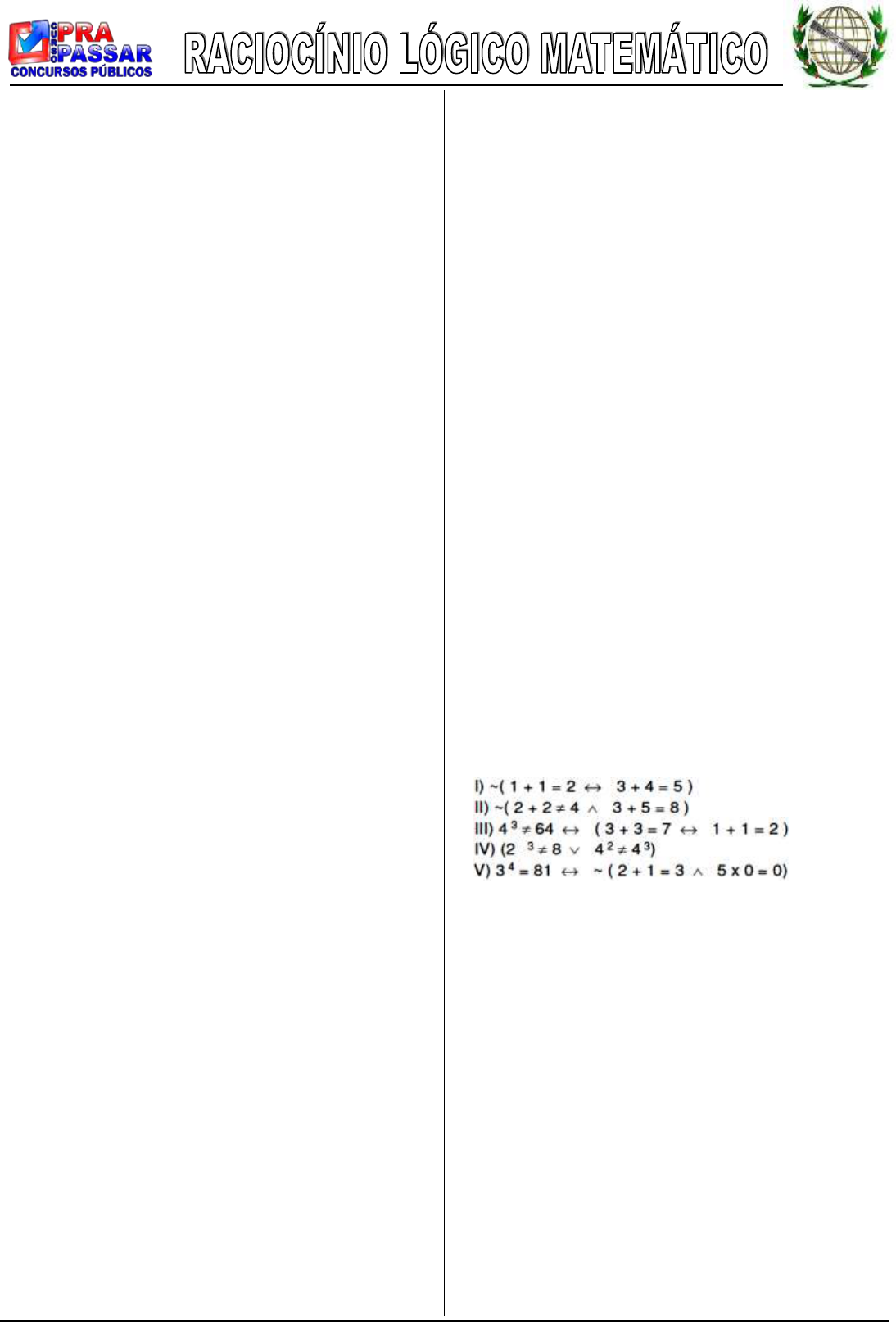 PRA PASSAR – PROF ANDRÉ BARRETO RLM – CPII – 2017 TEMA 1 Lógica das proposições, Uso dos conectivos, Tabelas verdade e Equivalências. TEMA 2 Diagramas Lógicos e Argumento Lógico: Analogias, Inferências, Deduções e Conclusões; TEMA 3 Estrutura lógica de relações arbitrárias entre pessoas, lugares, objetos ou eventos fictícios; Resolução de situações problemas envolvendo raciocínio lógico. ________________________________________________________ 01. Sabe-se que sentenças são orações com sujeito (o termo a respeito do qual se declara algo) e predicado (o que se declara sobre o sujeito). Na relação seguinte há expressões e sentenças: 1. Três mais nove é igual a doze. 2. Pelé é brasileiro. 3. O jogador de futebol. 4. A idade de Maria. 5. A metade de um número. 6. O triplo de 15 é maior do que 10. É correto afirmar que, na relação dada, são sentenças apenas os itens de números : (A) 1, 2 e 6. (B) 2, 3 e 4. (D) 1, 2, 5 e 6. (C) 3, 4 e 5. (E) 2, 3, 4 e 5. 02. A alternativa que apresenta uma sentença que, do ponto de vista lógico, pode ser considerada uma proposição é: (A) Quantas multas você já levou? (B) Meu Deus! (C) Há vida em marte. (D) Faça uma boa prova. (E) Ele foi o melhor jogador daquele ano. 03. Das cinco frases abaixo, quatro delas têm uma mesma característica lógica em comum, enquanto uma delas não tem essa característica. I. Que belo dia! II. Um excelente livro de raciocínio lógico. III. O jogo terminou empatado? IV. Existe vida em outros planetas do universo. V. Escreva uma poesia. A frase que não possui essa característica comum é a: (A) I (B) II (C) III (D) IV (E) V 04. Considerando p e q proposições, analise as alternativas e marque a incorreta. (A) A proposição ¬p tem sempre o valor oposto de p, isto é, ¬p é verdadeira quando p é falsa e ¬p é falsa quando p é verdadeira; (B) Uma proposição pode ser verdadeira e falsa ao mesmo tempo; (C) Chama-se proposição ou sentença toda oração declarativa que pode ser classificada de verdadeira ou de falsa; (D) Chama-se proposição simples ou proposição atômica aquela que não contém nenhuma outra proposição como parte integrante de si mesma; (E) Chamam-se conectivos, palavras que se usam para formar novas proposições a partir de outras. 05. Dentre as alternativas, a única correta é: (A) O valor lógico da conjunção entre duas proposições é verdade se os valores lógicos das duas proposições forem falsos. (B) O valor lógico do bicondicional entre duas proposições é verdade se os valores lógicos das duas proposições forem falsos. (C) O valor lógico da disjunção entre duas proposições é verdade se os valores lógicos das duas proposições forem falsos. (D) O valor lógico do condicional entre duas proposições é falso se os valores lógicos das duas proposições forem falsos. 06. Dentre as alternativas abaixo e considerando o valor lógico das proposições compostas, a única falsa é: (A) (3 + 4 = 7) ou (25% de 60 = 18) (B) (4 + 4 = 8) e (3 + 5=7) (C) Se (2 + 3 = 4), então (1 + 4 = 3) (D) (1 + 4 = 4) se, e somente se, (2 + 3 = 6) 07. (CPII) Analise as seguintes proposições: I – Ou 3 é ímpar ou 10 é múltiplo de 5. II – 8 é par ou 5 é múltiplo de 3. III – 7 é número par e 9 é um múltiplo de 3. É verdadeiro apenas o que se afirma em: (A) II (B) I (C) III (D) I e II (E) II e III 08. Dadas as proposições simples p e q, tais que p é verdadeira e q é falsa, considere as seguintes proposições compostas: (1) p q ; (2) (p) q ; (3) [p ( q)] ; (4) (p q) Quantas dessas proposições compostas são verdadeiras? (A) Nenhuma (B) Apenas uma (C) Apenas duas (D) Apenas três (E) Quatro 09. Sejam as proposições p: 15% de 30% = 45% e q: a quarta parte de uma dúzia é igual a 3, e considerando os valores lógicos dessas proposições, podemos afirmar que o valor lógico da proposição composta (p → q) ↔ p é: (A) falso (B) verdadeiro ou falso (C) verdade (D) inconclusivo 10. Dadas as proposições A que tem valor lógico FALSO é a (A) IV (B) V (C) III (D) II (E) I 11. Questionados sobre a falta ao trabalho no dia anterior, três funcionários do Ministério das Relações Exteriores prestaram os seguintes depoimentos: − Aristeu: “Se Boris faltou, então Celimar compareceu.” − Boris: “Aristeu compareceu e Celimar faltou.” − Celimar: “Com certeza eu compareci, mas pelo menos um dos outros dois faltou.” Admitindo que os três compareceram ao trabalho em tal dia, é correto afirmar que: (A) Aristeu e Boris mentiram. (B) os três depoimentos foram verdadeiros. (C) apenas Celimar mentiu. (D) apenas Aristeu falou a verdade. (E) apenas Aristeu e Celimar falaram a verdade. PRA PASSAR – PROF. ANDRÉ BARRETO – profbarreto@gmail.com RLM – CPII – 2017 2 12. De acordo com o raciocínio lógico proposicional, a negação da frase “O carro é novo e a moto é seminova”, é: (A) O carro não é novo e a moto não é seminova. (B) O carro não é novo e a moto é seminova. (C) O carro não é novo ou a moto é seminova. (D) O carro não é novo ou a moto não é seminova. 13. De acordo com a equivalência lógica, a negação da frase “Se Paulo compra um carro, então não paga à vista” é: (A) Paulo não compra um carro ou não paga à vista. (B) Paulo não compra um carro ou paga à vista. (C) Paulo compra um carro e não paga à vista. (D) Paulo não compra um carro e paga à vista. (E) Paulo compra um carro e paga à vista. 14. A negação lógica da frase “Maurício comprou um notebook ou Paula não foi à escola” é dada por: (A) Maurício não comprou um notebook ou Paula foi à escola. (B) Se Maurício não comprou um notebook, então Paula foi à escola. (C) Maurício não comprou um notebook e Paula não foi à escola. (D) Maurício não comprou um notebook e Paula foi à escola. 15. Seja a proposição p: Maria é estagiária e a proposição q: Marcos é estudante. A negaçã
