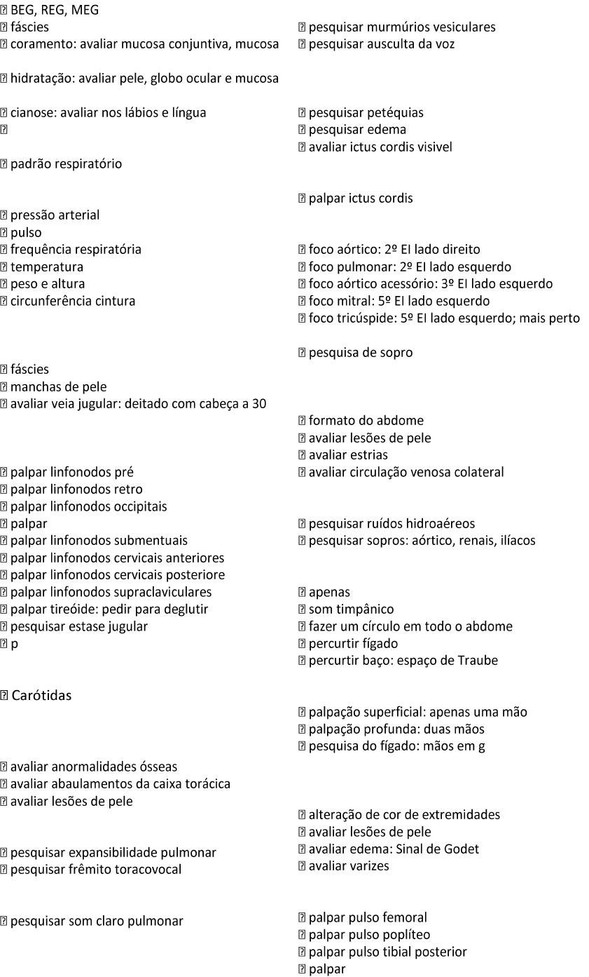 ROTEIRO EXAME FÍSICO GERAL QUALITATIVO: BEG, REG, MEG fáscies coramento: avaliar mucosa conjuntiva, mucosa oral, leito ungueal e palmas das mãos. hidratação: avaliar pele, globo ocular e mucosa oral cianose: avaliar nos lábios e língua icterícia: pele, globo ocular, freio da língua, palma das mãos padrão respiratório Geral: QUANTITATIVO: pressão arterial pulso frequência respiratória temperatura peso e altura --> calculo do IMC circunferência cintura CABEÇA E PESCOÇO: INSPEÇÃO: fáscies manchas de pele avaliar veia jugular: deitado com cabeça a 30 graus PALPAÇÃO: palpar linfonodos pré-auriculares palpar linfonodos retro-auriculares palpar linfonodos occipitais palpar linfonodos submandibulares palpar linfonodos submentuais palpar linfonodos cervicais anteriores palpar linfonodos cervicais posteriore palpar linfonodos supraclaviculares palpar tireóide: pedir para deglutir pesquisar estase jugular palpar carótida AUSCULTA: Carótidas PULMONAR: INSPEÇÃO: avaliar anormalidades ósseas avaliar abaulamentos da caixa torácica avaliar lesões de pele PALPAÇÃO: pesquisar expansibilidade pulmonar pesquisar frêmito toracovocal PERCUSSÃO pesquisar som claro pulmonar PULMONAR: AUSCULTA: pesquisar murmúrios vesiculares pesquisar ausculta da voz CARDÍACO: INSPEÇÃO: pesquisar petéquias pesquisar edema avaliar ictus cordis visivel PALPAÇÃO: palpar ictus cordis AUSCULTA: foco aórtico: 2º EI lado direito foco pulmonar: 2º EI lado esquerdo foco aórtico acessório: 3º EI lado esquerdo foco mitral: 5º EI lado esquerdo foco tricúspide: 5º EI lado esquerdo; mais perto do meio do corpo pesquisa de sopros ABDOMINAL: INSPEÇÃO: formato do abdome avaliar lesões de pele avaliar estrias avaliar circulação venosa colateral AUSCULTA: pesquisar ruídos hidroaéreos pesquisar sopros: aórtico, renais, ilíacos PERCUSSÃO: apenas um dedo encostado na barriga som timpânico fazer um círculo em todo o abdome percurtir fígado percurtir baço: espaço de Traube PALPAÇÃO: palpação superficial: apenas uma mão palpação profunda: duas mãos pesquisa do fígado: mãos em garra VASCULAR: INSPEÇÃO: alteração de cor de extremidades avaliar lesões de pele avaliar edema: Sinal de Godet avaliar varizes PALPAÇÃO: palpar pulso femoral palpar pulso poplíteo palpar pulso tibial posterior palpar pulso pedioso