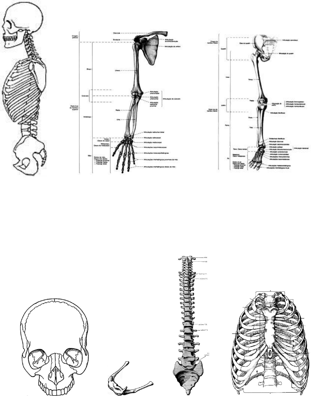 Roteiro para Aula Prática Generalidades - Esqueletologia O esqueleto representa o conjunto de ossos, cartilagens e articulações, e divide-se em: - axial (constitui o eixo do corpo) é representado por ossos da cabeça, pescoço e tronco - apendicular é representado pelos ossos dos membros Esqueleto Axial Compreende: - o esqueleto cefálico (da cabeça = neurocrânio e viscerocrânio) - o osso hióide (no pescoço) - a coluna vertebral - o esqueleto do tórax Neurocrânio ou Esqueleto Neural:- Compreende ossos medianos (impares) e bilaterais (pares). São ossos medianos: 01 - Frontal / 02 - occipital / 03 – esfenóide / 04 - etmóide São ossos bilaterais: 05 – parietal / 06 - temporal - no osso temporal encontram-se os ossículos da orelha média martelo, bigorna e estribo Vista Anterior Vista Lateral Vista inferior - Vista externa da base do crânio Vista interna da base do crânio Viscerocrânio ou Esqueleto Visceral (Esqueleto da Face): Compreende ossos medianos e bilaterais. São ossos medianos (impares): 07 - mandíbula / 08 - vômer São ossos bilaterais (pares): 09 - maxila / 10 - nasal / 11 - lacrimal / 12 - zigomático / 13 - palatino / 14 - conchal Osso do Pescoço:- é o único osso que não se articula no esqueleto está fixado à base do crânio através de ligamentos 15 - osso hióide Esqueleto da Coluna Vertebral Nela observamos 33 vértebras separadas entre si pelos discos intervertebrais Em uma vértebra típica observamos elementos comuns às vértebras de qualquer região da coluna: 16 - corpo vertebral apresenta forma e tamanho diferentes de acordo com a região 17 - arco vertebral é formado por dois hemi-arcos onde estão unidos 19 + 20 18 - forame vertebral aloja a medula espinhal e apresenta diâmetros diferentes de acordo com a região 19 - pedículo vertebral apresenta a incisura superior (rasa) e a inferior (profunda) 20 - lâmina vertebral 21 - processo articular superior (direito e esquerdo) 22 - processo articular inferior (direito e esquerdo) 23 - processo transverso (direito e esquerdo) 24 - processo espinhoso apresenta direção e morfologia diferente de acordo com a região 25 - disco intervertebral fibrocartilaginoso articula os corpos vertebrais de vértebras adjacentes A coluna vertebral é formada pelas regiões: cervical / torácica / lombar / sacral / coccígea As regiões cervical, torácica e lombar correspondem à parte móvel da coluna. As regiões sacral e coccígea ou sacro-coccígea, correspondem à parte fixa da coluna. Região cervical da coluna vertebral Compreende sete vértebras cervicais C1 à C7 = 3 atípicas e 4 típicas São vértebras cervicais atípicas: 26 - atlas é a primeira vértebra cervical (não apresenta corpo vertebral) 27 - áxis é a segunda vértebra cervical (possui o processo odontóide sobre o corpo) 28 - vértebra proeminente é a sétima cervical (apresenta um processo espinhoso longo) 29 - forame transverso presentes em todas as vértebras cervicais por onde passam as aa. vertebrais Região torácica da coluna vertebral Compreende 12 vértebras torácicas T1 à T12 Apresentam corpo vertebral aproximadamente triangular e forame vertebral menor. As vértebras torácicas, além dos elementos comuns tem como característica a presença de: 30 - fóvea costal superior do corpo da vértebra (direita e esquerda) 31 - fóvea costal inferior do corpo da vértebra (direita e esquerda) 32 - fóvea costal transversa nos processos transversos 33 - processo espinhoso é fino e longo com direção para baixo Obs: As fóveas costais são depressões para as articulações com as costelas. Região lombar da coluna vertebral Compreende 5 vértebras lombares L1 à L5 Apresentam corpo vertebral com formato de grão de feijão e forame vertebral reduzido. 34 - Processo costal corresponde ao processo transverso que faz “lembrar” a costela Região sacral da coluna vertebral Compreende 5 vértebras sacrais fundidas pela sinostose S1 à S5 A fusão das vértebras determina a formação do osso sacro ou sacral. 35 - Osso sacro Região coccígea da coluna vertebral Compreende de 3 a 4 vértebras coccígeas (na verdade, vértebras rudimentares). A fusão das vértebras coccígeas determina a formação do osso cóccix. 36 - Osso cóccix Esqueleto do Tórax É formado pelas costelas, pelas cartilagens costais e pelo osso esterno. As costelas, em número de doze pares, são divididas em: - verdadeiras em número de sete - ligam-se diretamente ao osso esterno através de cartilagem costal própria - falsas em número de três - ligam-se indiretamente ao esterno através de cartilagem costal própria - flutuantes em número de duas - não se ligam ao esterno Uma costela típica possui: 37 - cabeça globosa se articula com o corpo da vértebra 38 - colo estreitamento entre a cabeça e o corpo 39 - corpo tem a forma alongada e curvada anteriormente 40 - tubérculo costal posterior articula-se com o processo transverso O osso esterno (do gr. sterno = peito) é composto por: 41 - manúbrio de situação superior 42 - corpo de situação média 43 - processo xifóide de situação inferior 44 - incisura jugular depressão da margem superior do manúbrio palpável no ser vivo Cinturas, Cíngulos ou Cintas São os ossos que fazem a conexão do esqueleto axial com o esqueleto apendicular. Cintura Escapular 45 - escápula 46 - clavícula Cintura Pélvica 47 - osso do quadril (coxal) em relação à fossa do acetábulo é formado pelos ossos: - ílio = situado superiormente - ísquio = situado ínfero-posteriormente - púbis = situado ínfero-anteriormente Esqueleto Apendicular Ossos do Membro Superior 48 – úmero: osso do braço 49 – rádio: osso do antebraço situado lateralmente 50 – ulna: osso do antebraço situado medialmente Ossos da Mão Ossos do carpo são em número de 8 ossos curtos Fileira proximal (contando de lateral para medial): 51 - escafóide / 52 - semilunar / 53 - piramidal / 54 - pisiforme Fileira distal (contando d