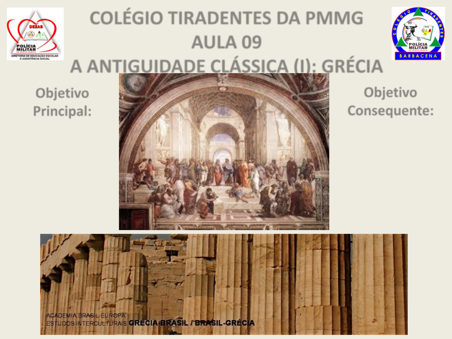 COLÉGIO TIRADENTES DA PMMG AULA 09 A ANTIGUIDADE CLÁSSICA (I): GRÉCIA Objetivo Principal: Abordar a Grécia do período homérico e, posteriormente, o surgimento da pólis. Objetivo Consequente: Apresentar a pólis como ponto de referência da identidade dos gregos antigos. Quais aspectos diferenciaram os Gregos das demais civilizações do mundo antigo e qual a sua importância para a cultura Ocidental? - A valorização da razão; - A busca por explicações concretas para todos os fenômenos; - Criaram a base e a fundamentação para o desenvolvimento do pensamento científico. Observação Importante: Embora este modelo tenha reduzido sensivelmente o papel da religião na política, ele não implicou o fim da religiosidade entre os gregos antigos, que continuavam com seus deuses. Comprovação: O juramento até hoje feito por médicos é atribuído a Hipócrates (Pai da Medicina), começando a invocação dos deuses Apolo, Esculápio, Higieia e Panaceia. O mito nas civilizações antigas “O mito é uma narrativa que procura justificar a ordem do Universo, os fenômenos da natureza e as relações entre os seres humanos em bases sobrenaturais e divinas. O pensamento mítico articula-se em teogonia e cosmogonia. (...) Possui uma dimensão pedagógica, à medida que seus conteúdos são socialmente aceitos como verdadeiros, descrições que elucidam a finalidade de tudo aquilo que existe. (...) o mito não se expõe ao debate racional, pleiteando (...) a sua aceitação pelo valor sagrado da sua tradição.” TEOGONIA: Genealogia que descreve os graus de parentesco entre os deuses e a ordenação das forças divinas que sustentam o cosmos. COSMOGONIA: Pretende revelar a formação do Universo e os fenômenos que compõem a nossa realidade ou, em outras palavras, explicar porque o mundo é do modo como o observamos. Qual a importância dos mitos para os gregos? O que é mito? “[...] mito é uma narrativa (tipicamente anônima) sobre seres sobrenaturais. A importância do mito está na forma como engloba e expressa crenças e valores compartilhados por [...] um grupo cultural específico. Por conseguinte, um mito pode explicar a origem do grupo (ou do mundo em geral), o lugar daquele grupo no mundo e sua relação com outros grupos, e ilustrar ou exemplificar os valores morais venerados pelo grupo. *...+” EDGAR, Andrew; SEDGWICK, Peter. Teoria cultural de A a Z., São Paulo: Contexto, 2003 p. 214. Ramos Mais Importantes da Filosofia: Cosmologia: Indagação acerca do princípio de todas as coisas. Busca pelo conhecimento profundo do Universo e dos Fenômenos Naturais (Período Pré-Socrático da Filosofia Grega); Ontologia: Estudo do Ser ou Essência Última das coisas. De acordo com Platão e Aristóteles a ontologia é concebida como Metafísica (Além dos sentidos, aquilo que jamais se modifica); Gnosiologia: Indagações sobre a natureza do conhecimento. Dedicada ao exame das fontes, das possibilidades e das condições do conhecimento da realidade; Lógica: Busca pelas leis que orientam o pensamento na busca pelo conhecimento (Aristóteles Vídeo: Grande Civilizações – Grécia Antiga (Parte 1) (11:03) GRÉCIA ANTIGA - HÉLADE O MUNDO GREGO GRÉCIA DIVISÃO PERIÓDICA PERÍODO CARACTERÍSTICAS DURAÇÃO PRÉ-HOMÉRICO Influência Cretense; Invasões de Aqueus, jônios, eólios e dórios Séculos XX a XII a.C. HOMÉRICO Fundação de cidades-estado (pólis) Séculos XII a VIII a.C. ARCAICO Hegemonia de Atenas e Esparta. Séculos VIII a VI a. C. CLÁSSICO Séc de Péricles, Guerras greco-pérsicas e Guerra do Peloponeso Séculos VI a IV a. C. HELENÍSTICO Domínio macedônico Séculos IV a II a. C. Características Culturais-Ideológicas: * Antropocentrismo; Escravismo e Culturalismo LOCALIZAÇÃO: TRÊS IMPORTANTES REGIÕES: 1) Grécia Continental (Sul da Península Balcânica) – Montanhas - Peloponeso 2) Grécia Insular (Ilhas dos Mares Egeu e Jônio) -2.000 Ilhas- 3) Grécia Asiática (Estreita e Longa Faixa de Terra na Ásia Menor) Período Pré-Homérico = Povoamento Origem: Cretenses; Micênicos e Indo-Europeus PELASGOS (Pelágios) Arianos (Indo-Europeus) Aqueus Eólios Jônios Dórios Cidades: Expansão Marítima Armeiros de Ferro Tirinto TALASSOCRACIA Micenas Destruíram Micenas Conquistas: Mar Egeu 1ª Diáspora Grega Mar Negro (Ásia menor) Creto-Micênica Cidade-Estado Cretense Gerou os Clânicos Cnosso Destruída (Genos) Séc. XX Séc. XII CIVILIZAÇÃO CRETENSE * Creta era a maior Ilha do Mar Egeu e foi o berço de uma civilização antiga que muito influenciou a dos gregos. * Produziam cereais, criavam gado e aproveitavam os recursos que o mar oferecia. * Organizava-se em torno de palácios governados por reis que basteciam seus celeiros com os impostos que cobravam da população. Obs.: O mais rico Palácio Cretense era o de Cnossos. Os cretenses eram centrados no palácio (eixo da vida social) e na cidade. * Desenvolveram a ESCRITA LINEAR A (Ainda não decifrado) e não eram gregos. Costumavam fazer viagens e tinham contato com os Egípcios. * Creta foi abalada por uma catástrofe natural (provavelmente terremoto) e foi conquistada pelos Aqueus. CIVILIZAÇÃO MICÊNICA Em torno de 2000 a.C., tribos indo-europeias (Índia + Europa) rumaram pra o sul Cretenses + Indo-Europeus = Civilização Micênica. * Aqueus ocuparam, inicialmente a Península do Peloponeso, no sul da Grécia, onde fundaram várias cidades, entre as quais MICENAS; daí o nome dado a sua civilização. * Por meio da navegação Indo-europeus entraram em contato com os cretenses, de quem assimilaram conhecimentos que, depois, usaram para dominá-los e assumir a liderança comercial nos mares da região. * Palácios murados e construídos nos altos das colinas. O principal era o Palácio de Micenas. * Apogeu: Entre 1400 a.C. e 1230 a.C. * Desenvolveram a ESCRITA LINEAR B (ramo do grego antigo) * Fim: Guerras Internas, Perturbações Políticas e Mudanças Climáticas PENÍNSULA BALCÂNICA T