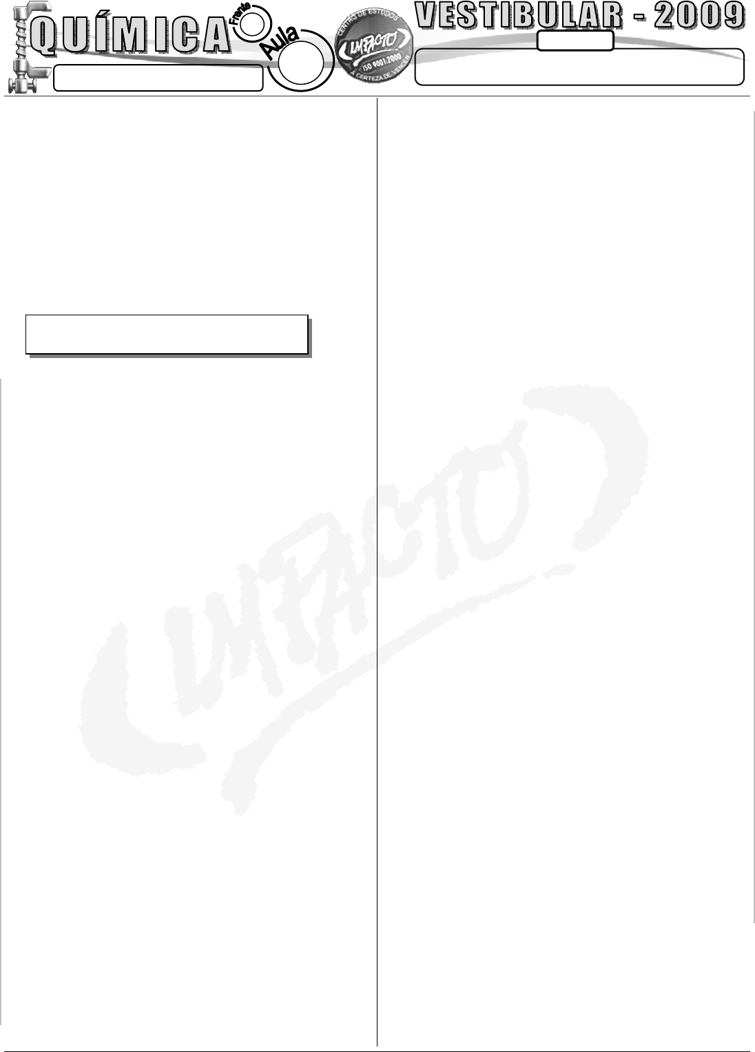 KL 140408 NÚMERO DE OXIDAÇÃO (Exercício) FAÇO IMPACTO - A CERTEZA DE VENCER!!! PROFº: THOMAS JEFFERSON Fa le c on os co w w w .p or ta lim pa ct o. co m .b r VE ST IB UL AR – 2 00 9 CONTEÚDO A Certeza de Vencer E08 1 01. (FMPA-MG) Considere as seguintes desintegrações: I. xNaAl +→ 24112813 III. →Al2813 tSi +2814 II. yMgAl +→ 27122813 IV. zAlAl +→ 26132813 • As partículas emitidas são: x Y t z a) 1 alfa 1 próton 1 beta 2 nêutrons b) 4 nêutrons 1 nêutron 1 alfa 2 beta c) 2 alfa 1 hélio 1 nêutron 2 nêutrons d) 4 prótons 2 nêutrons 1 próton 1 alfa e) 4 hélios 1 próton 1 beta 2 prótons 02. (Mack-SP) Na seqüência radioativa: Temos, sucessivamente, emissões: a) β, β, β, α c) α, β, α, β e) β, α, α, β b) α, β, β, α d) α, α, β, β 03. (UNICAMP) O isótopo U23892 decai emitindo uma partícula α. O elemento formado emite uma partícula β, originando um terceiro núcleo, que também emite partícula β. O nº de massa e o nº atômico do último elemento da série são, respectivamente, iguais a: a) 232 e 88 c) 234 e 92 e) 236 e 92 b) 234 e 90 d) 234 e 88 04. Acerte os coeficientes das equações abaixo pelo método das tentativas. a) SO2 + O2 → SO3 b) N2 + H2 → NH3 c) HNO3 + Ca(OH)2 → Ca(NO3)2 + H2O d) Mg + H3PO4 → Mg3(PO4)2 + H2 e) Fe(OH)3 + H2SO3 → Fe2(SO3)3 + H2O f) CO + O2 → CO2 g) Ca(HCO3)2 + HCl → CaCl2 + CO2 + H2O h) C2H5OH + O2 → CO2 + H2O i) C3H8 + O2 → CO2 + H2O 05. Nas espécies químicas HF, HIO3, HClO, ClO4— e BrO3—, os números de oxidfação dos halogênios são, respectivamente: a) + 1, + 5, + 1, + 4, + 3. b) + 1, + 5, + 1, – 5, – 1. c) – 1, + 5, + 1, + 7, + 5. d) – 1, – 5, + 1, – 7, – 3. e) 0, + 6, – 1, + 7, – 5. 06. A seqüência que representa, respectivamente, reações de síntese, análise, simples troca e dupla troca é: I - Zn + Pb(NO3)2 → Zn(NO3)2 + Pb. II - FeS + 2HCl → FeCl2 + H2S↑ III - 2NaNO3 → 2NaNO2 + O2↑ IV - N2 + 3H2 → 2NH3 a) I, II, III e IV. b) III, IV, I e II. c) IV, III, I e II. d) I, III, II e IV. 07. (PRISE 2002) A água distribuída para a população deve ser tratada, a fim de que se adeque às normas técnicas de potabilidade. No processo de tratamento, são utilizadas também reações químicas como a floculação resultante do adicionamento da cal hidratada à água e posteriormente sulfato de alumínio conforme a reação química (não balanceada): Al2(SO4)3 + Ca(OH)2 → Al(OH)3 + CaSO4 Após o balanceamento, os coeficientes desta reação serão: a) 3, 1, 3, 2 b) 3, 3,4, 2 c) 4, 2, 3, 1 d) 2, 4, 3, 2 e) 1, 3, 2, 3 08. (PRISE 2002) O escurecimento de objetos de prata se deve à formação do sulfeto de prata (Ag2S) em sua superfície. O sal pode ser removido colocando-se os objetos em uma panela de alumínio contendo solução de bicarbonato de sódio. Após alguns minutos, a superfície torna-se espelhada com a exposição da prata metálica. A equação química do processo é: Al(s) + Ag2S(s) → Al2S3(s) + Ag(s) São feitas as seguintes afirmativas sobre a remoção do Ag2S: I - O alumínio, por ser mais reativo que a prata, provoca a redução íon Ag+. II - Os coeficientes corretos para a equação são: 2,3,1,6. III - Ocorre a oxidação do íon prata Ag+ formando novamente a prata metálica. Está(ão) correta(s) a(s) proposição(ões) indicadas na alternativa: a) I b) II c) III d) I e II e) II e III 09. (PRISE 2004) Para determinar a quantidade de gás carbônico no ar atmosférico, misturou-se uma quantidade deste ar em uma solução de água e cal onde ocorreram as seguintes reações: I- CaO + H2O → Ca(OH)2 II- CaO + H2O → H2CO3 III- Ca(OH)2 + H2CO3 → CaCO3 + H2O As reações ocorridas são respectivamente de: a) síntese, análise e dupla troca. b) síntese, análise e simples troca. c) síntese, síntese e simples troca. d) síntese, síntese e dupla troca. EDCBA 20882 212 84 212 83 212 82 216 84 ⎯→⎯⎯→⎯⎯→⎯⎯→⎯ FAÇO IMPACTO – A CERTEZA DE VENCER!!! Fa le c on os co w w w .p or ta lim pa ct o. co m .b r VE ST IB UL AR – 20 09 10. (UFPA 2004) O Ferro (Fe), metal obtido a partir do minério hematita através de diferentes metodologias, está presente em diversas substâncias químicas. Abaixo estão apresentadas algumas equações químicas envolvendo esse metal. I - 4 Fe(s) + 3 O2(g) → 2 Fe2O3(s) II - 3 HCl(aq) + Fe(OH)3(aq) → 3 H2O(l) + FeCl3(aq) III - 2 Fe2(SO4)3(s) → 2 Fe2O3(s) + 6 SO3(g) IV - 4 FeS2(s) + 11 O2(g) → 2 Fe203(s) + 8 S02(g) V - Fe2O3(s) + 3 CO(g) → 2 Fe(s) + 3 CO2(g) A alternativa que representa uma reação de síntese é a equação a) I b) II c) III d) IV e) V 11. (UFPA 2004) Um dos principais problemas com a produção de cobre metálico é a liberação de SO2(g) que reage com O2(g) da atmosfera e forma SO3(g), um dos compostos precursores para a formação da chuva ácida. A equação balanceada que representa adequadamente o processo de formação descrito para o S03(g) é: a) SO2(g) + O2(g) → SO3(g) b) SO3(g) → SO2(g) + O2(g) c) SO2(g) + 2 O2(g) → 2 SO3(g) d) 2 SO2(g) + O2(g) → 2 SO3(g) e) 2 SO2(g) + 2 O2(g) → 2 SO3(g) 12. A reação H3PO4 + Ba(OH)2 → Ba3(PO4)2 + H2O, após ser balanceada apresentará os seguintes coeficientes estequiométricos, respectivamente: a) 2, 3, 3, 6. b) 2, 3, 1, 6. c) 1, 1, 3, 1. d) 1, 3, 1, 1. 13. No interior do alto - forno de uma usina siderúrgica, ocorrem várias reações químicas; uma das reações é Fe2O3 + CO → Fe + CO2, com obtenção de ferro metálico. Balanceando a reação acima, os coeficientes da reação serão, respectivamente: a) 1 , 2 , 2 , 2. b) 1 , 3 , 2 , 3. c) 2 , 2 , 4 , 4. d) 1 , 3 , 2 , 4. 15. Os números de oxidação do enxofre nas espécies SO2 e SO42 – são, respectivamente: a) zero e + 4. b) + 1 e – 4. c) + 2 e + 8. d) + 4 e + 6. 16. Considere os compostos de fórmulas: NaNO2; H2PO3; Ba2As2O7. Os Nox dos elementos que pertencem à família 15, presente nesses compostos, são respectiva