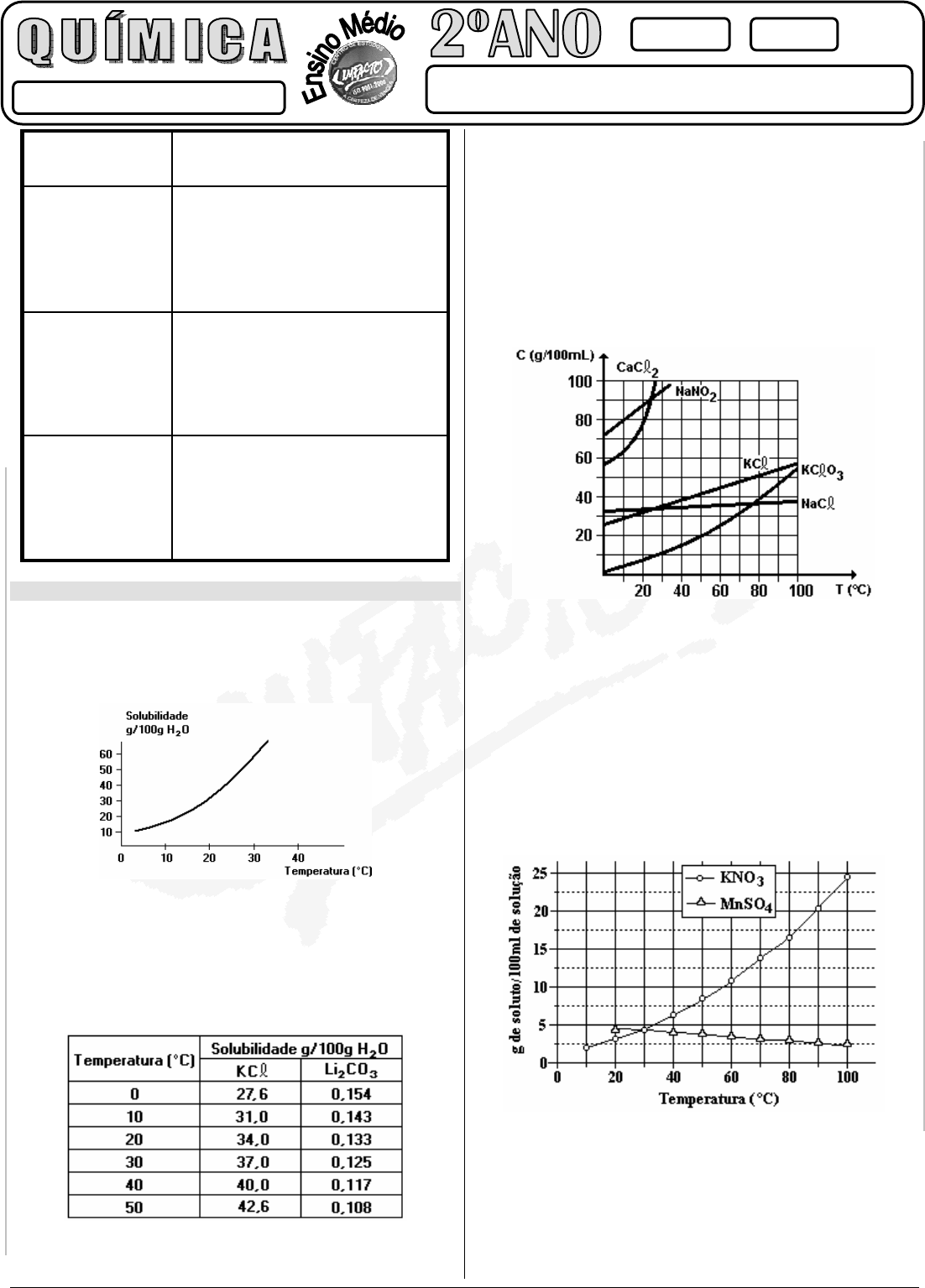 KL 190208 CURVAS DE SOLUBIDADE Frente: 02 Aula: 04 PROFº: THOMAS A Certeza de Vencer FAÇO IMPACTO - A CERTEZA DE VENCER!!! Fa le c on os co w w w .p or ta lim pa ct o. co m .b r EN SI NO M ÉD IO - 20 08 Solução Definição Insaturada Contém uma quantidade de soluto dissolvido inferior ao coeficiente de solubilidade numa determinada temperatura. Saturada Contém uma quantidade de soluto dissolvido igual ao coeficiente de solubilidade numa determinada temperatura. Supersaturada Contém uma quantidade de soluto dissolvido superior ao coeficiente de solubilidade numa determinada temperatura. EXERCÍCIOS PARA OS VENCEDORES 01. A curva de solubilidade de um dado sal é apresentada a seguir. Considerando a solubilidade deste sal a 30°C, qual seria a quantidade máxima (aproximada) de soluto cristalizada quando a temperatura da solução saturada (e em agitação) fosse diminuída para 20°C? a) 10 g b) 15 g c) 20 g d) 30 g 02. A tabela a seguir fornece as solubilidades do KCl e do Li2CO3 a várias temperaturas. Assinale a alternativa falsa: a) a dissolução do KCl em água é endotérmica b) o aquecimento diminui a solubilidade do Li2CO3 em água c) a massa de KCl capaz de saturar 50g de água, a 40°C, é 20g d) a 10°C, a solubilidade do KCl é menor do que a do Li2CO3 e) a 10°C, a solubilidade do KCl é maior do que a do Li2CO3 03. O diagrama representa curvas de solubilidade de alguns sais em água. Com relação ao diagrama anterior, é CORRETO afirmar: a) O NaCl é insolúvel em água. b) A dissolução do KClO3 é exotémica. c) A dissolução do KCl é igual ao do CaCl2. d) O KCl e o NaCl apresentam sempre a mesma solubilidade. e) A 25°C, a solubilidade do CaCl2 e a do NaNO2 são praticamente iguais. 04. O gráfico a seguir mostra as curvas de solubilidade em água, em função da temperatura, dos sais KNO3 e MnSO4. Com base neste gráfico, indique a afirmação correta: a) os dois sais apresentam solubilidade endotérmicas b) os dois sais apresentam solubilidade exotérmicas c) a dissolução do MnSO4 é endotérmica e do KNO3 é exotérmica d) a dissolução do MnSO4 é exotérmica e do KNO3 é endotérmica e) a solubilidade do MnSO4 aumenta com o aumento de temperatura FAÇO IMPACTO - A CERTEZA DE VENCER!!! Fa le c on os co w w w .p or ta lim pa ct o. co m .b r EN SI NO M ÉD IO - 20 08 05. A tabela a seguir fornece os valores de solubilidade do cloreto de sódio e do hidróxido de sódio, em água, a diferentes temperaturas. As informações anteriores e os conhecimentos sobre soluções permitem concluir: a) Soluções são misturas heterogêneas. b) Solução saturada é um mistura heterogênea. c) O hidróxido de sódio é mais solúvel em água que o cloreto de sódio. d) Soluções saturadas apresentam corpo de fundo. e) Soluções insaturadas apresentam corpo de fundo 06. (UFMG) Adicionando-se soluto a um solvente, chega- se a um ponto em que o solvente não mais consegue dissolver o soluto. Neste ponto a solução torna-se: a) Diluída. b) Concentrada. c) Fraca. d) Supersaturada. e) Saturada. 07. (PUC) Uma solução aquosa salina foi cuidadosamente aquecida de forma que se evaporasse parte do solvente. A solução obtida, comparada com a inicial, apresenta-se mais: a) Diluída com maior volume. b) Diluída com menor volume. c) Diluída com igual volume. d) Concentrada com maior volume. e) Concentrada com menor volume. 08. (FUVEST) Quatro tubos contêm 20 mL de água cada um a 20ºC. Coloca-se nesses tubos dicromato de potássio (K2Cr2O7) nas seguintes quantidades: TUBO A TUBO B TUBO C TUBO D K2Cr2O7 1,0 g 3,0 g 5,0 g 7,0 g A solubilidade do sal a 20ºC, é igual a 12,5 g por 100 mL de água. Após agitação, em quais dos tubos coexistem, nessa temperatura, solução saturada e fase sólida? a) em nenhum. b) apenas em D. c) apenas em C e D. d) apenas em B, C e D. e) em todos. 09. Considere o gráfico de solubilidade de vários sais em água, em função da temperatura. Baseando-se no gráfico e nos conhecimentos sobre soluções, é INCORRETO afirmar que: a) a solubilidade do Ce2(SO4)3 diminui com o aumento da temperatura. b) o sal nitrato de sódio é o mais solúvel a 20 °C. c) a massa de 80 g de nitrato de potássio satura 200 g de água a 30 °C. d) dissolvendo-se 60 g de NH4Cl em 100 g de água, a 60 °C obtém-se uma solução insaturada. 10. O gráfico a seguir representa as curvas de solubilidade de várias substâncias. Com relação ao gráfico anterior, assinale a afirmativa INCORRETA: a) KNO3 é mais solúvel do que o Pb(NO3)2 em água, a qualquer temperatura. b) A temperatura pouco afeta a solubilidade do NaCl. c) A substância que apresenta a maior aumento de solubilidade com o aumento de temperatura é o KNO3. d) À temperatura ambiente, a substância menos solúvel é o MgCl2. e) A 40°C, a solubilidade do KCl e a do NaCl são iguais.