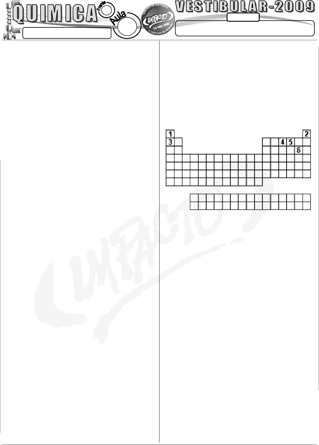 GE010408 EXERCÍCIO FAÇO IMPACTO - A CERTEZA DE VENCER!!! PROFº: PAULO SÁ Fa le c on os co w w w .p or ta lim pa ct o. co m .b r VE ST IB UL AR – 2 00 9 CONTEÚDO A Certeza de Vencer 04 2 01. O número de elementos do terceiro período da tabela periódica é: a) 5 b) 8 c) 16 d) 18 e) 32 02. O número de camadas eletrônicas do átomo de ouro é: a) 3 b) 4 c) 5 d) 6 e) 7 03. Na tabela periódica pertencem aos halogênios: a) Sódio e potássio b) Magnésio e cálcio c) Iodo e bromo d) Nitrogênio e fósforo e) Oxigênio e enxofre 04. Os elementos do grupo 5A apresentam: a) Cinco camadas eletrônicas b) Cinco elétrons de valência c) Número atômico igual a cinco d) Mesmo número de massa e) Mesmo número de nêutrons 05. O grupo de elementos constituídos por ametais é: a) Kr - As - Br - Ga - Cl b) Cs - B - At - C - Si c) O - Ge - Rn - Ni - Eu d) Ra - Sb - V - Cd - Cs e) F - P - S - N - I 06. Analise as colunas a seguir e estabeleça a correta associação entre elas, de acordo com a classificação periódica. I. B II. Ba III. Be IV. Bk V. Br a. Actinídeo b. Alcalino c. Alcalino terroso d. Calcogênio e. Elemento de transição f. Gás nobre g. Halogênio h. Semimetal A associação correta é: a) I - c ; II - b ; III - b ; IV - d ; V - e b) I - h ; II - c ; III - c ; IV - a ; V - g c) I - e ; II - f ; III - f ; IV - h ; V - d d) I - f ; II - c ; III - c ; IV - h ; V - g e) I - h ; II - b ; III - b ; IV - f ; V - h 07. (FUVEST/2003) Um astronauta foi capturado por habitantes de um planeta hostil e aprisionado numa cela, sem seu capacete espacial. Logo começou a sentir falta de ar. Ao mesmo tempo, notou um painel como o da figura em que cada quadrado era uma tecla. Apertou duas delas, voltando a respirar bem. As teclas apertadas foram a) 1 e 2 b) 3 e 4 c) 5 e 6 d) 2 e 3 e) 4 e 5 08. Os átomos ISÓBAROS X e Y pertencem a metal alcalino e alcalino-terroso do mesmo período da classificação periódica. Sabendo-se que X é formado por 37 prótons e 51 nêutrons, pode-se afirmar que os números atômicos e de massa de Y são, respectivamente, a) 36 e 87 b) 38 e 88 c) 37 e 87 d) 39 e 88 e) 38 e 87 09. Considerando-se as propriedades dos elementos químicos e a tabela periódica, é INCORRETA a afirmação: a) Um metal é uma substância que conduz a corrente elétrica, é dúctil e maleável. b) Um não-metal é uma substância que não conduz a corrente elétrica, não é dúctil e nem maleável. c) Um metalóide (ou semi-metal) tem aparência física de um metal, mas tem comportamento químico semelhante ao de um não-metal. d) A maioria dos elementos químicos é constituída de não- metais. e) Os gases nobres são monoatômicos. FAÇO IMPACTO – A CERTEZA DE VENCER!!! Fa le c on os co w w w .p or ta lim pa ct o. co m .b r VE ST IB UL AR – 20 09 10. Imagine que a Tabela Periódica seja o mapa de um continente, e que os elementos químicos constituem as diferentes regiões desse território. A respeito desse "mapa" são feitas as seguintes afirmações: I - Os metais constituem a maior parte do território desse continente. II - As substâncias simples gasosas, não metálicas, são encontradas no nordeste e na costa leste desse continente. III - Percorrendo-se um meridiano (isto é, uma linha reta no sentido norte-sul), atravessam-se regiões cujos elementos químicos apresentam propriedades químicas semelhantes. Dessas afirmações, a) Apenas I é correta. b) Apenas I e II são corretas. c) Apenas I e III são corretas. d) Apenas II e III são corretas. e) I, II e III são corretas. 11. O alumínio que tem número atômico igual a 13: a) Pertence ao grupo 1A da tabela periódica. b) Forma cátion trivalente. c) Tem símbolo Am. d) Pertence à família dos metais alcalino-terrosos. e) É liquido à temperatura ambiente. 12. Das seguintes distribuições eletrônicas, qual é a de um halogênio? a) 1s2, 2s1 b) 1s2, 2s2, 2p3 c) 1s2, 2s2, 2p5 d) 1s2, 2s2, 2p6 e) 1s2, 2s2, 2p6, 3s2, 3p6 13. Seja o átomo neutro X: 1s2 , 2s2, 2p6, 3s2, 3p6, 4s2, 3d10, 4p4. A localização do elemento na tabela periódica é: a) Coluna 6A, 4º Período b) Coluna 3B, 2º Período c) Coluna 4A, 3º Período d) Coluna 4B, 5º Período e) Coluna 3A, 6º Período 14. Os elementos I, II e III têm as seguintes configurações eletrônicas em suas camadas de valência: I: 3s2 3p3 II: 4s2 4p5 III: 3s2 Com base nestas informações, assinale a alternativa "errada". a) O elemento I é um não-metal. b) O elemento II é um halogênio. c) O elemento III é um metal alcalino terroso. d) Os elementos I e III pertencem ao terceiro período da Tabela Periódica. e) Os três elementos pertencem ao mesmo grupo da Tabela Periódica. 15. (UERJ/2002) Uma manifestação comum nas torcidas de futebol é a queima de fogos de artifício coloridos, de acordo com as cores dos times. Fogos com a cor vermelha, por exemplo, contêm um elemento que possui, como mais energético, um subnível s totalmente preenchido. Assim, a torcida do América, para saudar o seu time com um vermelho brilhante, deverá usar fogos contendo o elemento cujo símbolo é: a) Cd b) Co c) K d) Sr 16. Relativamente aos elementos A, B, C e D da tabela a seguir, é correto afirmar que: a) A e B pertencem à mesma família da tabela periódica b) C é metal alcalino terroso. c) A pertence à família dos calcogênios. d) B é mais eletronegativo que A, C e D. e) têm número atômico igual a 2. Baixe as apostilas do Professor Paulo Sá no site: www.quimicafina.com