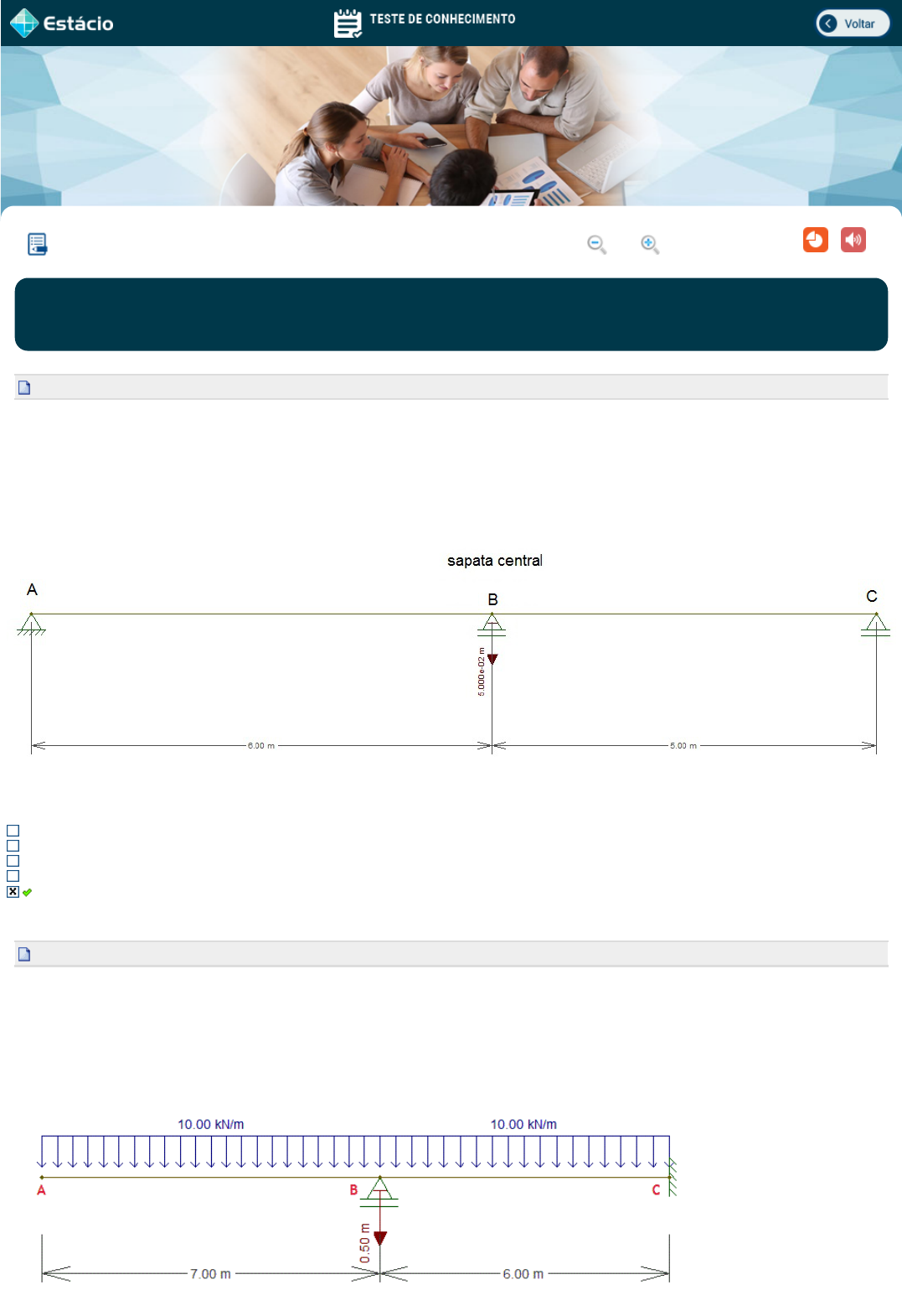 CCE1122_EX_A3_201704062896_V1 TEORIA DAS ESTRUTURAS II 3a aula Lupa PPT MP3 Exercício: CCE1122_EX_A3_201704062896_V1 01/04/2019 (Finaliz.) Aluno(a): ADANS WELBERT DE OLIVEIRA 2019.1 - F Disciplina: CCE1122 - TEORIA DAS ESTRUTURAS II 201704062896 1a Questão A sapata central de uma viga de concreto armado com dois vãos (6m e 5m), apoiada em três sapatas, sofreu um recalque de 5 cm. Considere que o problema foi modelado como representado na figura abaixo, considerando o momento de inércia da seção igual a 0.002 m4 e o módulo de elasticidade de 23000000 kN/m2. Determine o valor do esforço cortante (em módulo) imposto no trecho BC por conta do recalque no apoio central. 230,00kN 84,33 kN 38,33 kN 115,00 kN 46,00 kN 2a Questão Calcular a reação de apoio em C devido ao recalque no apoio B, no valor de 0,5 m vertical para baixo, conforme a figura abaixo. Dados: E = 100000 MPa Seção da viga = 400mm x 800mm (b x h) VC = 11828,10 kN VC = 11528,10 kN VC = 11728,10 kN VC = 11428,10 kN VC = 11628,10 kN Explicação: usar 5 casas decimais 3a Questão A sapata central de uma viga de concreto armado com dois vãos (6m e 5m), apoiada em três sapatas, sofreu um recalque de 5 cm. Considere que o problema foi modelado como representado na figura abaixo, considerando o momento de inércia da seção igual a 0.002 m4 e o módulo de elasticidade de 23000000 kN/m2. Determine o valor do momento fletor no apoio central 115,00 kNm 38,33 kNm 230,00 kNm 84,33 kNm 46,00 kNm 4a Questão Calcular a reação de apoio em VB, devido ao recalque nos apoios abaixo e a temperatura, conforme mostra a figura abaixo. Dados: E = 100000 MPa Seção da viga = 500mm x 800mm (b x h) VB = 9613.87 kN para baixo VB = 9513.87 kN para baixo VB = 9713.87 kN para baixo VB = 9413.87 kN para baixo VB = 9313.87 kN para baixo Explicação: usar 5 casas decimais 5a Questão Calcular o momento fletor no apoio B devido ao recalque no mesmo, no valor de 0,1 m vertical para baixo, conforme a figura abaixo. Dados: E = 100000 MPa Seção da viga = 400mm x 800mm (b x h) MB = 17345,57 kNm MB = 17285,57 kNm MB = 17245,57 kNm MB = 17215,57 kNm MB = 16285,57 kNm Explicação: Usar 5 casas decimais. 6a Questão A sapata extrema direita (apoio C) de uma viga de concreto armado com dois vãos (6m e 5m), apoiada em três sapatas, sofreu um recalque de 5 cm. Considere que o problema foi modelado como representado na figura abaixo, considerando o momento de inércia da seção igual a 0.002 m4 e o módulo de elasticidade de 23000000 kN/m2. Determine o valor do esforço cortante (em módulo) imposto no trecho BC por conta do recalque no apoio C. 46,00 kN 25,09 kN 113,25 kN 20,91 kN 13,45 kN 7a Questão A sapata central de uma viga de concreto armado com dois vãos (6m e 5m), apoiada em três sapatas, sofreu um recalque de 5 cm. Considere que o problema foi modelado como representado na figura abaixo, considerando o momento de inércia da seção igual a 0.002 m4 e o módulo de elasticidade de 23000000 kN/m2. Determine o valor da reação de apoio na sapata que sofreu o recalque. 175,33 kN 84.33 Kn 46,00 kN 230 kN 38,33 kN 8a Questão Calcular a reaçao de apoio no apoio B devido ao recalque no mesmo, no valor de 0,5 m vertical para baixo, conforme a figura abaixo. Dados: E = 100000 MPa Seção da viga = 400mm x 800mm (b x h) VB = 11798,10 kN VB = 11398,10 kN VB = 11598,10 kN VB = 11498,10 kN VB = 11698,10 kN Explicação: Usar 5 casas decimais