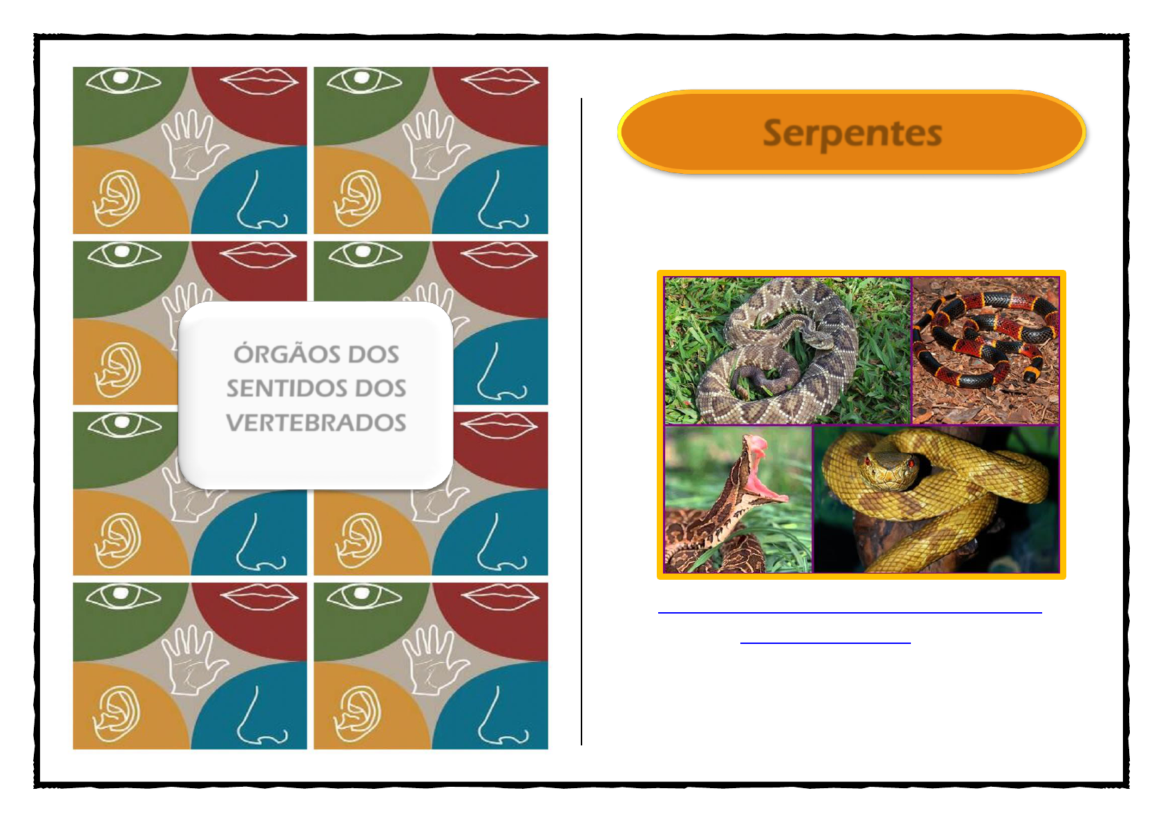 https://www.bioorbis.org/2013/12/serpentes-acidentes- eprimeiros-socorros.html Serpentes ÓRGÃOS DOS SENTIDOS DOS VERTEBRADOS Os répteis (do latim reptilis, que se arrasta) têm o corpo recoberto por uma espessa epiderme de queratina e apresenta pulmões eficientes nas trocas gasosas com o ambiente aéreo, duas características que mostram a adaptação do grupo à vida terrestre. Os representantes mais conhecidos dos répteis são as serpentes, lagartos, jacarés, crocodilos, jabutis e tartarugas. Nesse folheto abordaremos os órgãos dos sentidos das serpentes. Audição: As cobras não tem aberturas de ouvidos, trompas de Eustáquio e não podem captar ondas sonoras pelo ar. No entanto, seu ouvido interno reage a qualquer vibração no chão, detectada pela mandíbula inferior e transmitida pelos ossos. Classificação biológica Reino: Animalia Filo: Chordata Classe: Réptilia Ordem: Squamata Características gerais dos répteis Órgãos dos sentidos das serpentes. Visão da cobra: Em geral os olhos das cobras são ineficientes. São incapazes de focalizar, e a maioria não tem pálpebras móveis, resultando num olhar estático. As cobras ativas diurnas têm pupilas redondas, enquanto as noturnas, como as píton, têm pupilas com aberturas verticais. O olfato da cobra: É o sentido mais importante das cobras. As presas, os predadores e os membros do sexo oposto são identificados pelo aroma que emitem. As partículas de odor do ar são captadas e "saboreadas" pela sua língua bífida, e essa informação é transferida para o cérebro por meio de células especiais do palato. CALOR: As cobra são sensíveis a mudança de temperatura ao seu redor e à radiação infravermelha. Algumas espécies têm um órgão termorreceptor dos dois lados da cabeça, entre os olhos e a narina, o que permite detectar uma presa mesmo no escuro. Também denominado “ofidismo” é o quadro de envenenamento decorrente da inoculação de uma Acidente ofídico peçonha através do aparelho inoculador (presas) de serpentes. No Brasil, as serpentes peçonhentas de interesse em saúde pública pertencem às Famílias Viperidae e Elapidae. Os acidentes estão divididos em quatro tipos: Acidentes botrópicos (acidentes com serpentes dos gêneros Bothrops e Bothrocophias - jararaca, jararacuçu, urutu, caiçaca, comboia); Imagem de uma cobra jararaca Acidentes crotálicos (acidentes com serpentes do gênero Crotalus - cascavel); Acidentes laquéticos (acidentes com serpentes do gênero Lachesis - surucucu-pico-de-jaca); Acidente elapídico (acidentes com serpentes dos gêneros Micrurus e Leptomicrurus - coral- verdadeira). O uso de botas de cano alto ou perneira de couro, botinas e sapatos pode evitar cerca de 80% dos acidentes; Usar luvas de aparas de couro para manipular folhas secas, montes de lixo, lenha, palhas, etc. Como prevenir acidentes Não colocar as mãos em buracos. Cerca de 15% das picadas atingem mãos ou antebraços; Cobras se abrigam em locais quentes, escuros e úmidos. Cuidado ao mexer em pilhas de lenha, palhadas de feijão, milho ou cana. Cuidado ao revirar cupinzeiros; Onde há rato, há cobra. Limpar paióis e terreiros, não deixar lixo acumulado. Fechar buracos de muros e frestas de portas; Evitar acúmulo de lixo ou entulho, de pedras, tijolos, telhas e madeiras, bem como não deixar mato alto ao redor das casas. Isso atrai e serve de abrigo para pequenos animais, que servem de alimentos às serpentes. Lavar o local da picada apenas com água ou com água e sabão; Manter o paciente deitado; Manter o paciente hidratado; Procurar o serviço médico mais próximo; Se possível, levar o animal para identificação. Não fazer torniquete ou garrote; Não cortar o local da picada; Não perfurar ao redor do local da picada; Não colocar folhas, pó de café ou outros contaminantes; Não beber bebidas alcoólicas, querosene ou outros tóxicos. O tratamento é feito com o soro específico para cada tipo de envenenamento. Os soros antiofídicos específicos são o único tratamento eficaz e, quando indicados, devem ser administrados em ambiente hospitalar e sob supervisão médica. O que fazer em caso de acidente O que não fazer em caso de acidente Tratamento UNIP – UNIVERSIDADE PAULISTA PRÁTICA COMO COMPONENTE CURRICULAR CURSO CIÊNCIAS BIOLÓGICAS – DISCIPLINA FISIOLOGIA COMPARADA Referências: Acidentes por animais peçonhentos - Serpentes. (02 de maio de 2017). Acesso em 03 de abril de 2019, disponível em Ministério da Saúde: http://portalms.saude.gov.br/saude-de-a- z/acidentes-por-animais-peconhentos-serpentes (s.d.). Acesso em 03 de abril de 2019, disponível em Google imagens: https://www.google.com/search?q=serpentes&sourc e=lnms&tbm=isch&sa=X&ved=0ahUKEwijtMelm7XhAh USG7kGHWthDhEQ_AUIDigB&biw=1366&bih=625 ÓRGÃOS SENSORIAIS DAS SERPENTES. Acesso em 03 de abril de 2019, disponível em Herpetofauna: http://www.herpetofauna.com.br/Sentidos.htm