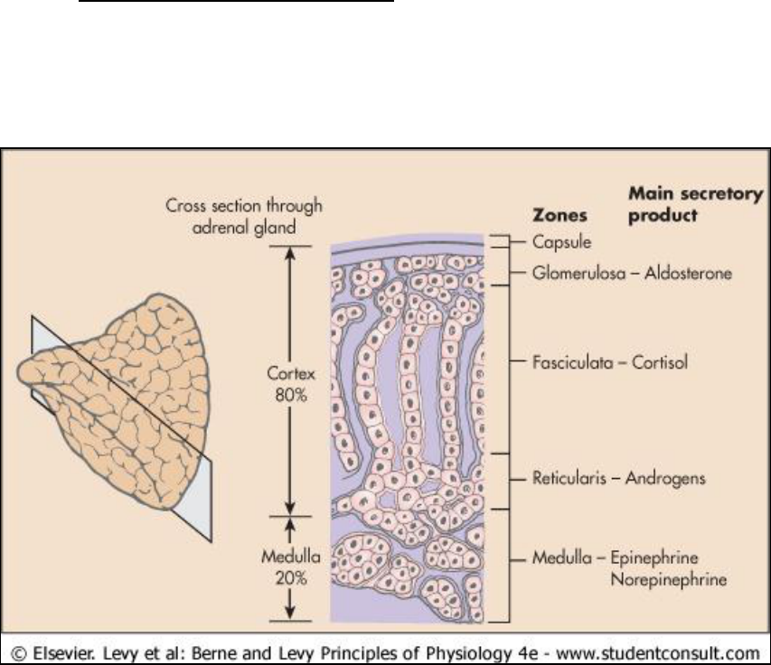 Roteiro da aula sobre Suprarenal (Silverthorn, Costanzo e Berne) 1. Localização da Adrenal, zonas da camada cortical (três: glomerulosa, reticular e fasciculada) 1.1 Zonas glomerulosa (Mineralocorticóide - aldosterona), fasciculada (glicocorticoide – cortisol) e reticulada (androgênios). O córtex supra-renal produz esteróides, um grupo de hormônios produzidos a partir do colesterol, com semelhanças químicas com este composto, embora com funções diferentes. • A zona glomerulosa elabora mineralocorticóides, hormônios que intervêm no metabolismo do sódio e do potássio, minerais muito importantes no equilíbrio dos líquidos no organismo. O principal mineralocorticóide é a aldosterona, um hormônio que atua sobre os rins, estimulando a reabsorção de sódio, de modo que este não seja eliminado com a urina, o que origina uma maior retenção de líquidos no organismo. • A zona fasciculada produz glucocorticóides, um grupo de hormônios cuja função principal consiste em regular o metabolismo dos nutrientes energéticos, ou seja, os lípideos, glícideos e proteínas. O glucocorticóide mais importante é o cortisol. • A zona reticulada elabora androgénios, hormônios que estimulam o desenvolvimento das características sexuais masculinas e o crescimento do tecido muscular. Nas mulheres, estes hormônios apenas são produzidos pelas glândulas suprarrenais. Por outro lado, nos homens, os androgénios são elaborados pelos testículos. Esta diferença na produção de androgénios é determinante para a diferenciação das características sexuais masculinas e femininas. Entre os androgénios fabricados pelo córtex suprarrenal, o mais importante é a deidroepiandrosterona ou DHEA. 2. Transporte dos hormônios (variável, dependendo do tipo do hormônio) Transportadores: albumina, transcortina ou globulina fixadora de cortisol. 3. Síntese de hormônios da adrenal A biossíntese de hormônios esteroides é dependente de colesterol, precursor desses hormônios. Sendo que o colesterol é adquirido na dieta, mas também é produzido pelo organismo através de reações que ocorrem no RE e na mitocôndria e que envolvem o agrupamento de AcetilCoA derivado daoxidação do piruvato e de ácidos graxos na mitocôndria. O colesterol é clivado na mitocôndria para formar Δ5-pregnenolona (a clivagem da cadeia lateral se vale do conjunto enzimático SCC, o qual tem sua concentração aumentada pelo ACTH). Pregnenolona é então convertida em progesterona através da ação de duas enzimas: 3β-ol desidrogenase e Δ4,5-isomerase. Para se chegar aos hormônios corticosteroides são necessárias outras enzimas especificas para cada hormônio. Para se obter aldosterona são necessárias 21- hidroxilase do reticulo endoplasmático (RE) e 11β-hidroxilase e 18-hidroxilase mitocondriais. Já para a síntese de cortisol nas células da zona fasciculada da glândula suprarrenal se requer: 17-hidroxilase e 21-hidroxilase do reticulo e 11β-hidroxilase mitocondrial. Sendo importante ressaltar que as enzimas hidroxilases do RE são enzimas citocromos P450 (CYP). Após a síntese os hormônios esteroides se difundem através da membrana plasmática atingindo a circulação, onde se ligarão a proteínas transportadoras. Os hormônios esteroides tem metabolismo lento por se ligarem a proteínas presentes no plasma sanguíneo; o cortisol, por exemplo, se liga a transcortina sérica. Eles são metabolizados principalmente no fígado onde as reações levam tais compostos a terem sua atividade metabólica reduzida e sua solubilidade em água aumentada facilitando a excreção. São diversos os fatores que alteram o metabolismo dos esteroides no fígado. Ele é aumentado em pacientes com hipertireoidismo e diminuído em pacientes com hipotireoidismo (mau funcionamento da tireoide que está correlacionado a disfunção das adrenais, devido aos efeitos dos hormônios tireoideanos sobre as célular do cortex adrenal). Mas isso não ocorre a esmo, a produção é regulada por participante de uma cascata e por sinais. O sistema de cascata hormonal amplifica sinais específicos, pois a medida que os processos vão se correlacionando as quantidades de hormônios crescem em níveis sucessivos, também devido a tendência de a meia-vida dos hormônios crescer conforme se avança na cascata, assim o hormônio fica mais tempo na corrente sanguínea. Esse processo de sinalização se inicia no cérebro e tem seu fim nas células alvo. Observe um exemplo de cascata. Um estimulo ambiental resulta em um sinal para a estrutura hipocampal do sistema límbico e sinaliza liberação de um hormônio liberador hipotalâmico, hormônio liberador de corticotropina (CRH). Ao atingir a pituitária anterior e se ligar a membrana de células corticotrópicas ele gera uma resposta que leva a liberação de hormônio adrenocorticotropico (ACTH). O ACTH circula e então se liga a células do córtex adrenal, a glândula alvo. Após isso há a síntese de cortisol, hormônio que exercerá diversas atividades no organismo, mas que também irá retroalimentar negativamente a glândula pituitária e o hipotálamo. Sendo que dentro dessa cascata os tempos de meia-vida são crescentes na ordem: CRH, ACTH, cortisol. Além dos fatores já citados a produção de hormônios esteroides também é regulada pela concentração de cAMP (relacionado a mobilização de colesterol para a mitocôndria) e pela proteína StAR (proteína regulatória esteroidogênica aguda) que facilita a translocação de colesterol da membrana mitocondrial externa para a interna. Há ainda regulação pela concentração de Ca 2+ , cujo aumento da concentração leva a ativação de enzimas colesterol desmolase e assim estimula a produção de aldosterona. 4. Secreção de cortisol Ao longo do dia, ocorrem diversas variações no que diz respeito à secreção do cortisol, tendo um pico pouco antes do despertar. Os seus níveis também estão elevados e