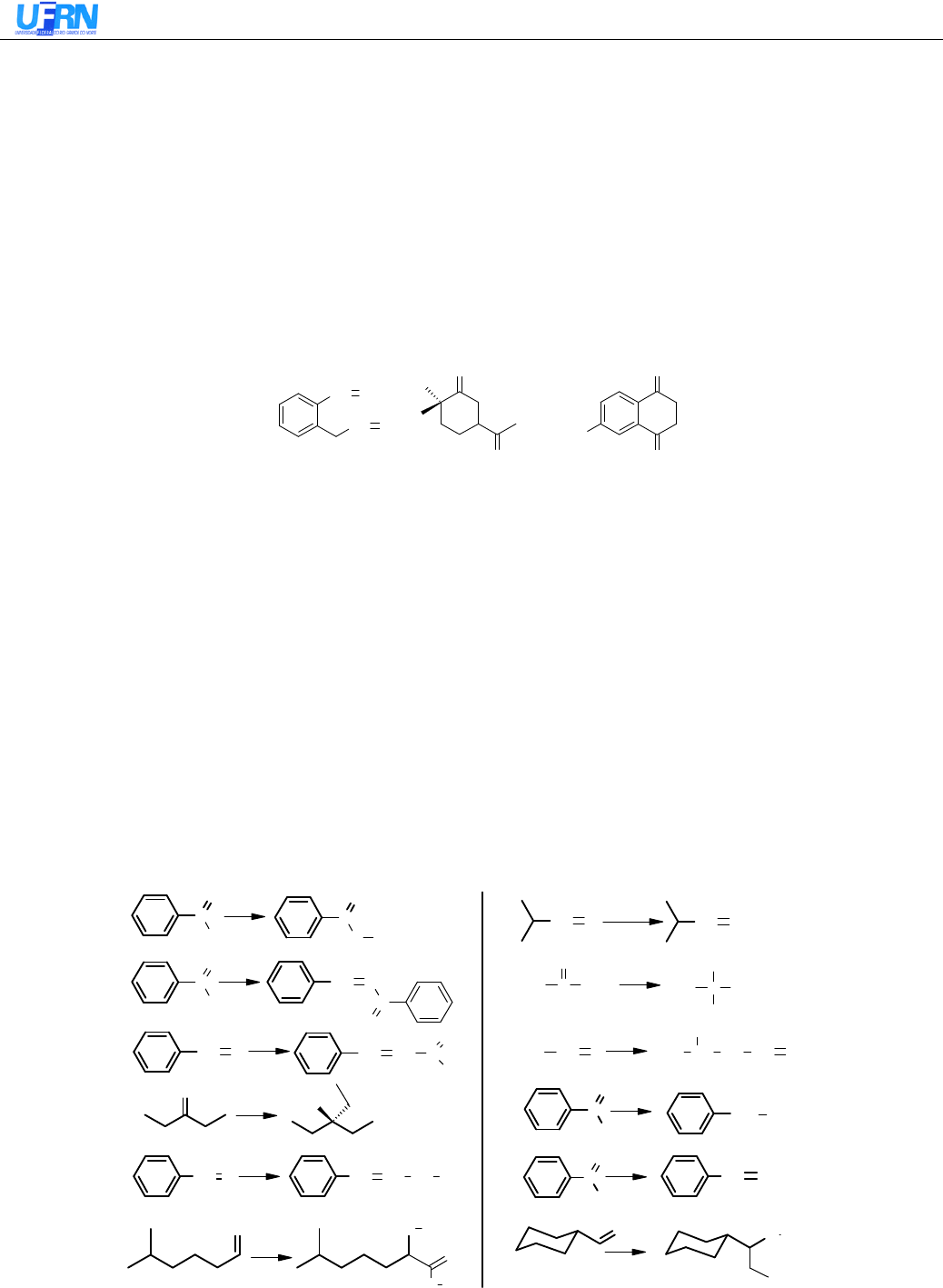 CENTRO DE CIÊNCIAS EXATAS E DA TERRA - DEPARTAMENTO DE QUÍMICA 1 Exercícios de Química Orgânica II Aldeídos e Cetonas Prof. Humberto C O O HCH3 C O H C O C O CHCH CH O CH CH2 CH3 CH O CH2 CH OCHCH3 OH CH3 C O CH3 CH3 C OH CH3 CH3 CH O CH CH C O CH3 O OH CH3 C O CH3CH2 CH3 C O CH2CHCH O CH CH CH2 CH3 O O H O O H O O H NH2 a) b) c) d) e) f) g) h) j)i) k) l) 1- Comente como os efeitos estérico e eletrônico dos substituintes determinam a reatividade dos carbonilados nas reações de adição nucleofilica. Ilustre sua explicação. 2- Explique as ordens de reatividade na adição nucleofílica: a) CH2O > RCHO > R2CO> b) ArCH2COR > R2CO > ArCOR 3- O NaHSO3 reage com RCHO na presença de etanol para dar um aduto sólido. a) escreva uma equação para a reação; b) explique por que somente aldeídos, metilcetonas e cetonas cíclicas reagem; c) se a substância carbonilada pode ser regenerada, ao tratar o aduto com ácido ou base, explique como o método pode ser empregado para isolar e purificar aldeídos em soluções. 4- a) Equacione a adição de apenas um equivalente de HCN a cada um dos três carbonilados abaixo. b) Justifique cada adição. Escreva as formas de ressonância implicadas em sua resposta. CH O CH O O O O O (CH3)2N A) B) C) 5- A formação de oximas e outros derivados da amônia requer um meio ligeiramente ácido para um máximo de velocidade. Em condições básicas ou acentuadamente ácidas a velocidade é reduzida Explique o fato. Escreva as equações com estruturas envolvidas na resposta 6- Escreva as equações das reações, se ocorrerem, do fenil-etanal com: a) reagente de Tollens b) CrO3/H2SO4 c) H2,Ni (1,5 atm, t.a.) d) KMnO4 diluido, a frio e) LiAlH4 f) NaBH4 g) etanol, HCl h) cloreto de isopropilmagnésio, seguidamente por H3O+ i) hidroxilamina 7- Escreva as equações das reações do benzaldeído com: a) NaOH conc. b) formaldeído em excesso, NaOH conc. c) CN - , seguida pH = 7,0 (H+) d) produto de (c) com H30+/ calor e) IMgCH3 seguido de HI/H20 8- Acetaldeído e benzaldeído apresentam comportamentos diferentes na presença de NaOH. Explique a razão e escreva os mecanismos destas reações. 9- Comente a utilidade das reações de carbonilados com hidroxilamina, fenilhidrazina e semicarbazidas. Equacione-as. 10- Sugira métodos para as conversões: id5073703 pdfMachine by Broadgun Software - a great PDF writer! - a great PDF creator! - http://www.pdfmachine.com http://www.broadgun.com CCET DQ - Exercícios de Química Orgânica II Aldeídos e Cetonas Prof. Humberto 2 O O Na c) NaH , THF, aquec. ou d) NaOH , H 0 , aquec.?2 OH CH O 42 b) Zn(Hg) , HCl , tolueno, aquec. a) N H , KOH , etilenoglicol, aquec. O OO OO O O CH C H6 5 e) C H CH = P (C H ) ou f) C H CHO, NaOH ?56 56 53 6 OH OH O Br O O CH2 CH2CH3 A) B) C) D) E) F) G) H) 11- Formule uma reação aldol para sintetizar os seguintes compostos: a) C6H5CH=CHCHO b) (CH3)3CCH(OH)CH2CHO c) 12- Cetonas são oxidadas com perácidos orgânicos à esteres. Explique o curso da reação ilustrando com cetonas assimétricas. 13- Empregando a Pentan-2-ona explique as reações de halogenação de cetonas em meio ácido e em meio básico. 14- Com as respectivas equações, explique como as reações de oxidação podem ser empregadas na diferenciação entre aldeídos e cetonas. 15- Cetonas podem ser alquiladas com halogenetos de alquila na presença de bases fortes, mas aldeídos não. a) Justifique a razão da impossibilidade desta reação para os aldeídos. b) Escreva o mecanismo da reação para a 1-Fenil-etanona empregando t-Butóxido de potássio e, após, ICH3. 16- O oxigênio da carbonila pode ser substituído através de reações reversíveis ou irreversíveis. Apresente um exemplo para cada tipo de reação e o mecanismo. Dica:condensação com aminas, PCl5, Wittig. 17- A partir da lista de reagentes orgânicos a seguir e de quaisquer solventes adicionais ou reagentes inorgânicos necessários, escreva equações mostrando como obter cada um destes produtos: Reagentes: acetona, benzaldeído, 2-metilpropanal, metil iodeto, etil brometo, bromobenzeno. a) 2-fenil-propan-2-ol b) 3-metil-butan-2-ol c) 1-fenil-propan-1-ol d) 1-fenil-2-metil-pentan-1-ol e) ácido 2-metilpropanóico 18- Quais das condições sugeridas para cada uma das transformações seguintes será mais eficiente para provocar a alteração desejada : 19- Como preparar os produtos seguintes a partir da ciclohexanona? CH3CH2CH2CHO CH3CH2CH2CH(OH)CN g) KCN, H2O ou h) HCN, H20? CCET DQ - Exercícios de Química Orgânica II Aldeídos e Cetonas Prof. Humberto 3 O CH O CH3 C CH3 O O CH O CH3 O CH3 NO2 CH2 O + NaOH Base HCl + 3 Ca(OH)2 a) b) c) d) N CH3 CH3 N CH CH3 CH3 C N CH3 OHa) b) c) O Cl Cl O O a) b) c) CH O CH3 O O O CH O CH O N CH3CH3 CH Oa) b) c) d) e) f) 20- Escreva as fórmulas estruturais para os principais produtos das condensações aldólicas a seguir: 21- Indique os reagentes para executar as conversões: C H 2 O H C H O C H 2 O H 22- Proponha reagentes e mecanismos para as obtenções dos produtos: 23- Sugira métodos para as transformações: 24- Os dados a seguir correspondem às constantes de equilíbrio na formação de cianoidrinas pela adição de HCN a carbonilados: k= 211, 110, 32, 2,6, 32 e 0,8. a) relacione estes valores aos carbonilados abaixo; b) argumente suas atribuições. CENTRO DE CIÊNCIAS EXATAS E DA TERRA - DEPARTAMENTO DE QUÍMICA 4 Exercícios de Química Orgânica II Aldeídos e Cetonas Prof. Humberto Problemas suplementares 25- Escreva um mecanismo detalhado para a decomposição base catalisada do hemiacetal CH3CH(OH)OC2H5 e mostre por que esse mecanismo não funciona com o acetal CH3CH(OC2H5)2.. 26- A reação de 1 mol de semicarbazida com uma mistura de 1 mol de ciclohexanona e benzaldeido precipita a ciclohexanona semicarbazona, mas após poucas horas o precipitado é benzaldeído semicarbazona. Explique. 27- Um composto A reage com brometo de metilmagnésio para produzir, após hidrólise, o composto B. 