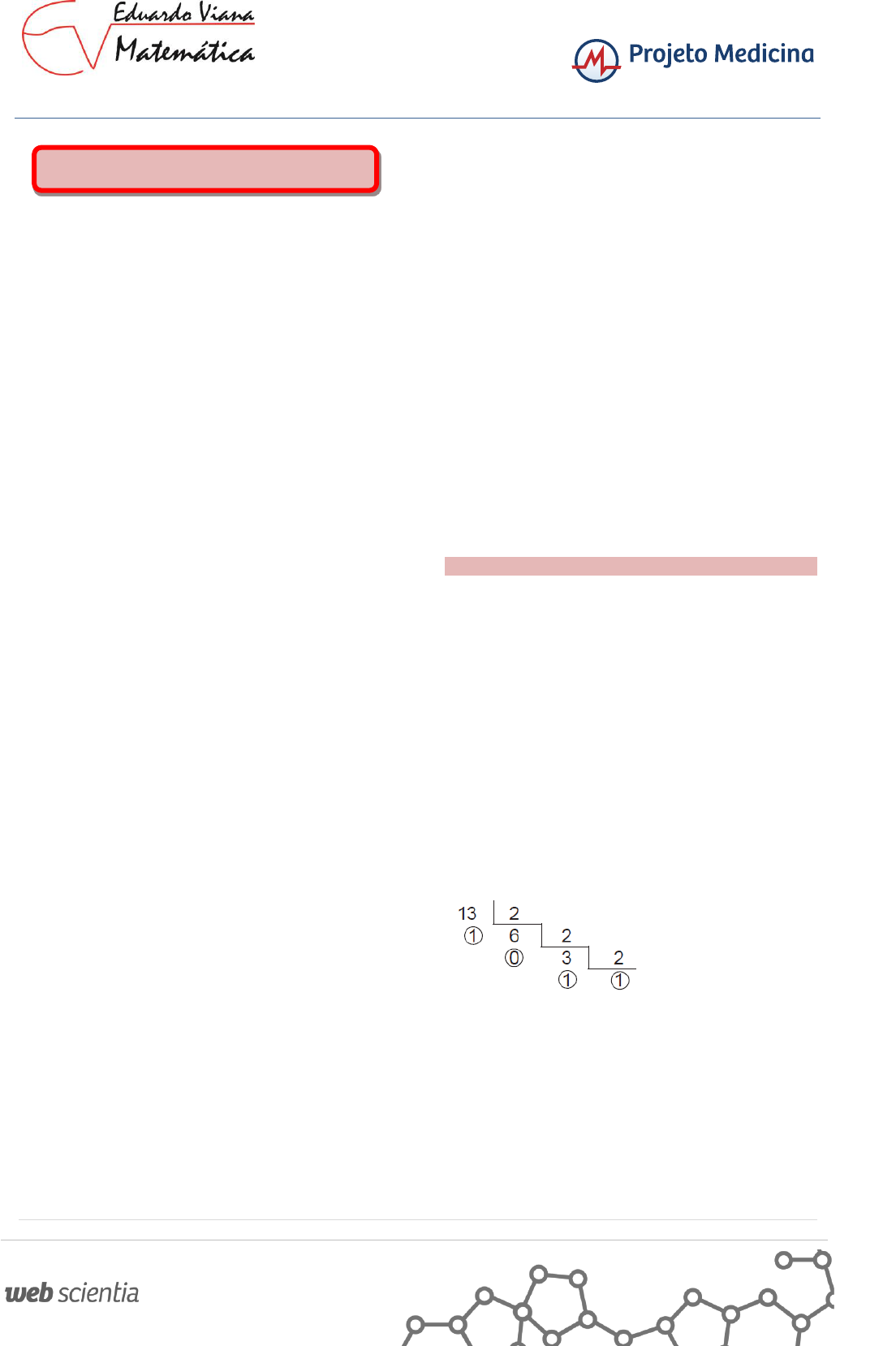 www.fb.com/matematicacomeduardoviana 1 Desde o momento em que o homem necessitou contar quantos elementos uma certa coleção possuía, ele se preocupou em registrar de algum modo essa contagem. Inicialmente usou pedras, cordas, até mesmo pedaços de madeira para fazer esses registros. Com o passar do tempo, percebeu que o uso de símbolos tornava essa tarefa mais fácil. Foram os Hindus os criadores da representação mais útil de todas. Usando dez símbolos, hoje representados por 0, 1, 2, 3, 4, 5, 6, 7, 8 e 9 e algumas regras, inventaram um modo prático e eficiente de representar os números, que usamos até hoje. Os símbolos 0, 1, 2, ..., 9 são chamados algarismos. Chamamos de sistema de numeração a todo conjunto de símbolos e regras que nos possibilita escrever qualquer número. A quantidade de símbolos usados no sistema determina a base do sistema. SISTEMA DE NUMERAÇÃO DECIMAL Como o nome diz, é o sistema de base 10. Utiliza os algarismos 0, 1, 2, 3, 4, 5, 6, 7, 8, 9. Baseia-se na propriedade a seguir: “Se um algarismo está escrito à esquerda de outro, seu valor é 10 vezes mais que esse outro.” Desse modo, no número 352, o algarismo 2 vale 2 unidades, pois não está escrito à esquerda de nenhum outro, o algarismo 5 vale 50 unidades e o 3 vale 300 unidades. Como o valor do algarismo depende da posição que ele ocupa no numeral, dizemos que esse é um sistema posicional. SISTEMAS DE NUMERAÇÃO EM OUTRAS BASES A base de um sistema de numeração não precisa ser necessariamente 10. O fato de usarmos o sistema decimal é uma “fatalidade” anatômica: temos 10 dedos nas mãos. Mas nada impede de usarmos outras bases. Assim, por exemplo, no sistema binário, ou seja, de base 2, usaríamos apenas os algarismos 0 e 1, e a propriedade: ”Se um algarismo está escrito à esquerda de outro, seu valor é 2 vezes mais que esse outro.” Portanto, no sistema binário, no número (111)2, o primeiro 1 representa 1 unidade, o segundo 1 x 2 ou seja 2 unidades e o terceiro 1 representa 1 x 2 x 2 = 4 unidades, representando portanto no sistema decimal o valor 7. De um modo geral, se b é a base do sistema e pqr representa um número desse sistema, temos: (pqr)b = r + q . b + p . b 2 MUDANÇA DE BASE Passar um número da base 10, para uma base qualquer. Regra: Para escrever um número que está no sistema decimal, num outro sistema de base b, efetuamos sucessivas divisões do número dado e dos quocientes obtidos por b, até que se encontre um quociente menor que b. Exemplos: a) Escreva o número 13 na base 2. Solução Resp.: 13 = (1101)2 SISTEMA DE NUMERAÇÃO www.fb.com/matematicacomeduardoviana 2 b) Escreva o número 75 na base 6. Solução: Resp.: 75 = (203)6 Observe que: - Para formar o número, usamos os restos e o último quociente obtido. - A leitura é feita da direita para a esquerda. Passar um número do sistema de base b, para o sistema decimal Regra: Basta decompor o número dado em seus valores relativos. Exemplos: a) Passe para a base 10, o número (1011)2. Solução: (1011)2 = 1 + 1 . 2 + 0 . 2 2 + 1 . 2 3 = 1 + 2 + 0 + 8 = 11 b) Escreva na base 10 o número (314)5. Solução: (314)5 = 4 + 1 . 5 + 3 . 5 2 = 4 + 5 + 75 = 84