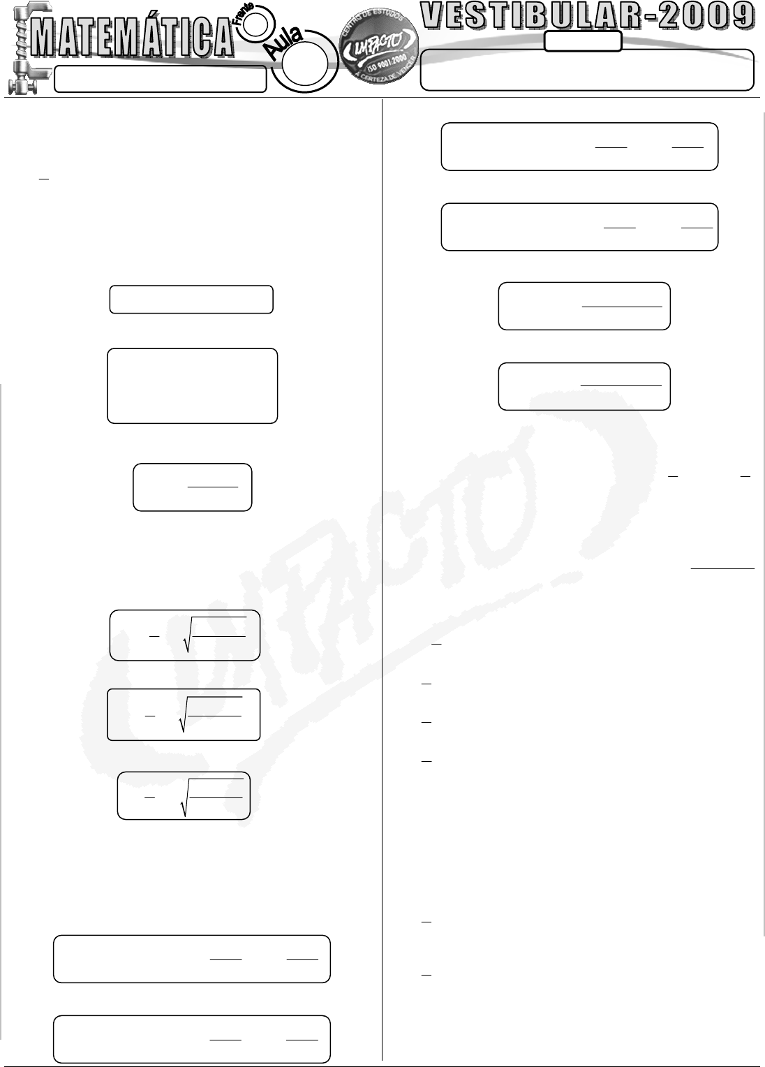 Operações com Arcos 2 (Arcos Duplo e Metade/Transformações) FAÇO IMPACTO - A CERTEZA DE VENCER!!! PROFº: GEORGE CHRIST Fa le c on os co w w w .p or ta lim pa ct o. co m .b r VE ST IB UL AR – 2 00 9 CONTEÚDO A Certeza de Vencer 09 2 1. INTRODUÇÃO. Dados os valores de seno, cosseno e tangente de x é possível obter os valores de seno, cosseno e tangente de 2x e x 2 mediante o uso das fórmulas a seguir. 2. FÓRMULAS DE MULTIPLICAÇÃO. Seja x um arco qualquer. São válidas as seguintes fórmulas: SENO DO DOBRO DE UM ARCO COSSENO DO DOBRO DE UM ARCO TANGENTE DO DOBRO DE UM ARCO 3. FÓRMULAS DE DIVISÃO. Seja x um arco qualquer. São válidas as seguintes fórmulas: SENO METADE DE UM ARCO COSSENO METADE DE UM ARCO TANGENTE METADE DE UM ARCO 4. FÓRMULAS DE TRANSFORMAÇÃO EM PRODUTO. As fórmulas a seguir são utilizadas para transformar somas e subtrações entre senos e cossenos em produtos: SOMA ENTRE SENOS DIFERENÇA ENTRE SENOS SOMA ENTRE COSSENOS DIFERENÇA ENTRE COSSENOS SOMA ENTRE TANGENTES DIFERENÇA ENTRE TANGENTES 5. EXERCÍCIOS (DESTRUIÇÃO TOTAL). 01. (UFF-RJ) Sabendo que 1sen x cos x 3 − = , 0 x 2 π< < , determine sen 2x . 02. (FUVEST) Se tg 2θ = , então o valor de cos 2 1 sen 2 θ + θ é: a) 3− b) 1 3 − c) 1 3 d) 2 3 e) 3 4 03. (U. NOVA IGUAÇU) Se tg x cot g x 7+ = , o valor numérico de E 21 sen 2x= é: a) 6 b) 12 c) 2 7 d) 5 e) 7 5 sen2x 2.sen x.cos x= 2 2. tg xtg2x 1 tg x = − 2 2 2 2 cos 2x cos x sen x cos 2x 1 2.sen x cos 2x 2.cos x 1 = − = − = − x 1 cos xsen 2 2 −= ± x 1 cos xcos 2 2 += ± 1 cos xxtg 2 1 cos x −= ± + p q p qsen p sen q 2.sen .cos 2 2 + −⎛ ⎞ ⎛ ⎞+ = ⎜ ⎟ ⎜ ⎟⎝ ⎠ ⎝ ⎠ p q p qsen p sen q 2.sen .cos 2 2 − +⎛ ⎞ ⎛ ⎞− = ⎜ ⎟ ⎜ ⎟⎝ ⎠ ⎝ ⎠ p q p qcos p cos q 2.cos .cos 2 2 + −⎛ ⎞ ⎛ ⎞+ = ⎜ ⎟ ⎜ ⎟⎝ ⎠ ⎝ ⎠ p q p qcos p cos q 2.sen .sen 2 2 + −⎛ ⎞ ⎛ ⎞− = − ⎜ ⎟ ⎜ ⎟⎝ ⎠ ⎝ ⎠ ( )sen p q tgp tgq cosp . cos q ++ = ( )sen p qtgp tgq cosp . cos q −− = FAÇO IMPACTO – A CERTEZA DE VENCER!!! Fa le c on os co w w w .p or ta lim pa ct o. co m .b r VE ST IB UL AR – 20 09 04. (PUC) A expressão 4 4 2 2cos sen cos senα − α + α − α é idêntica a: a) 2.cos 2α b) 2.sen 2α c) cos 2α d) sen 2α e) cos 2 sen 2α − α 05. (UFRN) Um observador, situado em um ponto P de um prédio vê três pontos, Q, R e S, numa mesma vertical, em um prédio vizinho conforme esquematizado na figura abaixo. P e Q estão num mesmo plano horizontal, R está 6 metros acima de Q, e S está 24 metros acima de Q. Verifica-se que o ângulo α do triângulo QPR é igual ao ângulo β do triângulo RPS. O valor, em metros, que mais se aproxima da distância entre P e Q é: a) 8,5 b) 8,8 c) 9,4 d) 10,2 06. (PUC) cos x cos y+ é igual a: a) x y x y2.sen .sen 2 2 + −⎛ ⎞ ⎛ ⎞⎜ ⎟ ⎜ ⎟⎝ ⎠ ⎝ ⎠ b) x y x y2.cos .sen 2 2 + −⎛ ⎞ ⎛ ⎞⎜ ⎟ ⎜ ⎟⎝ ⎠ ⎝ ⎠ c) x y x y2.cos .cos 2 2 + −⎛ ⎞ ⎛ ⎞⎜ ⎟ ⎜ ⎟⎝ ⎠ ⎝ ⎠ d) x y x y2.cos .sen 2 2 − +⎛ ⎞ ⎛ ⎞⎜ ⎟ ⎜ ⎟⎝ ⎠ ⎝ ⎠ e) x y x y2.cos .sen 2 2 + +⎛ ⎞ ⎛ ⎞− ⎜ ⎟ ⎜ ⎟⎝ ⎠ ⎝ ⎠ 07. (CESCEM) Sendo θ um arco do 4º quadrante e 1cos 5 θ = , o valor do cos 2θ é: a) 23 25 − b) 22 25 − c) 21 25 − d) 22 25 e) 23 25 08. (MACK) Simplificando a expressão y cos 80º cos40º cos 20º= + − , obtém-se: a) sen 20º b) 1 c) 1− d) 0 e) 1 2 GABARITO 01 8 9 02 B 03 A 04 A 05 A 06 C 07 A 08 D P Q R S β α