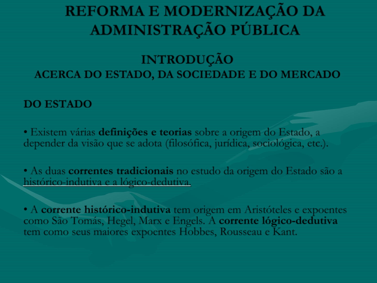 REFORMA E MODERNIZAÇÃO DA ADMINISTRAÇÃO PÚBLICA DO ESTADO • Existem várias definições e teorias sobre a origem do Estado, a depender da visão que se adota (filosófica, jurídica, sociológica, etc.). • As duas correntes tradicionais no estudo da origem do Estado são a histórico-indutiva e a lógico-dedutiva. • A corrente histórico-indutiva tem origem em Aristóteles e expoentes como São Tomás, Hegel, Marx e Engels. A corrente lógico-dedutiva tem como seus maiores expoentes Hobbes, Rousseau e Kant. INTRODUÇÃO ACERCA DO ESTADO, DA SOCIEDADE E DO MERCADO UNIPLAN Professor Sidney Amorim REFORMA E MODERNIZAÇÃO DA ADMINISTRAÇÃO PÚBLICA • Para os históricos, o Estado surge a partir da dissolução de tribos e clãs, ou seja, de comunidades primitivas, e isso em virtude da divisão da sociedade em classes. Isso é observado entre os gregos, entre os germanos, e até mesmo nas sociedades asiáticas. Neste sentido, o Estado é um produto da sociedade que chega a certo grau de desenvolvimento em virtude de sua complexificação. O seu movimento é intrínseco, ou seja, surge de dentro para fora. • Na corrente Lógico-dedutiva, o Estado surge como uma necessidade e uma conseqüência lógica de impor uma boa dose de ordem na sociedade que se avoluma. É preciso que haja um contrato social, no qual o indivíduo abre mão de parte de sua liberdade para o Estado, que irá garantir a propriedade e a execução dos contratos. O seu movimento é extrínseco, ou seja, surge de fora para dentro. • Percebe-se que estas duas correntes não são diametralmente antagônicas, mas sim complementares, possuindo inclusive muitos pontos em comum. INTRODUÇÃO ACERCA DO ESTADO, DA SOCIEDADE E DO MERCADO UNIPLAN Professor Sidney Amorim REFORMA E MODERNIZAÇÃO DA ADMINISTRAÇÃO PÚBLICA • Neste sentido, pode-se afirmar que o Estado é um poder organizado, que reúne uma estrutura organizacional e política, fruto de um contrato social ou de um pacto político, que garante legitimidade ao governo, à propriedade e aos contratos. • Os elementos que constituem um Estado são o governo, a burocracia e a milícia. O governo é formado por integrantes da elite política, oriundas da classe dominante. A burocracia é o corpo de agentes públicos que se ocupa da administração. A milícia é a força militar e policial que se incumbe de defender o Estado de inimigos externos e garantir, no plano interno, a obediência às leis e à ordem instituída. • Esses três elementos – governo, burocracia e milícia – formam o que é chamado de Aparelho do Estado. INTRODUÇÃO ACERCA DO ESTADO, DA SOCIEDADE E DO MERCADO UNIPLAN Professor Sidney Amorim REFORMA E MODERNIZAÇÃO DA ADMINISTRAÇÃO PÚBLICA • Adicionalmente, o Estado é constituído por um Ordenamento Jurídico impositivo, que extravasa o Aparelho Estatal e se exerce sobre toda a sociedade – é o chamado Poder Extroverso do Estado. Esse poder do Estado é extroverso pois não se resume a alcançar só o Estado, mas sim a toda a sociedade que o compõe. Essa é a principal diferença entre o Estado e qualquer outra espécie de organização • O Ordenamento Jurídico é todo um sistema constitucional e legal que permite ao Estado regular as atividades e os comportamentos da população existente dentro do território sob sua jurisdição. • Juridicamente, entre os elementos formadores do Estado se encontram o território e a população. Certamente que o poder do Estado é exercido sobre determinada área geográfica de atuação e sobre determinado grupo de pessoas que naquele lugar residem. Neste sentido é que se costuma usar o vocábulo país – uma entidade política soberana, constituída por uma população, que habita certo território. INTRODUÇÃO ACERCA DO ESTADO, DA SOCIEDADE E DO MERCADO UNIPLAN Professor Sidney Amorim REFORMA E MODERNIZAÇÃO DA ADMINISTRAÇÃO PÚBLICA • O fato do Estado ser constituído por um governo que é, na verdade, a classe dominante, não significa que o Estado esteja somente a serviço desta elite. A complexidade social faz surgir novos estratos sociais que não apenas as antigas distinções de classes, como por exemplo os movimentos étnicos, raciais, religiosos e culturais, que atualmente possuem condições de ascender ao poder e tornarem-se a classe dominante. • Neste sentido, o Estado moderno deixou de simplesmente refletir os interesses dos poderosos, da classe dominante, para ser o espelho dos interesses de outros estratos sociais que surgiram dentro desta complexa rede social. INTRODUÇÃO ACERCA DO ESTADO, DA SOCIEDADE E DO MERCADO UNIPLAN Professor Sidney Amorim REFORMA E MODERNIZAÇÃO DA ADMINISTRAÇÃO PÚBLICA DA SOCIEDADE •A sociedade civil é povo organizado de acordo com os diferentes grupos sociais nos quais estão, de alguma forma, inseridos. São as instituições, as associações e outras espécies de grupos sociais, como a família, a escola, a igreja, a empresa, o sindicato, a imprensa, etc. Engloba, portanto, todas as relações que estão à margem do Estado mas exercem algum tipo de influência sobre ele. • Não se pode confundir, portanto, a sociedade civil com a população ou com o povo de um Estado. O povo é um conjunto de cidadãos com os mesmos direitos e a sociedade civil é formada por esses mesmos cidadãos, agora organizados e classificados segundo os grupos a que pertencem. INTRODUÇÃO ACERCA DO ESTADO, DA SOCIEDADE E DO MERCADO UNIPLAN Professor Sidney Amorim REFORMA E MODERNIZAÇÃO DA ADMINISTRAÇÃO PÚBLICA • O Estado, formalmente, é quem exerce o poder sobre a sociedade civil, mas a sociedade civil possui um poder difuso, mas real, sobre o Estado, e isso através das empresas, dos sindicatos, das igrejas, da mídia, etc. • Portanto, o Estado e a sociedade civil são dois sistemas de poder que se interpenetram e se interrelacionam, e precisam aprender a coexistirem-se. • Nas sociedades modernas, a ponte formal entre a 