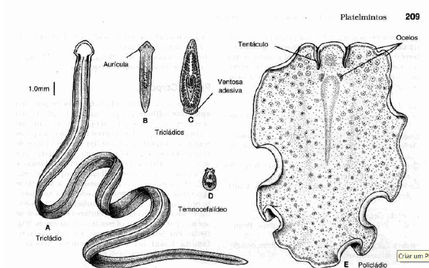ZOOLOGIA DE INVERTEBRADOS PLATYHELMINTES Vermes aquáticos pequenos, e de corpo mole que se movem sobre e entre as rochas, partículas de sedimentos, detritos, algas e no tecido de suas presas. Eles incluem vermes de chato de vida livre, vermes parasitas e solitárias. Todos eles são acelomados, não possuem sistema hemal, nem cutícula, e em táxons parasitas, epiderme e algumas vezes, tratos digestivos. Gradualmente, os platelmintos fazem uma introdução evolutiva a vermes de vida livre, a vermes parasitas e solitárias. A maioria dos Platelmintos possuem dimensões milimétricas, os permitindo a viver em lugares apertados, em cavidades e entre tecidos. Platelmintos não possuem sistema circulatório- sistema hemal e o celoma estão ausentes- limitando os animais a difusão, dessa forma, distâncias entre origem e destinos devem ser curtas. Turbellaria Todos os macroturbelários(visíveis) e na casa dos centímetros, são achatados e finos, e em geral quanto maior o verme e mais achatado ele é. Porém, na maioria das 4500 espécies, a maioria é de animais microscópicos. Esses embora possam ser chatos, a maioria tende a ser cilíndrica ou curvada acima e a chatos abaixo, formando uma sola rastejadora. Os turbelários são na maioria aquáticos e marinhos. Vivendo sobre areia ou lodo, rochas e conchas ou vivem sobre algas. Os turbelários de água doce são habitantes de bentos dos lagos, poças e riachos. Os terrestres são confinados á áreas úmidas, pedaços de tronco e folhas, esses são espécies tropicais grandes. Macroturbelários Microturbelários Parede do corpo A parede do corpo dos turbelários é coberto por uma epiderme unilaminar e ciliada. Microvilosidades curtas cobrem as superfícies epidérmicas entre os cílios, entretanto, eles não possuem cutícula. Abaixo da epiderme está a lâmina basal. Os turbelários utilizam a lâmina basal e as fibras extracelulares para sustentar o corpo. O esqueleto mais comum é uma camada em forma de teias de fibras de actina dentro da própria epiderme. Algumas espécies marinhas podem apresentar espículas calcárias. Em outras espécies, o trato digestivo também possui função esquelética. Os turbelários possuem uma epiderme bastante glandular, pode acontecer das células glandulares estarem submersas e apenas o ducto penetrar na epiderme. Essas glandulas podem apresentar substâncias adesivas, muco entre outras. Sincício: pré condição para vida parasitária, promove uma barreira seletiva impedindo que anticorpos atravessem a mesma. Não possuem junções intercelulares. Rabdóides são numerosas secreções em forma de bastões confinadas a uma membrana, na qual eles se expandem para formar o muco. O rabdito é o tipo mais comum, caracterizado por uma lâmina celular específica. F: deslizamento, casulos e impedimento de ressecamento. A adesão temporária ao substrato torna-se possível pelas glândulas adesivas, cílios adesivos ou ventosas musculares. Muitas espécies aderem aos grãos de areia com orgãos adesivos glandulares conhecidos como orgãos duogolandulares, compostos por uma glândula viscosa que secreta o adesivo e cimenta o animal no grão de areia e uma glândula liberação que secreta um antiadesivo, a substância que quebra a fixação. As glândulas passam por uma célula de fixação considerada célula âncora epidérmica, especializada em suporte/fixação. Musculatura e locomoção Como são animais pequenos sem apêndices, eles se utilizam muito seus cílios para se deslocar pelas superfícies. Porém, muitos turbelários apresentam musculatura bem desenvolvida e complexas, permitindo uma variedade de movimentos. A musculatura consiste em um arranjo em forma de grade de fibras musculares externas e longitudinais internas. Entre essas duas camadas, muitas espécies também possuem dois conjuntos de músculos diagonais que se cruzam. Espécies grandes possuem músculos dorsiventrais e camadas adicionais de músculos circulares e longitudinais. Locomoção por deslizamento ciliar sobre superfícies e através da água ao movimento rastejante e natação muscular. Outros comportamentos corporais incluem retração e extensão, peristalse curvamento, ondulação e cambalhotas. Sistema nervoso e órgãos dos sentidos Em geral, o sistema nervoso consiste em um cérebro circular subepidérmico do qual um, ou muitos cordões nervosos estendem-se através do corpo. Os cordões longitudinais nervosos se juntam a uma rede nervosa localizada internamente a parede do corpo. Essa rede submuscular e junta outras duas redes mais periféricas- uma entre a epiderme e a musculatura e outra dentro da epiderme. O sistema nervoso como um todo, é difuso, na forma de rede. Muitos turbelários abandonaram o cérebro circular e cordões nervosos múltiplos e adquiriram um cérebro concentrado bilateral e dois cordões longitudinais ventrolaterais. Esse sistema nervoso altamente organizado sugere um nível de ordem hierárquica e controle que não estão presentes em sistemas de rede. Ocelos na forma de taças pigmentares são comuns na maioria dos turbelários. Em macroturbelários, incluindo as planárias terrestres, muitos ocelos podem estar presentes em grupos sobre o cérebro, em tentáculos, ou distribuídos uniformemente ao redor da margem do corpo. Os ocelos funcionam em particular na orientação luminosa e a maioria dos turbelários, é fototaticamente negativa. Além de ocelos, estatocistos são os mais conspícuos órgãos sensoriais dos turbelários. Os estatocistos são os mais conspícuos órgãos sensoriais dos turbelários, esses são ímpares e localizados medianamente perto do cérebro, acredita-se que os estatocistos são receptores de gravidade, sendo o mecanismo de recepção desconhecido. Receptores ciliares com uma única célula, são provavelmente mecanorreceptores estão distribuídos sobre todo o corpo, porém mais concentrados nos tentáculos e aurículas e margem do corpo. Cavidades e sulcos