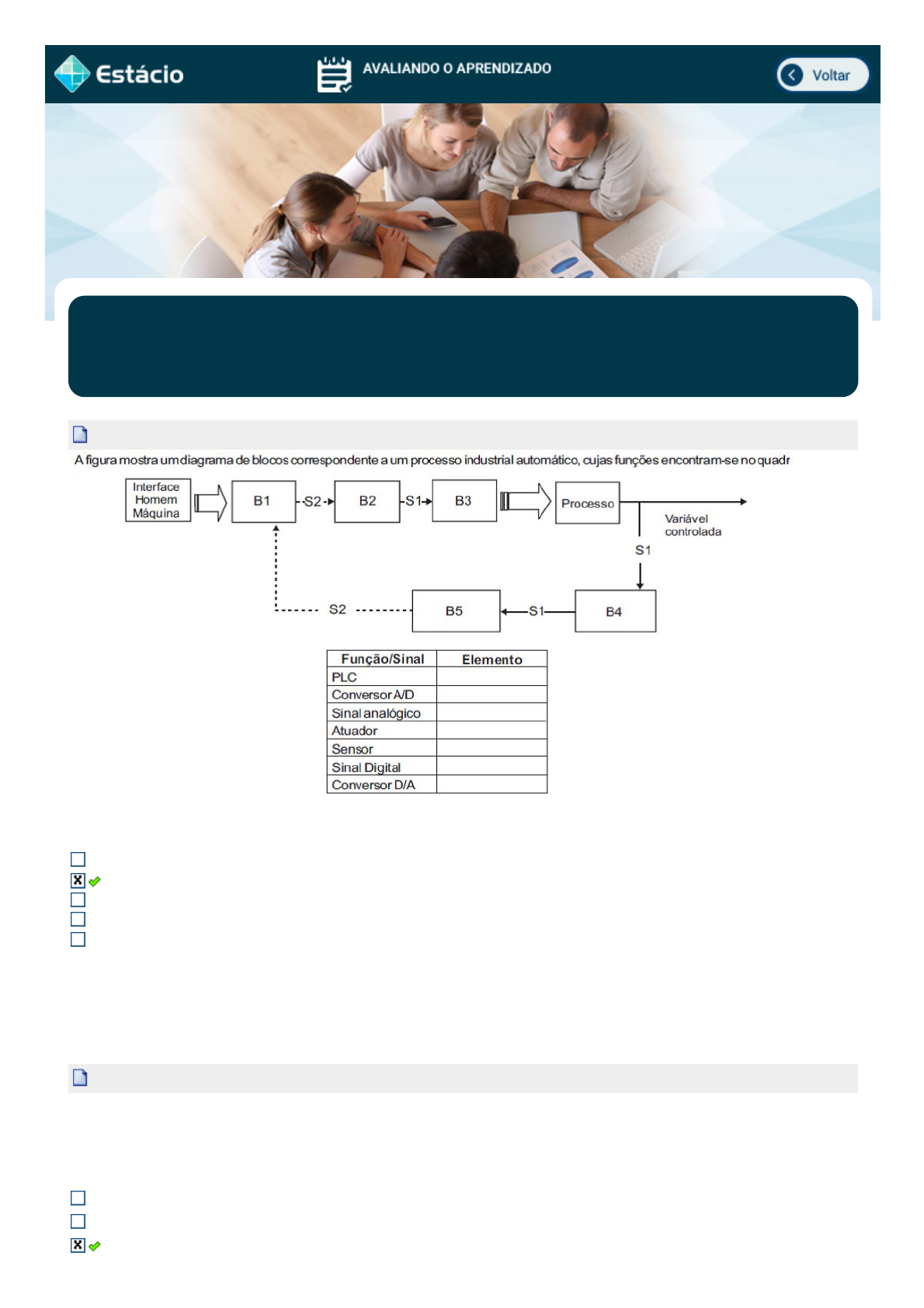 17/05/2019 EPS simulado.estacio.br/alunos/ 1/3 CCE0105_201512220647 V.1 Disc.: AUTOMAÇÃO DE PROCESSOS E ROBÓTICA Aluno(a): ANTONIO AUIRES OLIVEIRA COUTINHO Matrícula: 201512220647 Acertos: 0,5 de 0,5 Início: 25/05/2019 (Finaliz.) 1a Questão (Ref.:201513070089) Pontos: 0,1 / 0,1 A sequência correta, de cima para baixo, que preenche a coluna da direita do quadro, associando o elemento à sua respectiva função, é? B1 - B2 - S2 - B3 - B4 - S1 - B5 B1 - B5 - S1 - B3 - B4 - S2 - B2 B1 - B5 - S2 - B3 - B4 - S1 - B2 B2 - B5 - S1 - B3 - B4 - S2 - B1 B3 - B5 - S1 - B1 - B4 - S2 - B2 Respondido em 25/05/2019 23:05:17 Compare com a sua resposta: 2a Questão (Ref.:201512391623) Pontos: 0,1 / 0,1 A cinemática é a análise do movimento de um corpo sem considerar as causas deste movimento. Em particular a cinemática de um manipulador diz respeito à descrição do movimento do manipulador com respeito a um sistema de coordenadas. Qual é a única alternativa correta para designar este sistema de coordenadas? Sistema de coordenadas cilíndricas. Sistema de coordenadas avançadas fixas. Sistema de coordenadas cartesianas fixas. 17/05/2019 EPS simulado.estacio.br/alunos/ 2/3 Sistema de coordenadas polares. Sistema de coordenadas storm-liouville fixas. Respondido em 25/05/2019 23:09:50 Compare com a sua resposta: 3a Questão (Ref.:201513071396) Pontos: 0,1 / 0,1 No que diz respeito aos controladores lógicos programáveis (CLPs), são feitas as seguintes afirmações: I. Os CLPs foram desenvolvidos a partir das necessidades da indústria automobilística, com o objetivo de substituir os painéis de controle a relés. II. O CLP é capaz de realizar somente operações lógicas e aritméticas. III. O tempo de varredura (scan time) compreende o tempo necessário para a CPU realizar todas as tarefas, desde o início até o término do ciclo de execução do CLP. IV. As Unidades Centrais de Processamento apresentam dois modos de operação: programação e execução. V. Os principais blocos que compõem um CLP são: Unidade Central de Processamento, Módulos de Entrada/Saída, Fonte de Alimentação. Dentre as afirmações acima, pode-se dizer que: Apenas a afirmação I está correta. Apenas as afirmações I e III estão corretas. Apenas a afirmação III está correta. Apenas as afirmações I, III, IV e V estão corretas. Estão corretas as afirmações I, IV e V. Respondido em 25/05/2019 23:13:24 Compare com a sua resposta: 4a Questão (Ref.:201513070097) Pontos: 0,1 / 0,1 A arquitetura do CLP está constituída basicamente de: Memórias PROM e EPROM, cartão de comunicação, monitor e CPU. TODAS AS ANTERIORES Monitor, dispositivo de impressão, memórias e CPU Fonte de tensão, motor, unidades de armazenamento e teclado. Fonte alimentação, CPU, dispositivos I/O, memórias e terminal de programação. Respondido em 25/05/2019 23:13:54 Compare com a sua resposta: 5a Questão (Ref.:201512391389) Pontos: 0,1 / 0,1 Examine as proposições a seguir. I. Os encoders de posição podem ser agrupados em duas categorias: encoders incrementais, que detectam variações na rotação a partir de uma posição dada, e encoders absolutos, que fornecem a posição angular real. II. Pode-se escolher entre um encoder incremental e um absoluto para a medição de um deslocamento linear. A diferença principal entre os resultados que podem ser obtidos é que o incremental tem ângulo a partir de uma referência, e o absoluto, é a identificação única de um ângulo. III. Os sensores de proximidade indutivos são capazes de detectar qualquer tipo de material a uma distância que oscila entre 0 e 2 mm, dependendo, também, do tamanho do material a ser detectado e das características especificadas pelos diferentes fabricantes. IV. Um sensor é um elemento que produz um sinal relacionado a uma grandeza medida. Um transdutor é um elemento que, quando submetido a alguma alteração física, apresenta uma variação relacionada. Portanto, os sensores são transdutores. Estão corretas, apenas: I e IV. 17/05/2019 EPS simulado.estacio.br/alunos/ 3/3 III e IV. II e IV. II, III e IV. I e II. Respondido em 25/05/2019 23:16:27 Compare com a sua resposta: