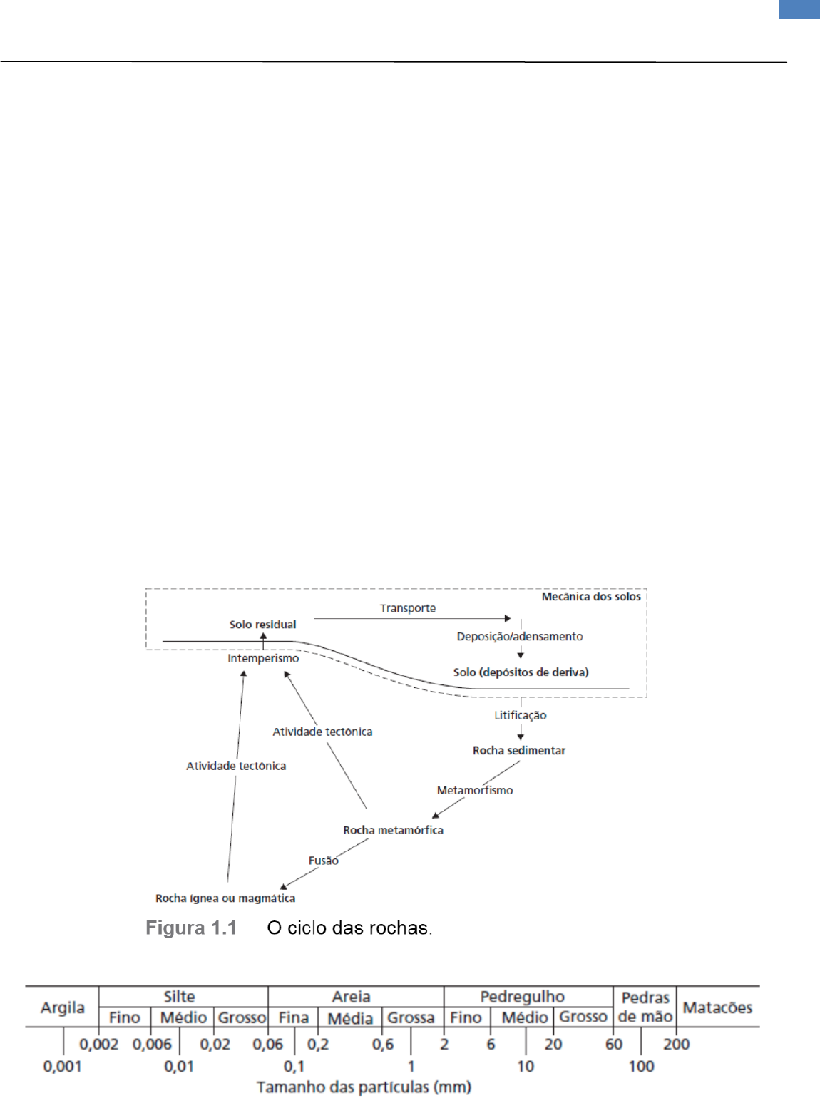 1 MECÂNICA DOS SOLOS CARACTERÍSTICAS BÁSICAS DOS SOLOS CAP 1- CARACTERÍSTICAS BÁSICAS DOS SOLOS FONTE:CRAIG, MECÂNICA DOS SOLOS. 1.1 A origem dos solos Para o engenheiro civil, solo é qualquer reunião de partículas minerais soltas ou fracamente unidas (cimentadas), formada pela decomposição de rochas como parte do ciclo delas (Figura 1.1), sendo o espaço vazio entre as partículas ocupado por água e/ou ar. As ligações fracas podem ser causadas por carbonatos ou óxidos precipitados entre as partículas ou por matéria orgânica. A deposição e a compressão subsequentes dos solos, combinadas com a cimentação entre as partículas, os transformam em rochas sedimentares (um processo conhecido como litificação). Se os produtos da exposição ao tempo permanecerem no local original, eles constituirão um solo residual. Se forem transportados e depositados em um local diferente, constituirão um solo transportado, sendo a gravidade, o vento, a água e as geleiras seus agentes de transporte. Durante o deslocamento, o tamanho e a forma das partículas podem sofrer modificações, e estas podem ser classificadas em intervalos específicos de tamanho. Os tamanhos das partículas de solo podem variar desde mais de 100 mm até menos de 0,001 mm. No Reino Unido, os intervalos de tamanhos são descritos de acordo com a Figura 1.2. Nela, os termos ―argila‖, ―silte‖ etc. são usados apenas para descrever o tamanho das partículas entre os limites especificados. No entanto, eles também descrevem tipos particulares de solos, classificados de acordo com seu comportamento mecânico (ver Seção 1.5). Figura 1.2: Intervalos de valores dos tamanhos de partículas. 2 MECÂNICA DOS SOLOS CARACTERÍSTICAS BÁSICAS DOS SOLOS O tipo de transporte e a deposição subsequente de partículas de solo têm uma forte influência sobre a distribuição do tamanho das partículas em um determinado local. A Figura 1.3 mostra alguns regimes comuns de deposição. Em épocas glaciais, o material do solo é erodido da rocha subjacente pela ação do atrito e do congelamento/descongelamento das geleiras. O material, que normalmente apresenta partículas de tamanhos variados, desde aquelas com o tamanho de argila até as que têm o tamanho de pedregulhos, é transportado ao longo da base da geleira e depositado quando o gelo se derrete; o material resultante é conhecido como tilito (glacial). Material similar também é depositado como uma morena (ou moraina) terminal na borda da geleira. Quando esta se derrete, a morena é transportada nas águas do degelo (outwash); é mais fácil para as partículas menores e mais leves serem transportadas em suspensão, levando a uma gradação no tamanho das partículas de acordo com a distância até a geleira, conforme mostra a Figura 1.3a. Em climas de temperaturas mais quentes, o principal meio de transporte é a água (isto é, rios e mares), conforme mostra a Figura 1.3b. O material depositado é conhecido como aluvião, e sua composição depende da velocidade do fluxo de água. Rios com fluxos mais rápidos podem transportar partículas maiores em suspensão, resultando na aluvião, que é uma mistura de partículas com tamanho de areia e cascalho, ao passo que a água com fluxo mais lento tenderá a transportar apenas partículas menores. Nos locais de estuários, onde os rios se encontram com o mar, o material pode ser depositado como uma plataforma ou um delta. Em ambientes áridos (deserto; Figura 1.3c), o vento é o agente de transporte principal, erodindo os afloramentos de rochas e formando um pedimento (o solo do deserto) de sedimentos finos levados pelo vento (loess ou loesse). Ao longo da costa, também pode ser formada uma praia de lagos temporários evaporados, deixando depósitos de sal. As grandes diferenças de temperatura entre a noite e o dia causam intemperismo térmico adicional dos afloramentos de rocha, produzindo seixos. Esses processos de superfície, geologicamente muito recentes, são conhecidos como depósitos de deriva (drift) em mapas geológicos. O solo que sofreu compressão/consolidação significativa após sua deposição é normalmente muito mais velho e é conhecido como maciço, junto a rochas, em mapas geológicos. As proporções relativas das partículas de diferentes tamanhos em um solo são descritas como sua distribuição do tamanho de partículas (DTP, distribuição granulométrica ou ainda PSD, para o termo em inglês particle size distribution), e as curvas típicas para os materiais em diferentes ambientes de depósitos são mostrados na Figura 1.4. O método de determinação da DTP de um depósito e seu uso subsequente na classificação do solo são descritos nas Seções 1.4 e 1.5. Em um determinado local, os materiais da subsuperfície serão uma mistura de rochas e solos, remontando a centenas de milhões de anos em tempo geológico. Em consequência, é importante conhecer a história geológica de uma área para entender as características prováveis dos depósitos que estarão presentes na superfície, uma vez que o regime de deposição pode ter mudado significativamente ao longo do tempo geológico. 3 MECÂNICA DOS SOLOS CARACTERÍSTICAS BÁSICAS DOS SOLOS Para citar um exemplo, a região de West Midlands, no Reino Unido, era deltaica no período carbonífero (há ≈395–345 milhões de anos), depositando materiais orgânicos que, mais tarde, se tornaram camadas de depósito de carvão. No período triássico subsequente (há 285–225 milhões de anos), devido a uma alteração no nível do mar, foram depositados materiais arenosos que, posteriormente, se litificaram para se tornar o arenito Bunter. Durante esse período, a formação de montanhas onde é agora o continente europeu fez com que as camadas de rocha existentes ficassem dobradas. Posteriormente, durante os períodos cretáceo/jurássico (há 225–136 milhões de anos), elas foram inundadas pelo Mar do Norte, depositando partí