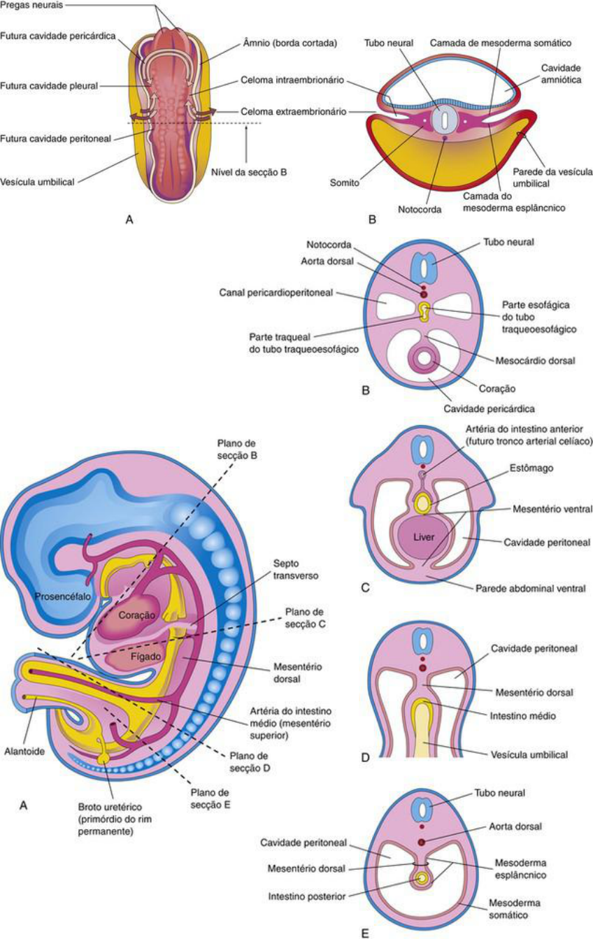 Resumo Embriologia Respiratório – Cavidades Corporais N o início da quarta semana de desenvolvimento, o celoma intraembrionário aparece como uma cavidade em forma de ferradura (Fig. 8-1A). A flexura da cavidade na extremidade cranial do embrião representa a futura cavidade pericárdica e seus membros (extensões laterais) indicam as futuras cavidades pleurais e peritoneais. O celoma intraembrionário torna-se a cavidade do corpo embrionário, que é dividido em três cavidades bem definidas durante a quarta semana: • Uma cavidade pericárdica. • Dois canais pericardioperitoneais. • Uma cavidade peritoneal. Essas cavidades possuem uma parede parietal, revestida por mesotélio (futura camada parietal do peritônio), que é derivado do mesoderma somático e uma parede visceral, também coberta por mesotélio (futura camada visceral do peritôneo), que é derivado do mesoderma esplâncnico. Mesentérios Um mesentério é uma camada dupla de peritônio, que começa como uma extensão do peritônio visceral que reveste um órgão. As artérias que irrigam o intestino primitivo – tronco arterial celíaco (intestino anterior), a artéria mesentérica superior (intestino médio) e a artéria mesentérica inferior (intestino posterior) – passam entre as camadas do mesentério dorsal. Membranas Pleuropericárdicas À medida que as pregas pleuropericárdicas aumentam, elas formam divisórias que separam a cavidade pericárdica das cavidades pleurais. Essas partições – as membranas pleuropericárdicas – contêm as veias cardinais comuns, que drenam o sistema venoso no seio venoso do coração. -dividindo o mesênquima em: • Uma camada externa que se torna a parede torácica. • Uma camada interna que se torna o pericárdio fibroso, a camada externa do saco pericárdico que envolve o coração. Membranas Pleuroperitoneais Conforme as pregas pleuroperitoneais aumentam, elas projetam-se nos canais pericardioperitoneais. Gradualmente, as pregas tornam-se membranosas, formando as membranas pleuroperitoneais. As membranas pleuroperitoneais são produzidas quando os pulmões em desenvolvimento e as cavidades pleurais se expandem e invadem a parede do corpo. Desenvolvimento do diafragma O diafragma é uma partição musculotendinosa em forma de cúpula que separa as cavidades torácica e abdominal. É uma estrutura composta que se desenvolve a partir de quatro componentes embrionários. • Septo transverso. • Membranas pleuroperitoneais. • Mesentério dorsal do esôfago. • Crescimento muscular a partir das paredes laterais do corpo. Vários genes candidatos, no braço longo do cromossomo 15 (15q), desempenham um papel crítico no desenvolvimento do diafragma. Septo Transverso O septo, que é composto de tecido mesodérmico, forma o tendão central do diafragma. Após a cabeça dobrar ventralmente durante a quarta semana, o septo forma uma espessa partição de tecido conjuntivo incompleto entre as cavidades abdominal e do pericárdio. O septo não separa completamente a cavidades torácica e abdominal. Crescimento Muscular das Paredes Laterais do Corpo Ao longo da 9ª à 12ª semana, os pulmões e as cavidades pleurais aumentam, alojando-se nas paredes laterais do corpo. Durante esse processo, o tecido da parede do corpo é dividido em duas camadas: • Uma camada externa que se torna parte da parede abdominal definitiva. • Uma camada interna que contribui para as partes periféricas do diafragma, externas às partes derivadas das membranas pleuroperitoneais. D e f e i t o p o s t e r o l a t e r a l do d i a f r a g ma Esse defeito está associado com a hérnia diafragmática congênita (HDC), que leva a herniação do conteúdo abdominal para a cavidade torácica. E ve n t r a ç ã o d o d i a f r a g ma Na eventração do diafragma, uma condição rara, metade do diafragma apresenta musculatura defeituosa e forma balões para dentro da cavidade torácica como uma camada aponeurótica (membranosa), formando uma bolsa diafragmática. G a s t r o s q u i s e e h é r n i a e p i g á s t r i c a c o n g ê n i t a A gastrosquise é uma fissura congênita na parede abdominal anterior que ocorre em cerca de 1 a cada 3.000 neonatos.