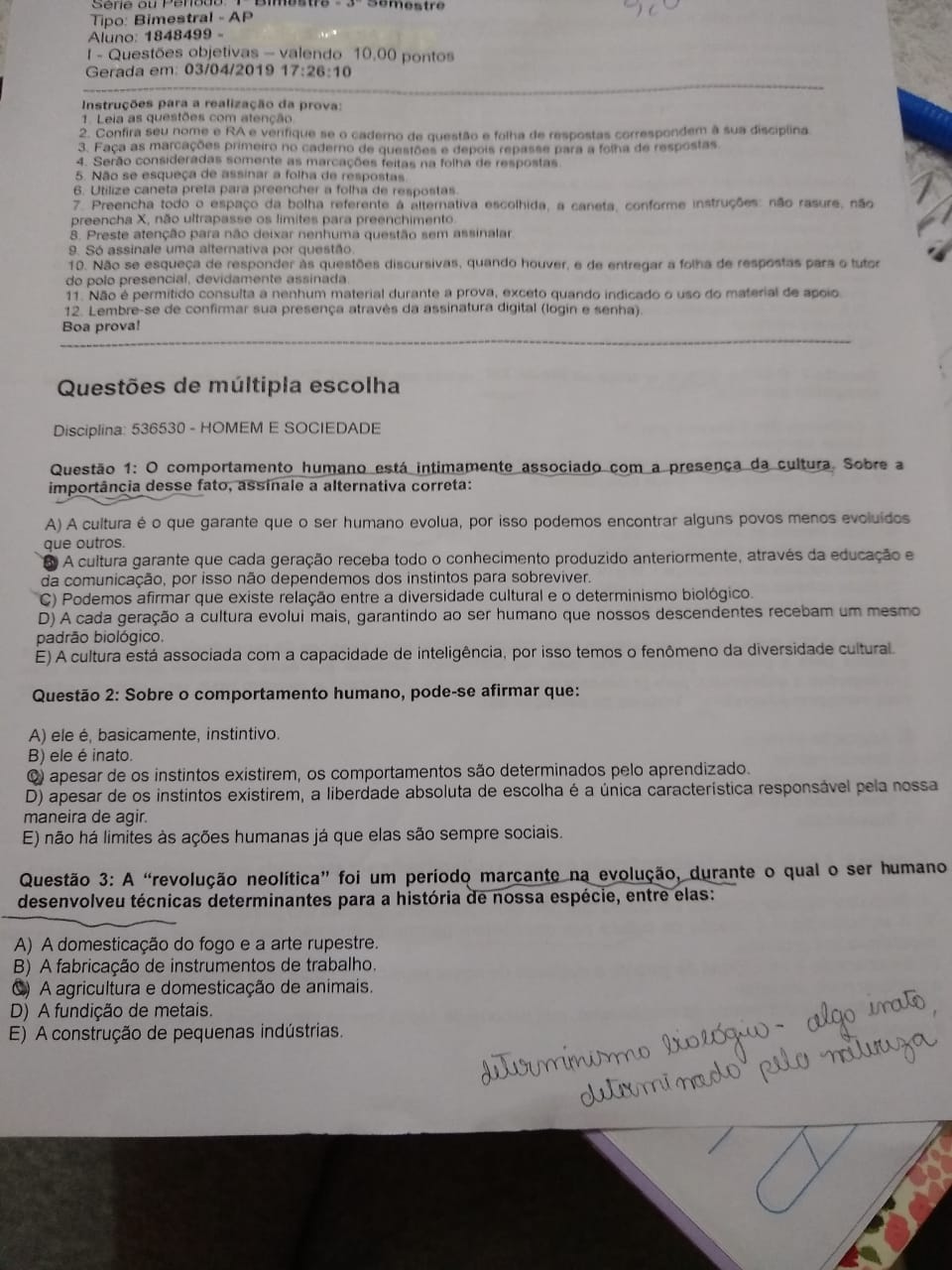 Sobre comportamento humano, pode-se afirmar que: A) Ele é basicamente, instintivo. B) Ele é inato. C) Apesar de instintos existirem, comportamentos são determinados pelo aprendizado. D) Apesar de instintos existirem, a liberdade absoluta de escolha é a única característica responsável pela nossa maneira de agir. E) Não há limites às ações humanas já que elas são sempre sociais.