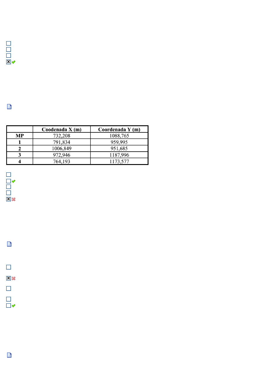 1a Questão (Ref.:201602231449) Pontos: 0,1 / 0,1 Em diversas aplicações a Terra pode ser considerada como uma esfera, no caso das coordenadas astronômicas ou geográficas, um ponto pode ser localizado sobre esta esfera através de sua latitude e longitude. Escolha a alternativa que melhor completa a seguinte afirmação: "A longitude pode variar de ________________ e tem como origem o _________________". 0° a 180° para norte (+) ou sul (-); Meridiano de Greenwich. 0° a 90° para leste (+) ou oeste (-); Meridiano de Greenwich. 0° a 90° para norte (+) ou sul (-); Equador. 0° a 180° para leste (+) ou oeste (-); Meridiano de Greenwich. Respondido em 28/05/2019 12:25:39 Compare com a sua resposta: 2a Questão (Ref.:201602377356) Pontos: 0,0 / 0,1 Dada a sequência de coordenadas (MP, 1, 2, 3, 4), desenhar a planta do polígono representado pelos pontos acima na escala 1:2000, e calcular a área (m2) pelo método de Gauss 10250 m2 52344,41 m2 Nenhuma das alternativas 125000 m2 50344,10 m2 Respondido em 28/05/2019 12:31:53 Compare com a sua resposta: 3a Questão (Ref.:201602657087) Pontos: 0,0 / 0,1 Um arquiteto coletou uma coordenada no Google Earth (Datum WGS-84) e quer lançar essa coordenada em um mapa que está em Córrego Alegre. Assinale a alternativa correta: Os parâmetros do Datum Córrego Alegre são os mesmos do WGS-84. Assim, a transformação de coordenadas não se faz necessário. O profissional pode usar as coordenadas do Google Earth diretamente em qualquer mapa, pois trata-se de coordenadas globais. O Datum Córrego Alegre e o WGS-84 possuem o sistema de referência, não necessitando de nenhuma transformação de coordenadas. Todas as alternativas estão corretas O profissional precisa fazer uma transformação de coordenadas antes de lança-las no mapa. Para isso pode usar o programa ProGriD. Respondido em 28/05/2019 12:27:50 Compare com a sua resposta: 4a Questão (Ref.:201602161893) Pontos: 0,1 / 0,1 A cada visada em um teodolito de transito se faz a leitura de 3 fios superior(FS) médio (FM) e inferior (FI) quando a leitura do fio superior é 1.567 e a do fio médio e de 1.370 qual será a leitura do fio inferior? a) 1.296 c) 1.764 e) 1.173 d) 0,967 b) 1.182 Respondido em 28/05/2019 12:29:23 Compare com a sua resposta: 5a Questão (Ref.:201602231409) Pontos: 0,1 / 0,1 A Geomática integra todos os meios utilizados para a aquisição e gerenciamento de dados espaciais, incluindo as ciências: Topografia, Cartografia e Geodésia. A respeito destas, avalie as sentenças I, II e III para escolha da alternativa correta: I. A Geodésia é a ciência que estuda a forma e as dimensões do globo terrestre como um todo; II. A Cartografia trata da representação gráfica da superfície em uma extensa área terrestre; III. A Topografia é a ciência baseada na geometria e na trigonometria plana, que utiliza medidas horizontais e verticais para obter a representação, em projeção ortogonal, do relevo de toda a superfície terrestre. Está correta a alternativa: I e II Somente I Todas as opções I, II e III Somente II II e III Respondido em 28/05/2019 12:31:11 Compare com a sua resposta: