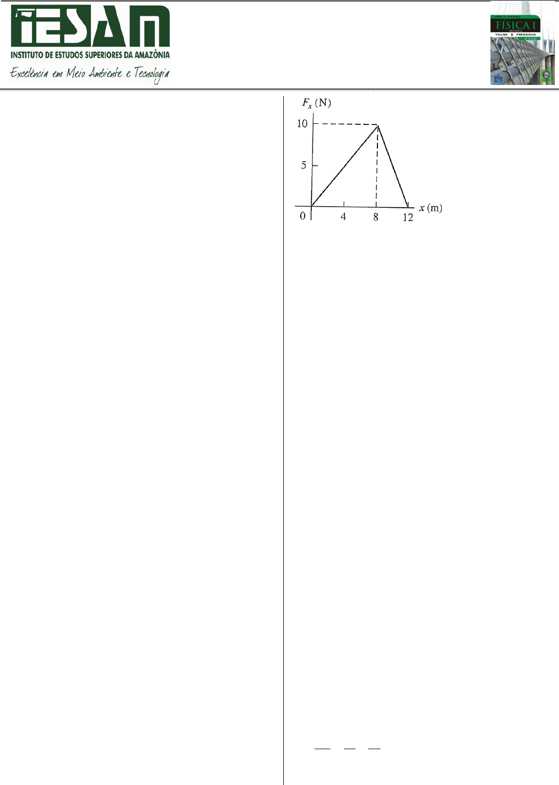ENGENHARIAS DISCIPLINA: FÍSICA GERAL I PROFESSORES DE FÍSICA DO IESAM Lista 06 de Exercícios Problemas de Física 1 – Young & Freedman – 12a Ed. Capítulo 6 – Trabalho e Energia Cinética 3/4 IESAM – Engenharias – Física Geral I – Professores de Engenharia do IESAM 1) (Q6.10) A energia cinética de um carro varia mais quando o carro acelera de 10 a 15m/s ou quando ele acelera de 15 a 20 m/s? Explique. 2) (Q6.13) Uma força resultante atua sobre um objeto e o acelera a partir do repouso até uma velocidade v1. Ao fazer isso a força realiza um trabalho igual a w1. Qual deve ser o fator do aumento do trabalho para que o objeto atinja uma velocidade final três vazes maior, novamente partindo do repouso? 3) (6.6) Dois rebocadores puxam um navio petroleiro. Cada rebocador exerce uma força constante de 1,80x106 N, uma a 14° na direção noroeste e outra a 14º na direção nordeste, e o petroleiro é puxado até uma distância de 0,75km do sul para o norte. Qual é o trabalho total realizado sobre o petroleiro? 4) (6.8) Um carrinho de supermercado carregado está sendo empurrado pelo pátio do estacionamento sob vento forte. Você aplica uma força cosntante ao carrinho enquanto ele percorre um deslocamento . Quanto trabalho a força exercida por você realiza sobre o carrinho de supermercado? 5) (6.27) Distância de Parada. Um carro se desloca sobre uma superfície horizontal com velocidade v0 no momento em que os freios ficam bloqueados, do modo que os pneus deslizam em vez de rolar. a) Use o teorema do trabalho-energia para calcular a distância mínima para o carro parar em função de v0, de g e do coeficiente de atrito cinético µ entre o pneu e o solo. b) Qual o fator da variação da distância mínima para o carro parar se i) o coeficiente de atrito cinético for dobrado ou ii) a velocidade escalar inicial for dobrada ou iii) tanto o atrito cinético quanto a velocidade escalar inicial forem dobrados? 6) (6.32) Uma vaca está saindo do celeiro, apesar de você tentar puxá-la de volta. Nas coordenadas com a origem na porta do celeiro, a vaca caminha de x=0 até x=6,9m enquanto você aplica uma força com o componente Fx=-[20,0N + (3,0N/m)x]. Quanto trabalho a força exercida por você realiza sobre a vaca durante o seu deslocamento? 7) (6.30) Uma menina aplica uma força paralela ao eixo Ox sobre um trenó de 10,0kg que se desloca sobre a superfície congelada de um lago pequeno. À medida que ela controla a velocidade do trenó, o componente x da força que ela aplica varia com a coordenada x do modo indicado na Figura 6.31. Calcule o trabalho realizado pela força quando o trenó se desloca a) de x=0 a x=8,0m; b) de x=8,0m a x=12,0m; c) de x=0 a x=12,0m 8) (6.31) Suponha que o trenó do Exercícios 6.30 esteja inicialmente em repouso em x=0. Use o teorema do trabalho energia para achar a velocidade do trenó em a) x=8,0m; b) x=12,0m. Despreze o atrito entre o trenó e a superfície do lago. 9) (6.42) Um pedreiro engenhoso montou um dispositivo que dispara tijolos até a altura da parede onde ele está trabalhando. Ele coloca o tijolo comprimindo a mola vertical com massa desprezível e constante da mola k=450N/m. Quando a mola é liberada, o tijolo é disparado de baixo para cima. Sabendo que o tijolo possui massa de 1,80kg e que ele deve atingir uma altura máxima de 3,6m acima de sua posição inicial sobre a mola comprimida. Qual é a distância que a mola deve ser inicialmente comprimida? (o tijolo perde contato com a mola no instante em que a mola retorna ao seu comprimento sem deformação. Por quê?) 10) (6.46) Uma rocha de 20,0kg está deslizando sobre uma superfície horizontal áspera a 8,0 m/s e eventualmente para em função do atrito. O coeficiente de atrito cinético entre a rocha e a superfície é 0,200. Que potência média é produzida pelo atrito até que a rocha pare? 10) (6.49) Trabalahndo como um cavalo. Seu trabalho é colocar em um caminhão engradados de 30,0kg elevando-os 0,90m do chão até o caminhão. a) Quantos engradados você coloca no caminhão em um minuto, supondo que sua potência média seja igual a 0,50hp? b) E para uma potência média de 100W? 11) (6.64) Molas em Série. Duas molas sem massa estão ligadas em série quando a ponta de uma está ligada à base da outra. a) demostre que a constante da força efetiva (veja Problema 6.63) de uma combinação em série é dada por (sugestão: para uma dada força, a distância total alongada pela mola única equivalente é a soma das distâncias alongadas pela combinação das molas. Além disso, cada mola deve exercer a mesma força. Você entender por quê? b) Generalize esse resultado para n mola em série. 12) (6.65) Um objeto é atraído para o origem com uma força dada por Fx=-k/x. (as forças elétricas e gravitacionais possuem eese tipo de dependência com a distância.) a) Calcule o trabalho realizado pela força Fx quando o objeto se desloca ao longo do eixo Ox de x1 a x2. Se x2>x1, verifique se o trabalho realizado por Fx é positivo ou negativo. b) A única força, além dessa, é a força que sua mão exerce sobre o objeto para deslocá-lo lentamente de x1 a x2. Qual trabalho você realiza? Se x2>x1, o trabalho realizado por você é positivo ou negativo? c) explique as semelhanças e as diferenças entre suas respostas das partes (a) e (b). 13) (6.71) Um bloco de gelo com massa de 6,0kg está inicialmente em repouso sobre uma superfície horizontal sem atrito. A seguir, um trabalhador aplica uma força horizontal sobre ele. Como resultado, o bloco se move ao longo do eixo Ox de tal modo que sua posição em função do tempo é dada por , onde = 0,200m/s2 e =0,0200m/s3. a) Calcule a velocidade do bloco quando t=4,0s. b) Calcule o módulo de quando t=4,0s c) Calcule o trabalho realizado pela força durante os primeiros 4,0 s do movimento. 14) (6.73) Você e sua bicicleta possuem massa total igual a 80,0 kg. Quando você atinge a base de uma ponte, está se deslocand