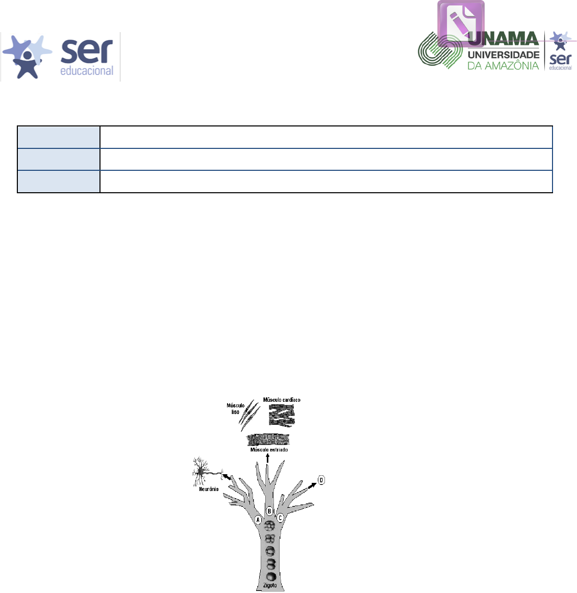 UNIVERSIDADE DA AMAZÔNIA CURSO DE GRADUAÇÃO EM ODONTOLOGIA DISCIPLINA MORFOLOGIA APLICADA À ODONTOLOGIA Exercício ALUNO PROFESSORA Luanna Fernandes TURMA 1ª) (Puc-rio) Atualmente existem inúmeros estudos sobre o desenvolvimento dos tratamentos de indivíduos com células tronco, principalmente para tecidos cujas células não são capazes de se multiplicar, regenerando parte do tecido morto de um órgão afetado pela morte dessas células. Dentre os tecidos animais que NÃO se regeneram porque suas células adultas e maduras não são capazes de reproduzir, encontramos os tecidos: Xa) nervoso e muscular. b) nervoso e epitelial. c) sanguíneo e ósseo. d) ósseo e muscular. e) epitelial e muscular. 2ª) (PucMG) A figura representa uma analogia entre as chamadas células-tronco e os diferentes tipos celulares que delas derivam em processos de diferenciação celular. Com base na representação acima e em seus conhecimentos sobre o assunto, é correto afirmar, EXCETO: a) As células da mórula são consideradas totipotentes, o que não acontece com as células-tronco dos tecidos de indivíduos adultos. b) Os processos de diferenciação celular dependem de alterações e controle da expressão gênica. Xc) Na figura, os três ramos A, B e C poderiam representar, respectivamente, endoderme, mesoderme e ectoderme. d) Na figura, a letra D poderia ser substituída por células glandulares exócrinas do tubo digestivo. 3ª) (PUC-RS-2001) O parlamento britânico legalizou a pesquisa em células de clones humanos desenvolvidos em laboratório. A partir de agora, está permitido na Inglaterra realizar investigações com células embrionárias humanas retiradas de estruturas com até 16 células. Que nome se dá à estrutura maciça de células no estágio do desenvolvimento de 16 células? Edited with the trial version of Foxit Advanced PDF Editor To remove this notice, visit: www.foxitsoftware.com/shopping UNIVERSIDADE DA AMAZÔNIA CURSO DE GRADUAÇÃO EM ODONTOLOGIA DISCIPLINA MORFOLOGIA APLICADA À ODONTOLOGIA Exercício a) Óvulo. b) Zigoto. Xc) Mórula. d) Gástrula. e) Feto. 4ª) (Vunesp-2002) Um dos caminhos escolhidos pelos cientistas que trabalham com clonagens é desenvolver em humanos a clonagem terapêutica, principalmente para a obtenção de células-tronco, que são células indiferenciadas que podem dar origem a qualquer tipo de tecido. Quanto a este aspecto, as células-tronco podem ser comparadas às células dos embriões, enquanto estas se encontram na fase de Xa) mórula. b) gástrula. c) nêurula. d) formação do celoma. e) formação da notocorda. 5ª) Considerando o esquema abaixo, enumerado de 1 a 6, que mostram os diferentes estágios que ocorrem durante o processo de clivagem. Observe que eles não estão na sequência correta de acontecimentos. Desta forma, escreva a ordem sequencial correta do desenvolvimento embrionário abaixo: 6ª) (UFSCar-2002) A epiderme (tecido epitelial de revestimento da pele) e a derme (tecido conjuntivo) derivam, respectivamente, da a) endoderma e ectoderma. b) mesoderma e ectoderma. c) endoderma e mesoderma. Xd) ectoderma e mesoderma. e) ectoderma e endoderma. 7ª) (UFPR-2006) Fase do desenvolvimento embrionário caracterizada pelo estabelecimento dos três folhetos germinativos (ectoderma, mesoderma e endoderma) e por intensos movimentos morfogenéticos: Xa) Gastrulação b) Clivagem c) Morfogênese d) Fecundação e) Apoptose 8ª) (VUNESP-2007) Um pesquisador marcou um grupo de células em um embrião de rato de laboratório. Ao observar o animal adulto, encontrou marcadas as células nervosas. Assinale a alternativa que indica corretamente o tecido embrionário que foi marcado. a) Mesoderma na fase de blástula. b) Endoderma na fase de gástrula. c) Ectoderma na fase de blástula. d) Mesentoderma na fase de blástula. Xe) Ectoderma na fase de gástrula. 3,5,2,1,6 e 4 Edited with the trial version of Foxit Advanced PDF Editor To remove this notice, visit: www.foxitsoftware.com/shopping UNIVERSIDADE DA AMAZÔNIA CURSO DE GRADUAÇÃO EM ODONTOLOGIA DISCIPLINA MORFOLOGIA APLICADA À ODONTOLOGIA Exercício 9ª) (FGV - SP-2009) Gêmeos univitelinos ou monozigóticos são aqueles formados a partir de um único zigoto, o qual se divide em blastômeros que permanecem separados e se desenvolvem em dois indivíduos. A divisão celular em questão é a a) meiose, e cada blastômero tem a metade do número de cromossomos do zigoto. b) meiose, e cada blastômero tem o mesmo número de cromossomos do zigoto. c) mitose, e cada blastômero tem a metade do número de cromossomos do zigoto. Xd) mitose, e cada blastômero tem o mesmo número de cromossomos do zigoto. e) mitose, e cada blastômero tem o dobro do número de cromossomos do zigoto 10ª) (UFSCar-2000) Observe o corte de um embrião, a seguir esquematizado. Os números 1, 2 e 3 representam, respectivamente, a) o intestino, o celoma, o tubo neural. b) o intestino, a mórula, o tubo neural. c) a mórula, a blástula, a notocorda. Xd) o intestino, o celoma, a notocorda. e) o celoma, o intestino, a notocorda. 11ª) De acordo com a nova nomenclatura anatômica, a organela celular, Complexo de Golgi, passou a ser também conhecida por Sistema Golgiense. Esta estrutura está relacionada com funções, assinale V para as afirmações verdadeiras e F para as falsas: ( V ) Armazenamento de proteínas produzidas no retículo endoplasmático rugoso. ( V ) Liberação de bolsas contendo substâncias secretadas na célula. ( V ) Produção de lisossomos, estruturas contendo enzimas digestivas. Edited with the trial version of Foxit Advanced PDF Editor To remove this notice, visit: www.foxitsoftware.com/shopping UNIVERSIDADE DA AMAZÔNIA CURSO DE GRADUAÇÃO EM ODONTOLOGIA DISCIPLINA MORFOLOGIA APLICADA À ODONTOLOGIA Exercício ( V ) Formação do acrossomo, localizado na cabeça do espermatozoide, que libera a enzima hialuronidase. 12ª) Considerando a imagem abaixo e as estruturas identificadas, diga