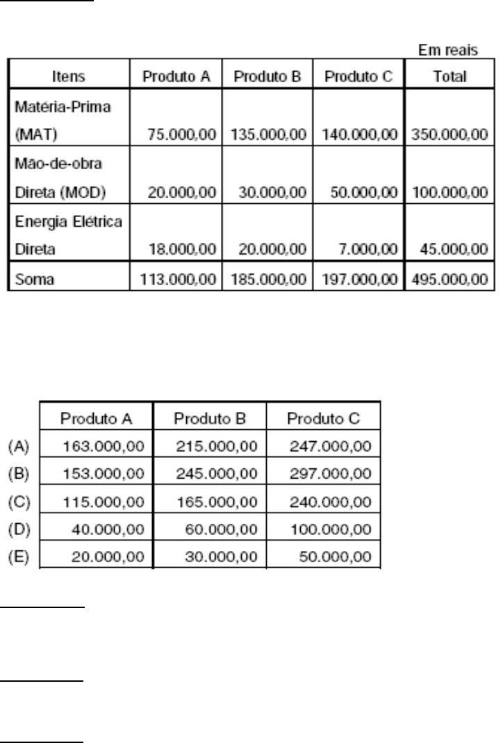ANHANGUERA 2017 – CONTABILIDADE GERENCIAL EXERCÍCIOS DE RESGATES CONCEITUAIS EXERCICIO 01 A Indústria “KYZ LTDA” fabrica três produtos com os seguintes custos diretos, alocados aos produtos: Tendo custos indiretos de fabricação fixos (CIF Fixos) no montante de R$ 200.000,00 e havendo orientação do diretor da empresa para que o rateio dos custos fixos seja realizado com base no custo de mão-de-obra direta, o custo total por produto, em reais, será de: PRODUTO A MOD= 20.000,00 / 100.000,00 x 100 = 20% CIF fixos A = 200.000,00 X 20% = 40.000,00 PRODUTO B MOD= 30.000,00 / 100.000,00 x 100 = 30% CIF fixos A = 200.000,00 X 30% = 60.000,00 PRODUTO C MOD= 50.000 / 100.000,00 x 100 = 50% CIF fixos A = 200.000,00 X 50% = 100.000,00 CT DE A: 113.000 + 40.000 = 153.000,00 CT DE B: 185.000 + 60.000 = 245.000,00 CT DE C: 197.000 +100.000 = 297.000,00 RESPOSTA: B EXERCICIO 02 Uma indústria recebeu uma encomenda de 20.000 U de seu produto, pelo valor total de R$ 3.500.000,00. Seu estoque inicial de materiais era de 250.000 kg de ferro, tendo adquirido mais 50.000 kg, logo após a encomenda. Completada a produção, verificou-se que: O estoque inicial montava a R$ 1.000.000,00; O custo unitário da nova compra de materiais foi de R$ 5,20; Cada tubo produzido utiliza 10 kg de material; O custo da mão-de-obra direta empregada foi R$ 1.200.000,00; Os Custos Indiretos de Fabricação montaram a R$ 160.000,00; A empresa trabalha, exclusivamente, sob encomenda; Desconsidere toda e qualquer relação tributária. Com base nos dados acima e considerando-se o custo médio ponderado médio como critério de avaliação do estoque de matéria-prima, o custo unitário da encomenda, em reais, é: (A) 155,50 (B) 125,00 (C) 112,50 (D) 110,50 (E) 110,00 ENTRADA SAIDA SALDO Quant. Unit. Total Quant. Unit. Total Quant. Unit. Total 250.000 4,00 1.000.000 -/- -/- -/- 250.000 4,00 1.000.000 50.000 5,20 260.000 -/- -/- -/- 50.000 5,20 1.260.000 20.000 tubos 10 KG X 4,20 = 42,00 por unidade. MO = 60,00 unidade CI = 8,00 unidade 42,00 + 60,00 + 8,00 = 110,00 RESPOSTA: E EXERCICIO 03 Uma indústria fabricou, no mês de julho, 36.000 unidades de um determinado produto e obteve as seguintes informações: Custos Fixos $ 90.000,00 Mão-de-Obra Direta $ 54.000,00 Mão-de-Obra Indireta $ 9.000,00 Matéria-Prima $ 99.000,00 Se a empresa tivesse produzido 45.000 unidades desse produto, no mesmo mês, com as mesmas instalações e com a mesma Mão-de-Obra Indireta, considerando o Custo Variável e o Custo Fixo, o custo por unidade produzida será de: (A) $ 6,15 (B) $ 6,45 (C) $ 6,50 (D) $ 7,00 (E) $ 6,35 RESOLUÇÃO: 54.000,00 + 99.000,00 = 153.000,00 / 36.000 unidades = 4,25 de custos variáveis unitários. Considerando a produção de 45.000 unidades, teríamos: 45.000unidades X R$ 4,25 = 191.250,00 (custos variáveis totais) Somando-se os custos fixos + a mão de obra indireta, teríamos: 99.000,00 Os custos totais (fixos + variáveis), seriam de R$ 290.250,00 Dividindo-se R$ 290.250,00 / 45.000 unidades = R$ 6,45 por unidade. ALTERNATIVA B