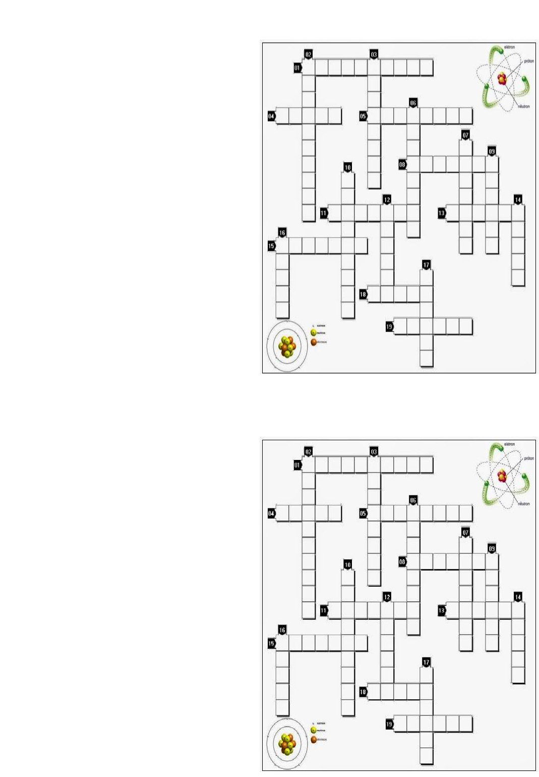 Nome: Turma CRUZADINHA – MATÉRIA E ENERGIA 01) Passagem do estado sólido diretamente para o estado gasoso. 02) Matéria constituída por um único tipo de molécula. 03) A menor parte da matéria que ainda conserva suas propriedades. 04) Mudança do estado sólido para o líquido. 05) A forma natural dos líquidos. 06) Passagem do estado líquido ao gasoso, à temperatura constante. 07) Corpo formado por mais de uma substância. 08) Estado em que a matéria a presenta volume constante e a forma do recipiente que contém. 09) Corpo usado como utensílio. 10) Grandeza que expressa a massa existente na unidade de volume. 11) Tendência da matéria de manter seu estado de movimento ou de repouso. 12) Força de atração que estão sujeitas as moléculas que formam uma substância. 13) Resistência que a substância oferece ao ser riscada por outro material. 14) As moléculas são formadas por ele. 15) Tudo aquilo que ocupa lugar no espaço. 16) Medida da quantidade de matéria em um corpo. 17) Estado em que a matéria apresenta forma e volume constante. 18) Nome dada a uma porção limitada de matéria. 19) Propriedade que dá à matéria a capacidade de refletir a luz. Nome: Turma CRUZADINHA – MATÉRIA E ENERGIA 01) Passagem do estado sólido diretamente para o estado gasoso. 02) Matéria constituída por um único tipo de molécula. 03) A menor parte da matéria que ainda conserva suas propriedades. 04) Mudança do estado sólido para o líquido. 05) A forma natural dos líquidos. 06) Passagem do estado líquido ao gasoso, à temperatura constante. 07) Corpo formado por mais de uma substância. 08) Estado em que a matéria a presenta volume constante e a forma do recipiente que contém. 09) Corpo usado como utensílio. 10) Grandeza que expressa a massa existente na unidade de volume. 11) Tendência da matéria de manter seu estado de movimento ou de repouso. 12) Força de atração que estão sujeitas as moléculas que formam uma substância. 13) Resistência que a substância oferece ao ser riscada por outro material. 14) As moléculas são formadas por ele. 15) Tudo aquilo que ocupa lugar no espaço. 16) Medida da quantidade de matéria em um corpo. 17) Estado em que a matéria apresenta forma e volume constante. 18) Nome dada a uma porção limitada de matéria. 19) Propriedade que dá à matéria a capacidade de refletir a luz.