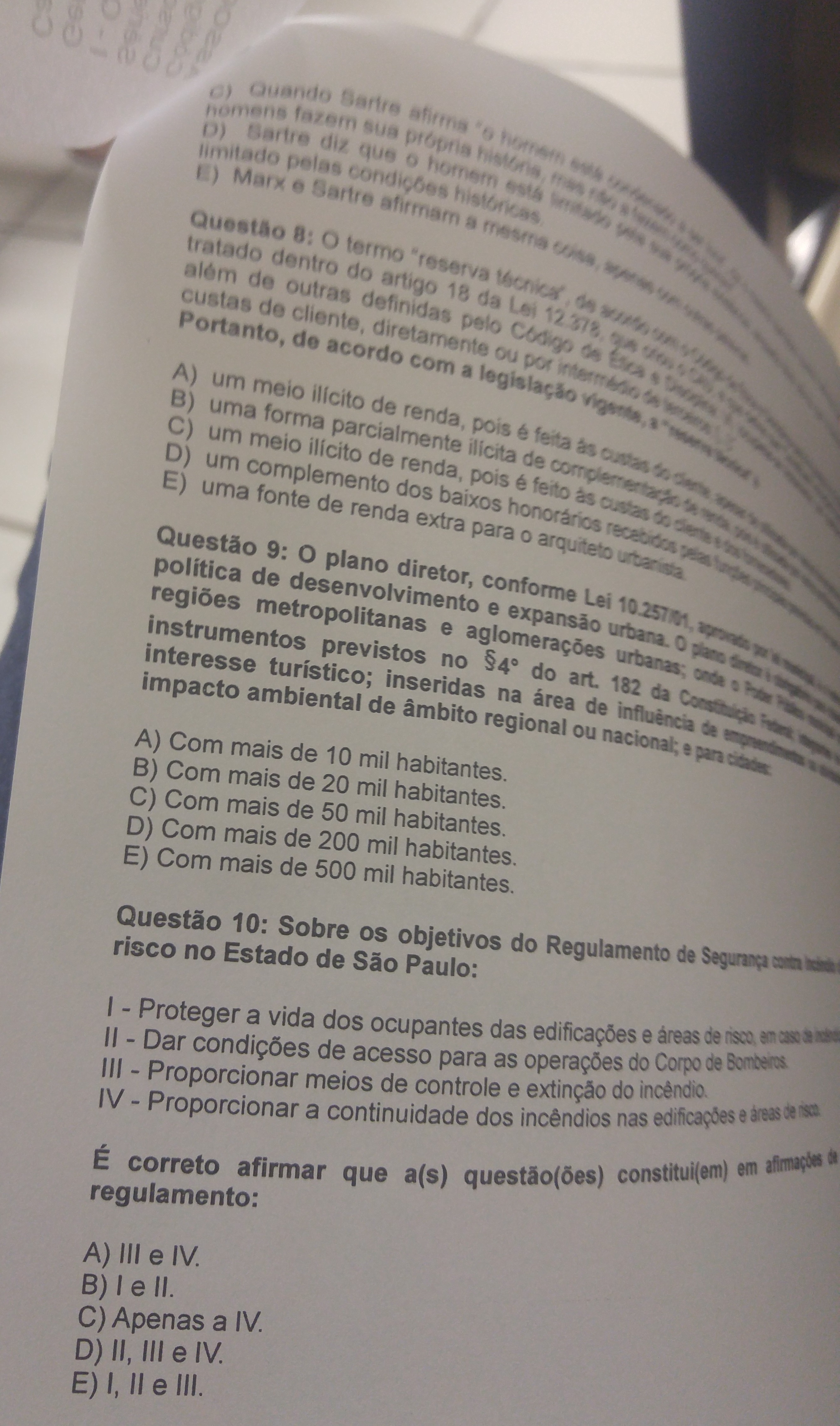 Questao 10: Sobre objetivos do Regulamento de Seguranca no Estado de Sao Paulo: I - Proteger a vida dos ocupantes das edificacoes e areas de II - Dar condicoes de acesso para as operacoes do Corpo de Bombeiros III - Proporcionar meios de controle e extincao do incendio. IV - Proporcionar a continuidade dos incendios nas edificacoes E correto afirmar que a(s) questao(bes) constitui(em) em regulamento: A) III e IV. B) I e II. C) Apenas a IV. D) II, III e IV. E) I, II e III.