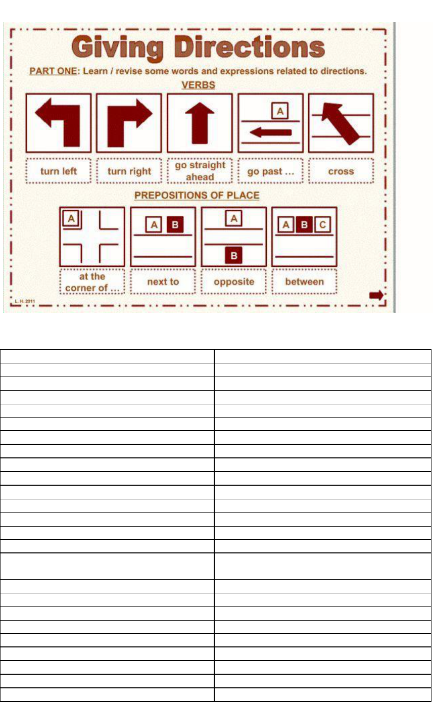 Giving directions Giving Directions Leaving your (hotel, home, job...) Saindo do seu (hotel, casa, trabalho...) It's easy to get there. É fácil de chegar lá. How do I get there? Como chego lá? Look for the signs that say... Procure as placas indicando... Go straight... / Go straight ahead Vá reto... Block Quadra, quarteirão Keep going for about (2) blocks... Continue por (2) quarteirões, quadras... Turn right / left at... Vire à direita / esquerda na... Traffic lights Semáforo Corner Esquina Street / Avenue / Road Rua / Avenida / Estrada Main Road Rua Principal At the end No final Go up (Main Street) Suba a (Rua Principal) Get off at... Saia na... Take the (Blue Street) heading towards... Pegue a (Rua Azul) no sentido / em direção... Until you get to... Até chegar na... And just keep going... E vá embora... / E continue indo... When you get to... Quando chegar a... Stay to your left / right Fique à esquerda / direita Look out for (a supermarket)... Procure (um supermercado)... It's right on the corner. É bem na esquina. It's on your right / left Fica à sua direita / esquerda You'll pass a... Você vai passar por um... It's on (Albert Street) and (Ocean Street) Fica na (Rua Alberto) com a (Rua Oceano) It's in the middle of the block É no meio da quadra / quarteirão It's between _______ and ______ Fica entre _______ e _______ It's right next to... É bem ao lado do... Cross over Atravessar If you pass ______, then you've gone too far. Se chegar num _______, então já passou. You can't miss it! Não tem erro! Questions you can ask about directions Can you please tell me how I can get to Oxford Street? Where is the nearest supermarket? How can I get to the local market? I'm trying to get to Downing Street. How do I get to the office? What's the best way to get to your house next ? Where is Mc Donalds can you tell me please?