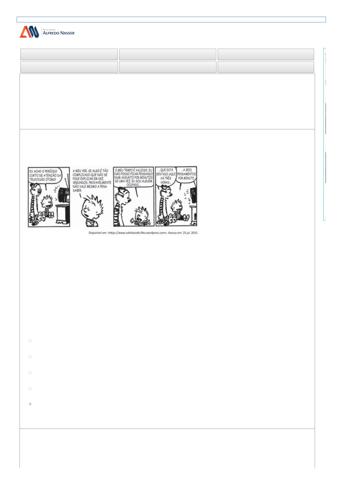 02/06/2019 servicosonline2.faculdadealfredonasser.edu.br/FormAvaliacao.aspx servicosonline2.faculdadealfredonasser.edu.br/FormAvaliacao.aspx 1/6 Bom dia! VANESSA CORREA RODRIGUES QTDE PERGUNTAS: 10 PERGUNTAS RESPONDIDAS: 10 PERGUNTAS FALTAM: 0 PERGUNTAS CORRETAS:80% PERGUNTAS INCORRETAS:20% AIDE 2019-1 A Avaliação Geral de Desempenho do Estudante (AIDE) é um exame semestral online realizado no período correspondente a P2 com valor de um ponto na composição da média. Queira, por gentileza, responder as perguntas que se seguem. A Avaliação Geral de Desempenho do Estudante (AIDE) é um exame semestral online realizado no período correspondente a P2 com valor de um ponto na composição da média. Queira, por gentileza, responder as perguntas que se seguem. 91157 - PERGUNTA 1 DE 10 | AIDE-Formação Geral Sobre a televisão, considere a tirinha e o texto a seguir: TEXTO 1 TEXTO 2 A televisão é este contínuo de imagens, em que o telejornal se confunde com o anúncio de pasta de dentes, que é semelhante à novela, que se mistura com a transmissão do futebol. Os programas mal se distinguem uns dos outros. O espetáculo consiste na própria sequência, cada vez mais vertiginosa, de imagens. PEIXOTO, N. B. As imagens de TV têm tempo? In: NOVAES, A. Rede imaginária: televisão e democracia. São Paulo: Companhia das Letras, 1991. (Adaptado) Com base nos textos 1 e 2, é correto afirmar que o tempo de recepção típico da televisão como veículo de comunicação estimula a Newton Paulo Monteiro Reflexão crítica do telespectador, uma vez que permite o acesso a uma sequência de assuntos de interesse público que são apresentados de forma justaposta, o que permite o estabelecimento de comparações. Contemplação das imagens animadas como meio de reflexão acerca de coisas no mundo contemporâneo, traduzido em forma de espetáculo. Especialização do conhecimento, com vistas a promover uma difusão de valores e princípios amplos, com espaço garantido para diferença cultural como capital simbólico valorizado. Atenção concentrada do telespectador em determinado assunto, uma vez que os recursos expressivos próprios do meio garantem a motivação necessária para o foco em determinado assunto. Fragmentação e o excesso de informação, que evidenciam a opacidade do mundo contemporâneo cada vez mais impregnado de imagens e informações superficiais. Parabéns você acertou! 91141 - PERGUNTA 2 DE 10 | AIDE-Formação Geral Inserir-se na sociedade da informação não significa apenas ter acesso às Tecnologias de Informação e Comunicação (TIC), mas, principalmente, saber utilizar essas tecnologias para a busca e a seleção de informações que permitam a cada pessoa resolver problemas do cotidiano, compreender o mundo e atuar na transformação de seu contexto. Assim, o uso das TIC com vistas à criação de uma rede de conhecimentos favorece a democratização do - - - 02/06/2019 servicosonline2.faculdadealfredonasser.edu.br/FormAvaliacao.aspx servicosonline2.faculdadealfredonasser.edu.br/FormAvaliacao.aspx 2/6 acesso à informação, a troca de informações e de experiências, a compreensão crítica da realidade e o desenvolvimento humano, social, cultural e educacional. Com base no texto apresentado, conclui-se que Newton Paulo Monteiro a inserção de um indivíduo nas relações sociais e virtuais contemporâneas exige mais que inclusão digital técnica. o compartilhamento de informações e experiências mediado pelas TIC baseia-se no pressuposto de que o indivíduo resida em centros urbanos. os avanços das TIC vêm-se refletindo globalmente, de modo uniforme, haja vista a possibilidade de comunicação em tempo real entre indivíduos de diferentes regiões. a solução para se democratizar o acesso à informação no Brasil consiste em estendê-lo a todo o território, disponibilizando microcomputadores nos domicílios brasileiros. o domínio de recursos tecnológicos de acesso à internet assegura ao indivíduo compreender a informação e desenvolver a capacidade de tomar decisões. Que pena, você errou! 91144 - PERGUNTA 3 DE 10 | AIDE-Formação Geral Leia o texto a seguir. Constantes transformações ocorreram nos meios rural e urbano, partir do século XX. Com o advento da industrialização, houve mudanças importantes no modo de vida das pessoas, em seus padrões culturais, valores e tradições. O conjunto de acontecimentos provocou, tanto na zona urbana quanto na rural, problemas como explosão demográfica, prejuízo nas atividades agrícolas e violência. Iniciaram-se inúmeras transformações na natureza, criando-se técnicas para objetos até então sem utilidade para o homem. Isso só foi possível em decorrência dos recursos naturais existentes, que propiciaram estrutura de crescimento e busca de prosperidade, o que faz da experimentação um método de transformar os recursos em benefício próprio. Santos, M. Metamorfoses do espaço habitado. São Paulo: Hucitec, 1988 (adaptado). A partir das ideias expressas no texto acima, conclui-se que, no Brasil do século XX: Newton Paulo Monteiro a industrialização ocorreu independentemente do êxodo rural e dos recursos naturais disponíveis. tanto o espaço urbano quanto o rural sofreram transformações decorrentes da aplicação de novas tecnologias às atividades industriais e agrícolas. os migrantes chegaram às grandes cidades trazendo consigo valores e tradições, que lhes possibilitam manter intacta sua cultura, tal como se manifestava nas pequenas cidades e no meio rural. homens e mulheres advindos do campo deixaram sua cultura e se adaptaram a outra, citadina, totalmente diferente e oposta aos seus valores. o êxodo rural para as cidades não prejudicou as atividades agrícolas nem o meio rural porque novas tecnologias haviam sido introduzidas no campo. Parabéns você acertou! 91146 - PERGUNTA 4 DE 10 | AIDE-Formação Geral A discussão nacional sobre a resolução das complexas q