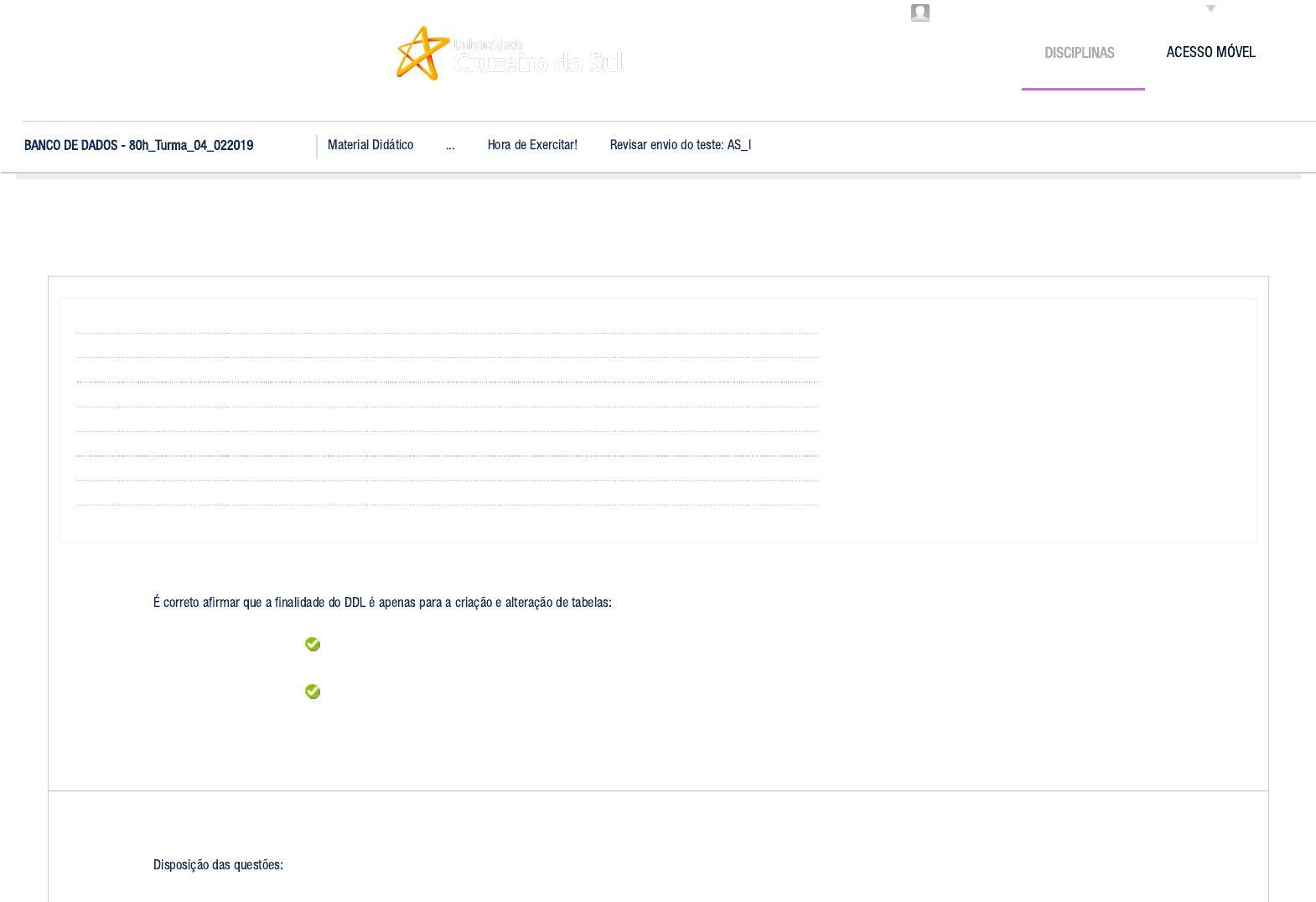 BANCO DE DADOS - 80h_Turma_04_022019 Material Didático ... Hora de Exercitar! Revisar envio do teste: AS_I REVISAR ENVIO DO TESTE: AS_I Usuário Carlos Renato Paci�co CRUZ_EAD_Cst em Análise e Desenvolvimento de Sistemas_1A_20181 Curso BANCO DE DADOS - 80h_Turma_04_022019 Teste AS_I Iniciado 17/02/19 13:26 Enviado 17/02/19 13:38 Status Completada Resultado da tentativa 0,45 em 0,6 pontos Tempo decorrido 11 minutos Resultados exibidos Todas as respostas, Respostas enviadas, Respostas corretas, Comentários Pergunta 1 Resposta Selecionada: Falso Respostas: Verdadeiro Falso Feedback da resposta: É correto afirmar que a finalidade do DDL é apenas para a criação e alteração de tabelas: A sigla DDL é Data DefinitionLanguage e é difinida para a manipulação de estrutura de dados. DDL engloba a criação, alteração e exclusão de tabelas assim como suas regras e tipos de dados. Pergunta 2 Disposição das questões: DISCIPLINAS ACESSO MÓVEL 0,15 em 0,15 pontos 0,15 em 0,15 pontos Carlos Renato Paci�co CRUZ_EAD_Cst e... Pergunta Correspondência Correta Correspondência Selecionada B. B. C. C. A. A. D. D. Escolhas com todas as respostas A. B. C. D. Feedback da resposta: Chave primária constraintprimarykey constraintprimarykey Não aceita valores nulos constraintnotnull constraintnotnull Define um conjunto de valores permitidos constraintcheck constraintcheck Alteração de tabela altertable altertable constraintcheck constraintprimarykey constraintnotnull altertable Pergunta 3 Resposta Selecionada: e. Respostas: a. b. c. d. e. Feedback da resposta: Para criarmos uma tabela de nome usuario com os campos cd_codigo do tipo número inteiro e ds_nome do tipo texto de 50 posições variáveis, a sintaxe correta é: Create table usuario ( cd_codigo integer, ds_nome varchar2(50)) Create table usuario ( cd_codigo num, ds_nome varchar2(50)) Create table usuario ( cd_codigo number, ds_nome varchar2(50)) Create table usuarios ( cd_codigo number, ds_nome varchar2(50)) Create table usuario ( cd_codigo number, ds_nome varchar2(51)) Create table usuario ( cd_codigo integer, ds_nome varchar2(50)) O comando para se criar uma tabela é CREATE TABLE, os tipos de que correspondem ao campo inteirto é o NUMBER, o campo que corresponde ao campo texto de 50 posições variáveis é VARCHAR2(50) 0 em 0,15 pontos Segunda-feira, 6 de Maio de 2019 19h00min24s BRT Pergunta 4 Resposta Selecionada: d. Respostas: a. b. c. d. e. Feedback da resposta: Como são classificados os comandos para a criação de regras no banco de dados: Dada DefinitionLanguage Data ControlLanguage Data ManiputationLanguage ConstraintsControls Dada DefinitionLanguage ControlsCreateTable A sigla DDL é Data DefinitionLanguage e é difinida para a manipulação de estrutura de dados. DDL engloba a criação, alteração e exclusão de tabelas assim como suas regras e tipos de dados. ← OK 0,15 em 0,15 pontos