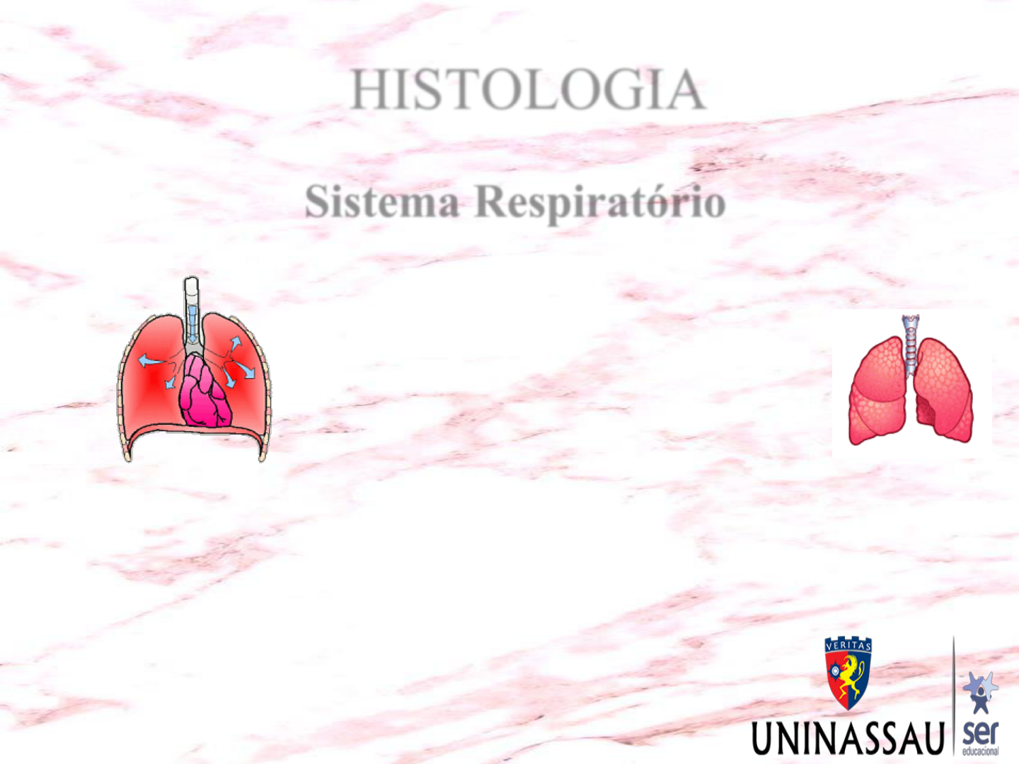 Docente: Amanda Costa Discentes: Caroline Nascimento; Geysiane Graciela Isabela Laissa; Natália Minervino; Paulo Ricardo; Priscila Cabral. HISTOLOGIA Sistema Respiratório Sistema Respiratório Na lâmina própria da cavidade nasal há muitas células de defesa, sendo os eosinófilos abundantes nas pessoas com rinite alérgica. Cavidade Nasal Faringe Traqueia Alvéolos Brônquios Sistema Respiratório Sistema Respiratório Bronquíolos Como ocorre o processo de respiração pulmonar? Ar passa pelas vias respiratórias Inspiração Expiração Funcionalidade Anatômica do Sistema Respiratório Cavidades Nasais Fossas nasais Cartilagem do septo Função olfativa Mucosa Faringe Ambos sistemas Ouvido médio e tubas auditivas Laringe Epiglote Cordas vocais Pomo de Adão Funcionalidade Anatômica do Sistema Respiratório Traqueia 12 cm de comprimento e 2,5 de diâmetro; Bifurca-se. Pulmão Ramificam-se em bronquíolos; Terminam em alvéolos pulmonares; Consistência esponjosa Separados pelo mediastino; Diafragma > separa tórax e pulmão. Funcionalidade Anatômica do Sistema Respiratório Funcionalidade Anatômica do Sistema Respiratório Processo da Hematose Manutenção do equilíbrio ácido básico; Chega aos alvéolos; Venoso > arterial; Difusão; Eliminação. Cavidade Nasal A.: Fossas nasais B.: Septo nasal C.: Nasofaringe D.: Processos palatinos fusionando-se E.: Cavidade oral F.: Língua Parte Histológica do Sistema Respiratório Revestidos por um epitélio respiratório pseudoestratificado cilíndrico ciliado com células caliciformes. Faringe Epitélio pseudoestratificado cilíndrico ciliado; Células caliciformes; Glândulas mucosas na junção com o esôfago. Parte Histológica do Sistema Respiratório Laringe A.: Epitélio pseudoestratificado cilíndrico ciliado B.: Glândulas C.: Cartilagem Hialina D.: Glândula tireoide E.: Músculo esquelético traqueal Epitélio pseudoestratificado colunar ciliado com células caliciformes. Parte Histológica do Sistema Respiratório Traqueia Epitélio pseudoestratificado ciliado; Células caliciformes; Glândulas traqueais; Cartilagem traqueal e hialina. Parte Histológica do Sistema Respiratório Brônquios Epitélio idêntico ao da traqueia; Epitélio pseudoestratificado cilíndrico ciliado com células caliciformes; Rico em fibras elásticas. Parte Histológica do Sistema Respiratório Bronquíolos Parte inicial: Epitélio simples cilíndrico ciliado; Parte final: Epitélio simples cúbico ciliado ou não. Parte Histológica do Sistema Respiratório Alvéolos Revestido por epitélio pavimentoso simples. Parte Histológica do Sistema Respiratório Ductos alveolares Revestido por epitélio pavimentoso simples cúbico ou cilíndrico e seus últimos segmentos apresentam células musculares lisas. Parte Histológica do Sistema Respiratório Pleura Formada por 2 folhetos (parietal e visceral)ambos são formados por epitélio pavimentoso simples. Parte Histológica do Sistema Respiratório