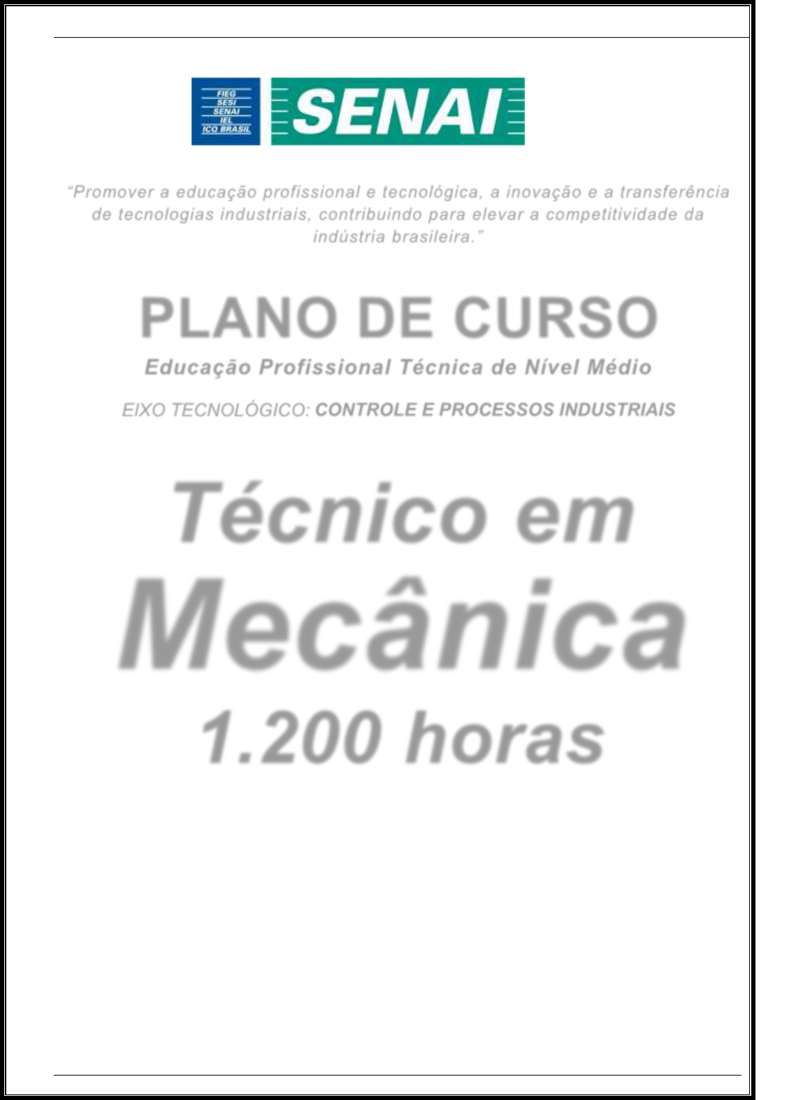 Plano de Curso - Habilitação Profissional Técnica de Nível Médio em Mecânica Serviço Nacional de Aprendizagem Industrial - SENAI de Goiás 1 MISSÃO DO SENAI: “Promover a educação profissional e tecnológica, a inovação e a transferência de tecnologias industriais, contribuindo para elevar a competitividade da indústria brasileira.” PLANO DE CURSO Educação Profissional Técnica de Nível Médio EIXO TECNOLÓGICO: CONTROLE E PROCESSOS INDUSTRIAIS Técnico em Mecânica 1.200 horas Fundamento Legal Lei Federal nº 9394, de 20 de dezembro de 1996 Parecer CNE/CEB nº 16, de 05 de outubro de 1999 Parecer CNE/CEB nº 39, de 23 de julho de 2004 Resolução CNE/CEB nº 06, de 20 de setembro de2012 Resolução CNE nº 03, de 09 de julho de 2008 Resolução CNI Nº 14, de 27 de março de 2013 Itinerário Nacional do Técnico em Mecânica 2014 – SENAI DN Versão 3. Outubro, 2014 Plano de Curso - Habilitação Profissional Técnica de Nível Médio em Mecânica Serviço Nacional de Aprendizagem Industrial - SENAI de Goiás 2 © 2014 – SENAI-GO Técnico em Mecânica Itinerário Nacional de Técnico em Mecânica – Versão 3 Plano de Curso elaborado pela DET – Diretoria de Educação e Tecnologia Presidente do Conselho Regional do SENAI de Goiás - Pedro Alves de Oliveira Diretor Regional do SENAI de Goiás - Paulo Vargas Coordenação geral Ivone Maria Elias Moreyra – Diretora de Educação e Tecnologia SESI e SENAI de Goiás Coordenação do Projeto Ítalo de Lima Machado – Gerente de Educação Profissional do SENAI de Goiás Equipe Técnica do SENAI de Goiás Claiton Cândido Vieira – Escola SENAI Itumbiara Everton Divino Fernandes Paulino – Escola SENAI Dr. Celso Charuri Wilson de Paula e Silva – Faculdade de Tecnologia SENAI Roberto Mange Márcio José Dias - Faculdade de Tecnologia SENAI Roberto Mange Diego Freire Vieira - Faculdade de Tecnologia SENAI Roberto Mange Pierre Marcos de Moraes – Analista de Educação Profissional - GEP SENAI Diagramação Pierre Marcos de Moraes – Analista de Educação Profissional - GEP SENAI. S515e SENAI-GO. GEP-GO. Plano de Curso. Eixo Tecnológico de Controle e Processos Industriais. Habilitação Profissional Técnica de Nível Médio. Goiás. Técnico em Mecânica. Goiânia, 2014. 90 p. II. 1. Educação Profissional. 2. Habilitação Profissional Técnica de Nível Médio. 3. Controle e Processos Industriais. 6. Plano de Curso. I. Autor. II. Técnico em Mecânica. CDU 370/621 SENAI – Serviço Nacional de Aprendizagem Industrial Departamento Regional de Goiás Av. Araguaia, 1.544 – Edifício Albano Franco, Vila Nova Fone: (62) 3219.1300 – Fax: (62) 32191728 Home page: www.sesigo.org.br e : www.senaigo.com.br Plano de Curso - Habilitação Profissional Técnica de Nível Médio em Mecânica Serviço Nacional de Aprendizagem Industrial - SENAI de Goiás 3 Plano de Curso - Habilitação Profissional Técnica de Nível Médio em Mecânica Serviço Nacional de Aprendizagem Industrial - SENAI de Goiás 4 Plano de Curso - Habilitação Profissional Técnica de Nível Médio em Mecânica Serviço Nacional de Aprendizagem Industrial - SENAI de Goiás 5 Sumário APRESENTAÇÃO ............................................................................................................ 06 1. JUSTIFICATIVA E OBJETIVOS ................................................................................. 08 1.1. Justificativa ...................................................................................................... 08 1.2. Objetivos do Curso ........................................................................................... 14 1.2.1. Geral ...................................................................................................... 14 1.2.2. Específicos ............................................................................................. 14 2. REQUISITOS PARA ACESSO ................................................................................... 15 3. PERFIL PROFISSIONAL DO TÉCNICO EM MECÂNICA .......................................... 16 3.1. Classificação Tecnológica da Habilitação Profissional ......................................... 16 3.2. Perfil Profissional do Técnico em Mecânica – 1440 horas ................................... 16 3.3. Perfil Profissional do Programador de Produção – 640 horas .............................. 17 3.4. Perfil Profissional do Técnico em Manutenção – 960 horas ................................. 18 4. .. ORGANIZAÇÃO CURRICULAR DA HABILITAÇÃO PROFISSIONAL ..................... 19 4.1. Unidades de Competência do Técnico em Mecânica ..................................... 19 4.2. Competências de Gestão do Técnico em Mecânica ...................................... 19 4.3. Detalhamento das Unidades e Elementos de Competência do Técnico em Mecânica ........................................................................................................ 20 4.4. Itinerário Nacional do Técnico em Mecânica .................................................. 26 4.5. Organização Curricular do Curso Técnico em Mecânica ............................... 27 4.6. Matriz Curricular Nacional da Habilitação Profissional ................................... 28 4.7. Organização Interna das Unidades Curriculares ............................................ 29 5. CRITÉRIOS DE APROVEITAMENTO E PROCEDIMENTOS DE AVALIAÇÃO DE COMPETÊNCIAS PROFISSIONAIS ANTERIORMENTE DESENVOLVIDAS......... 69 6. PRÁTICAS PEDAGÓGICAS PREVISTAS ............................................................... 75 7. CRITÉRIOS E PROCEDMENTOS DE AVALIAÇÃO DA APRENDIZAGEM ........... 83 8. INSTALAÇÕES, EQUIPAMENTOS, RECURSOS TECNOLÓGICOS E BIBLIOTECA ...... 86 9. RECURSOS HUMANOS (PESSOAL DOCENTE, TÉCNICO E ADMINISTRATIVO) ...... 87 10. DIPLOMAS E CERTIFICADOS ................................................................................ 88 11. ESTÁGIO SUPE