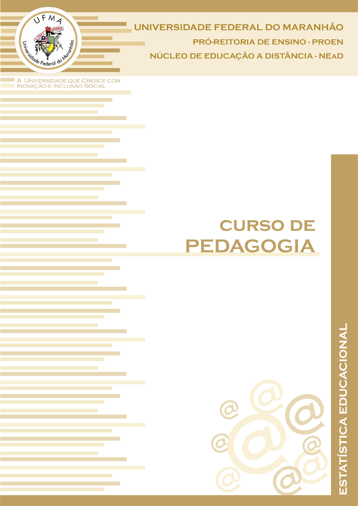 NILSON SÁ COSTA FILHO ESTATÍSTICA EDUCACIONAL Disciplina na Modalidade a Distância São Luís 2014 Universidade Federal do Maranhão Reitor Natalino Salgado Filho Vice-Reitor Antonio José Silva Oliveira Pró-Reitora de Ensino Sônia Maria Corrêa Pereira Mugschl Diretor do Núcleo de Ensino a Distância - NEaD Wilma dos Santos Eugênio Diretor do Núcleo de Tecnologia da Informação - NTI Nélio Alves Guilhon Coordenador do Curso de Pedagogia João Batista Bottentuit Júnior Coordenador de Tutoria do Curso de Pedagogia Francilene Duarte Santos Coordenador de Gestão Pedagógica Reinaldo Portal Domingo Coordenadora Pedagógica de Hipermídia para Aprendizagem - NEaD Rosane de Fátima Antunes Obregon Coordenador Tecnológico - NEaD Leonardo de Castro Mesquita Coordenador da Universidade Aberta do Brasil na UFMA Cenidalva Miranda Sousa Teixeira Coordenador Adjunto da Universidade Aberta do Brasil na UFMA João Batista Bottentuit Júnior Projeto Gráfico, Capa Luciana Santos Sousa Diagramação Erika Veras de Castro Edição – Livro didático Copyright @ UFMA/NEaD, 2013 Todos os direitos reservados à Universidade Federal do Maranhão. Créditos: Universidade Federal do Maranhão – UFMA UFMA – Núcleo de Educação a Distância Av. dos Portugueses, s/n Campus Universitário do Bacanga Telefone: 098 - 3301-8057 e 3301-8055 e-mail: neadufma@ufma.br site: www.nead.ufma.br Costa Filho, Nilson Sá Estatística Educacional/ Nilson Sá Costa Filho. – São Luís: NEAD/UFMA, 2014. fl; 84 Il. 1. Estatística educacional I. Universidade Federal do Maranhão II. Nucleo de Educação a Distância III Titulo CDU 37.014 CAPÍTULO 1 Organização de Dados e sua Distribuição de Frequências e sua Evo- lução.....................................................................................................................11 1.1 Uma abordagem histórica da evolução da ciência...........................................11 1.2 Desenvolvimento científico e tecnologia no Brasil...........................................15 1.3 Tabelas..........................................................................................................16 1.4 Gráficos.........................................................................................................20 CAPÍTULO 2 Distribuição de Frequências..........................................................29 2.1 Dados brutos, Rol e Amplitudes......................................................................29 CAPÍTULO 3 Medidas Estatísticas......................................................................41 3.1 Medidas de Tendência Cetral..........................................................................41 3.2 Medidas de Dispersão.....................................................................................51 CAPÍTULO 4 Aplicação de Procedimentos Estatísticos a Dados Evidenciados na Escola...................................................................................................................67 4.1 Planejamento..................................................................................................68 4.2 Tipos de Pesquisas..........................................................................................69 4.3 Coleta de Dados.............................................................................................69 4.4 Classificação dos Dados..................................................................................71 4.5 Instrumentos de Coleta de Dados....................................................................71 4.6 Tipos de Variáveis...........................................................................................73 4.7 Apuração dos Dados.......................................................................................73 4.8 Plano de Amostragem ...................................................................................74 4.9 Apresentação dos Dados.................................................................................77 Referências............................................................................................................83 SU M Á R IO A elaboração deste material tem como propósito levá-lo a refletir sobre a utilização das os conceitos básicos de um curso de estatística direcionados para área de educação, isto é, enfoca a estatística descritiva, as medidas sobre uma dis- tribuição nos capítulos iniciais, e coloca os principais estimadores necessá-rios ao desenvolvimento posterior de inferência estatística no Capitulo Medidas Estatísticas. Encerra o material com o conteúdo Aplicação de procedimentos estatísticos a dados evidenciados na escola tais como Coeficiente de Evolução, Matrícula, Evasão, Produtividade Anual entre oou- tros. Este conteúdo foi escolhido por alguns motivos. A nossa experiência ao desen- volver cursos nesta área nos conven-zu de que este conteúdo pode ser desenvolvido com bom aproveitamento um curso anual de 72 horas ou em curso semestral equi- valente. A Estatística Educacional é utlizada como ferramenta auxiliar à prática pe- dagógica bem como, contribuir para sua formação profissional a partir das questões aqui tratadas. Logo a ênfase do estudo recai sobre a utilização de alguns tópicos de Estatística no processo de ensino e aprendizagem e na pesquisa sobre a evolução desse processo. A pretensão é aguçar sua curiosidade e desejo de buscar mais, visto que o conhecimento não é algo acabado, esgotado. Para tanto são apresentadas questões que contribuirão para suscitar questio- namentos e reflexões que fortalecerão sua atitude investigativa. Se acaso surgirem dificuldades ou incertezas a medida que você inicie os estudos, desejamos que sirvam de incentivo para continuar a caminhada. Com a intenção de colaborar com você, este material traz alguns ícones que têm por objetivo chamar sua atenção, assim como oferecer-lhe informaçõe
