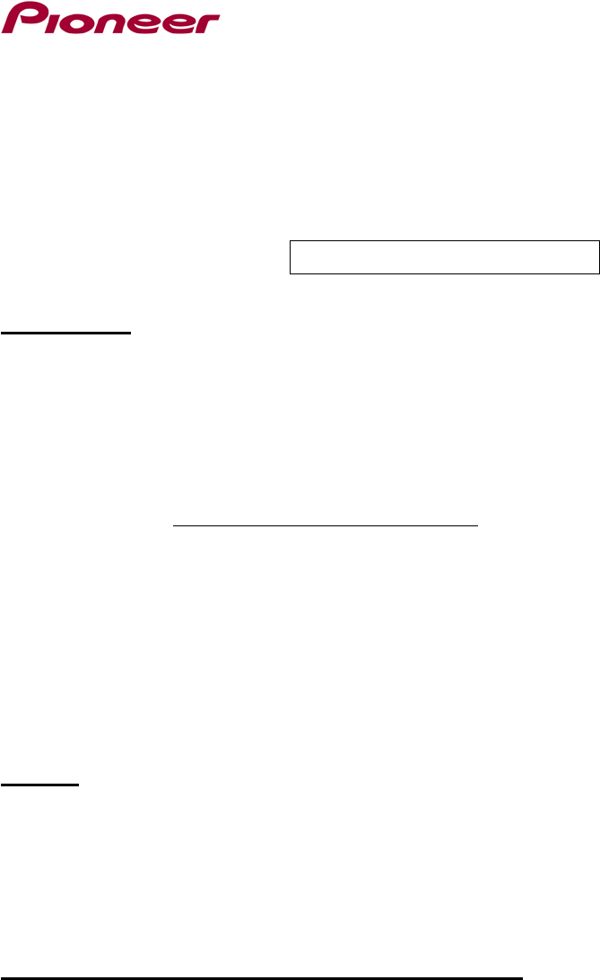 Instruções para atualização de Firmware (AVIC-F70TV) Esta atualização de firmware (versão 1.11) se aplica somente ao modelo de aparelho Pioneer vendido no Brasil. AVIC-F70TV IMPORTANTE Por favor, leia estas instruções antes de efetuar o download e instalação do arquivo de atualização de firmware. É importante que você execute todos os passos corretamente conforme ordem descrita a seguir. Observação: Em caso de dúvidas, por favor, entre em contato com nosso SAC Pioneer ligando gratuitamente para 0800-600-5725 de segunda à sexta-feira, das 9h às 18h, exceto feriados ou mande uma mensagem em pioneer.com.br/suporte/fale-conosco Para efetuar esta atualização, os seguintes itens serão necessários: • Pioneer AVIC-F70TV; • Dispositivo de armazenamento USB ou cartão de memória SD com os seguintes requisitos: - 2 GB ou maior capacidade, formatado para FAT32 - Vazio (não deve conter arquivos) Atenção • NÃO desligue a unidade, retire o cartão de memória SD ou desconecte o dispositivo de armazenamento USB durante o procedimento de atualização. • A atualização de firmware só poderá ser feita com o veículo estacionado e com o freio de mão puxado. IMPORTANTE (Para usuários do sistema de navegação) • Se você instalar este Firmware, toda configuração de navegação e arquivos salvos serão formatados. Uma vez que a atualização estiver finalizada, você terá que refazer as configurações. • Quaisquer conteúdos adquiridos ou adicionados pelo Naviextras também precisam ser reinstalados. Observe que nenhuma cobrança será feita para baixar o conteúdo adquirido anteriormente. Verificando a versão de firmware Verifique se seu aparelho necessita desta atualização identificando a versão do firmware instalada no seu aparelho. Procedimento: 1. Pressione o botão [Tela de Menu Inicial]. 2. Toque nos ícones abaixo na seguinte ordem. 3. A tela “Sistema” irá aparecer. 4. Deslize a lista para baixo. 5. Toque em [Informações de Sistema]. 6. Toque em [Informação de Firmware]. 7. Após a abertura da tela “Informação de Firmware” aparecer, verifique a versão do firmware. 8. Verifique se seu aparelho já possui a versão 1.11. Baixando os arquivos de atualização do Website da Pioneer 1. Baixe os arquivos referentes à atualização clicando no botão “Atualização de Firmware” na página do modelo AVIC-F70TV do site http://pioneer.com.br/central-multimidia/AVIC-F70TV 2. Extraia o arquivo baixado. O arquivo baixado estará compactado e você verá o seguinte arquivo ao descompactá-lo: AVIC-F70TV AVIC5100NEX CheckMd5 md5sum Navi.md5 Atualização do Firmware no seu aparelho IMPORTANTE • NÃO realize esta atualização se seu modelo não for um AVIC-F70TV. • Garanta que o arquivo de atualização esteja localizado dentro da pasta raiz no dispositivo de armazenamento USB ou cartão de memória SD. Não devem existir outros arquivos gravados neste dispositivo de armazenamento USB ou cartão de memória SD. • Durante a atualização do seu aparelho, NÃO desligue a alimentação do sistema e NÃO toque na tela do aparelho. Isto pode causar danos ao aparelho. • NÃO remova o dispositivo de armazenamento USB ou cartão de memória SD durante o processo de atualização. • Efetuar a atualização do firmware irá restaurar todas as configurações para o padrão. • Desconecte qualquer dispositivo móvel conectado ao seu aparelho. Procedimento: 1. Conecte o dispositivo de armazenamento USB ou o cartão de memória SD sem arquivos (formatado) ao seu computador, e então, localize e copie o arquivo de atualização nele. 2. Conecte o dispositivo de armazenamento USB na porta USB do aparelho ou insira o cartão de memória SD no slot para cartão SD. 3. Selecione a fonte para “SOURCE OFF”. 4. Pressione o botão de “Tela de Menu Inicial”. 5. Toque nos ícones abaixo na seguinte ordem: 6. Deslize a lista para baixo. 7. Toque em [Informações de Sistema]. 8. Toque [Atualização de Firmware]. A tela de “Atualização de firmware” será mostrada. 9. Toque em [Continue]. 10. Aguarde completar o processo de leitura dos arquivos. 11. Toque em [Iniciar]. O progresso será exibido. X.XXXXX 12. Aguarde até que o processo de atualização seja finalizado. Será exibida uma mensagem avisando o término do processo. 13. Pressione o botão [Tela de Menu Inicial]. 14. Remova o dispositivo de armazenamento USB ou o cartão de memória SD. 15. A atualização do firmware está completa. ------------------------------------------------------------ Copyright(c) 2018 Pioneer Corporation