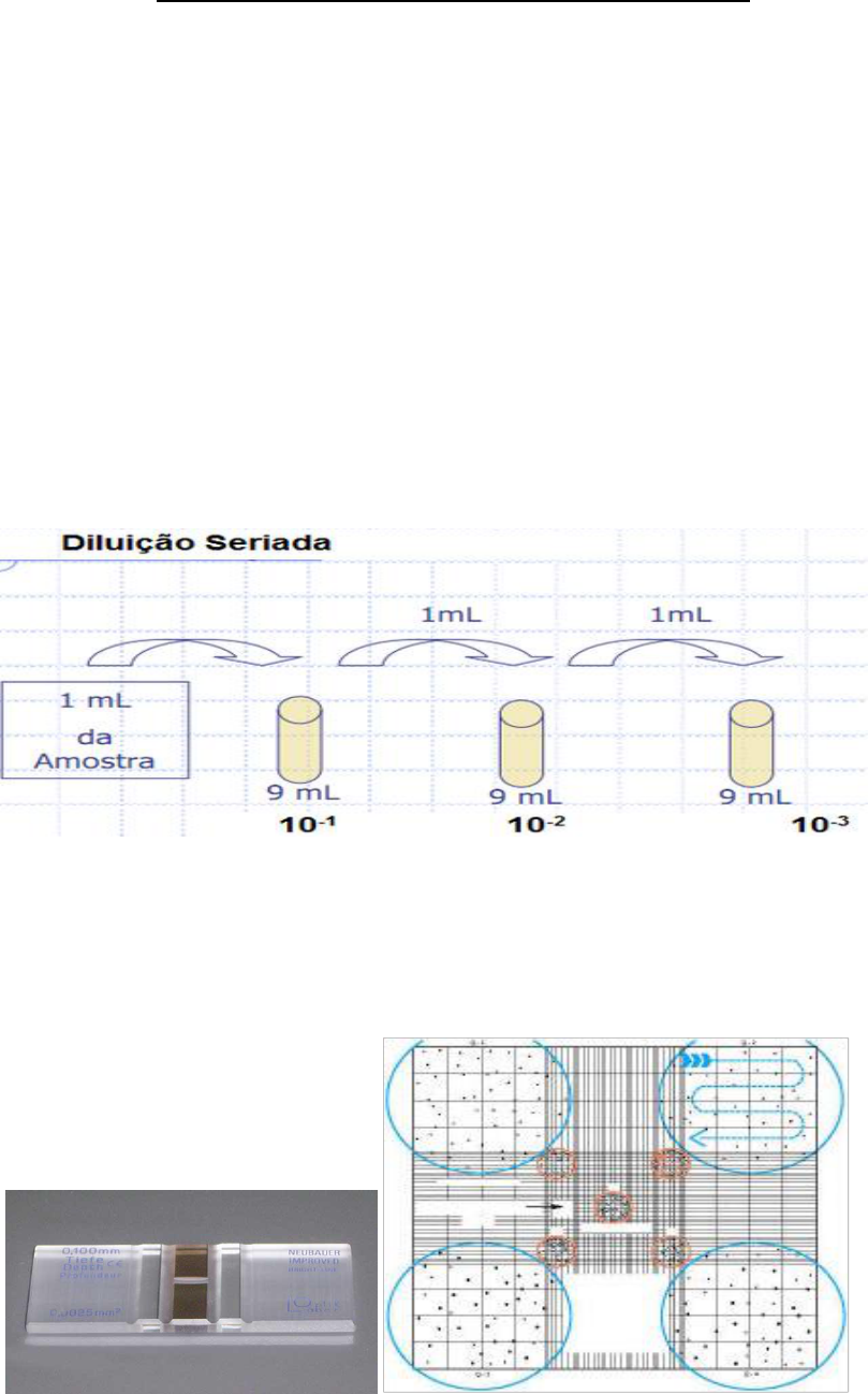 Diluição para contagem de leveduras Arrumar os materiais (estantes de tubos, tubos de ensaio, pipeta automática, camará de neubauer, lamínula.). - Fazer a diluição da cultura da seguinte forma: enumerar tubos de 1 a 3 e nos mesmos colocar 9 ml de salina, para fazer 3 diluições apartir do meio de cultura. - Acender a chama. - Do meio de cultura fazer a primeira diluição para o tubo 1, com auxilio de uma pipeta automática pipetar 100 microlitos do meio e transferir para o tubo 1. Agitar para misturar a amostra. - A partir do tudo 1 transferir mais 100 microlitros para o tubo 2 contendo também 9 ml de salina. Agitar a mistura. - Por ultimo transferir do tudo 2 para o tubo 3 mais 100 microlitros e agitar a mistura. -Preparar a camará de neubauer, colocar a lamínula sobre a camará e na sua lateral colocar uma quantidade de liquido com a pipeta, suficiente para preencher a lamínula. - levar para ser analisado em microscópio. Observando- se seus quadriculados e sempre contando as leveduras em L.