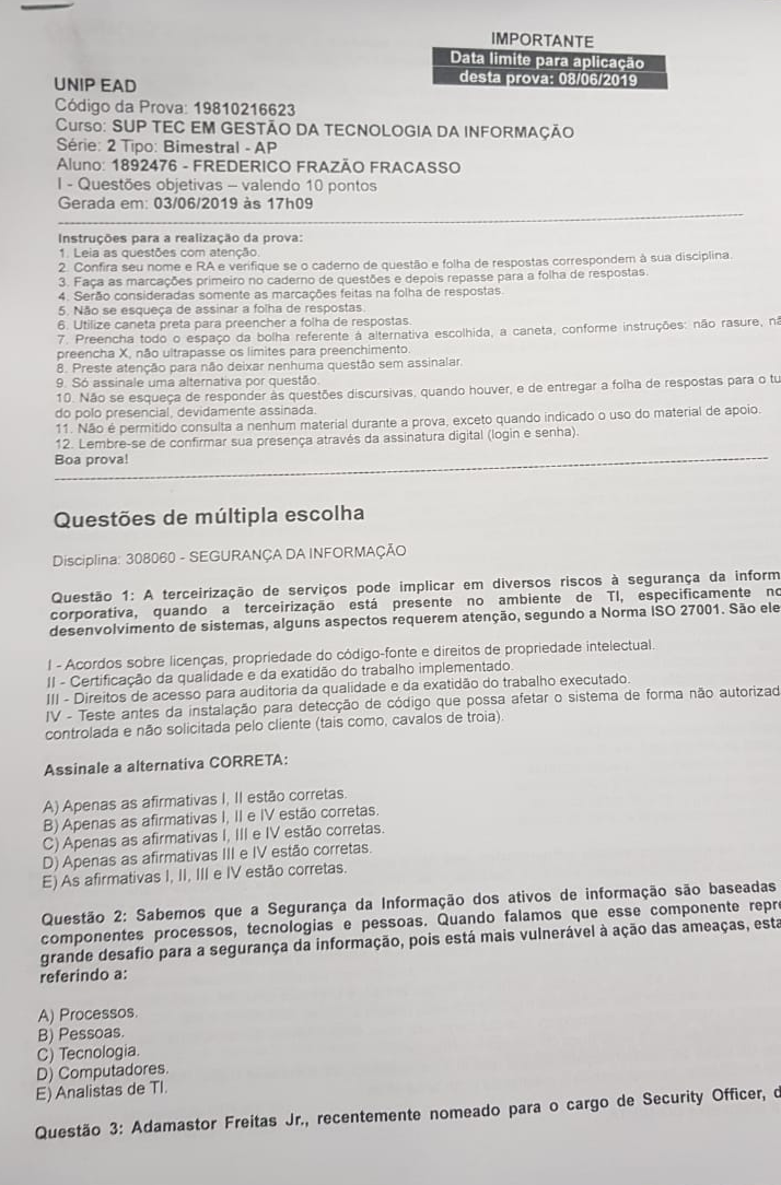 A terceirizacao de servicos pode implicar em diversos riscos a seguranca da inform corporativa, quando a terceirizacao esta presente no ambiente de TI. especificamente desenvolvimento de sistemas, alguns aspectos requerem atencao, segundo a Norma ISO 27001. sao ele Acordos sobre licencas, propriedade do codigo-fonte e direitos de propriedade intelectual. Certificacao da qualidade e da exatidao do trabalho implementado. Direitos de acesso para auditoria da qualidade e da exatidao do trabalho executado. IV Teste antes da instalacao para deteccao de codigo que possa afetar sistema de forma nao autorizad controlada e nao solicitada pelo cliente (tais como, cavalos de troia) Assinale a alternativa CORRETA: A) Apenas as afirmativas I e II estao corretas. B) Apenas as afirmativas II e IV estao corretas. C) Apenas as afirmativas I e IV estao corretas. D) Apenas as afirmativas III e IV estao corretas. E) As afirmativas I, II, III e IV estao corretas.