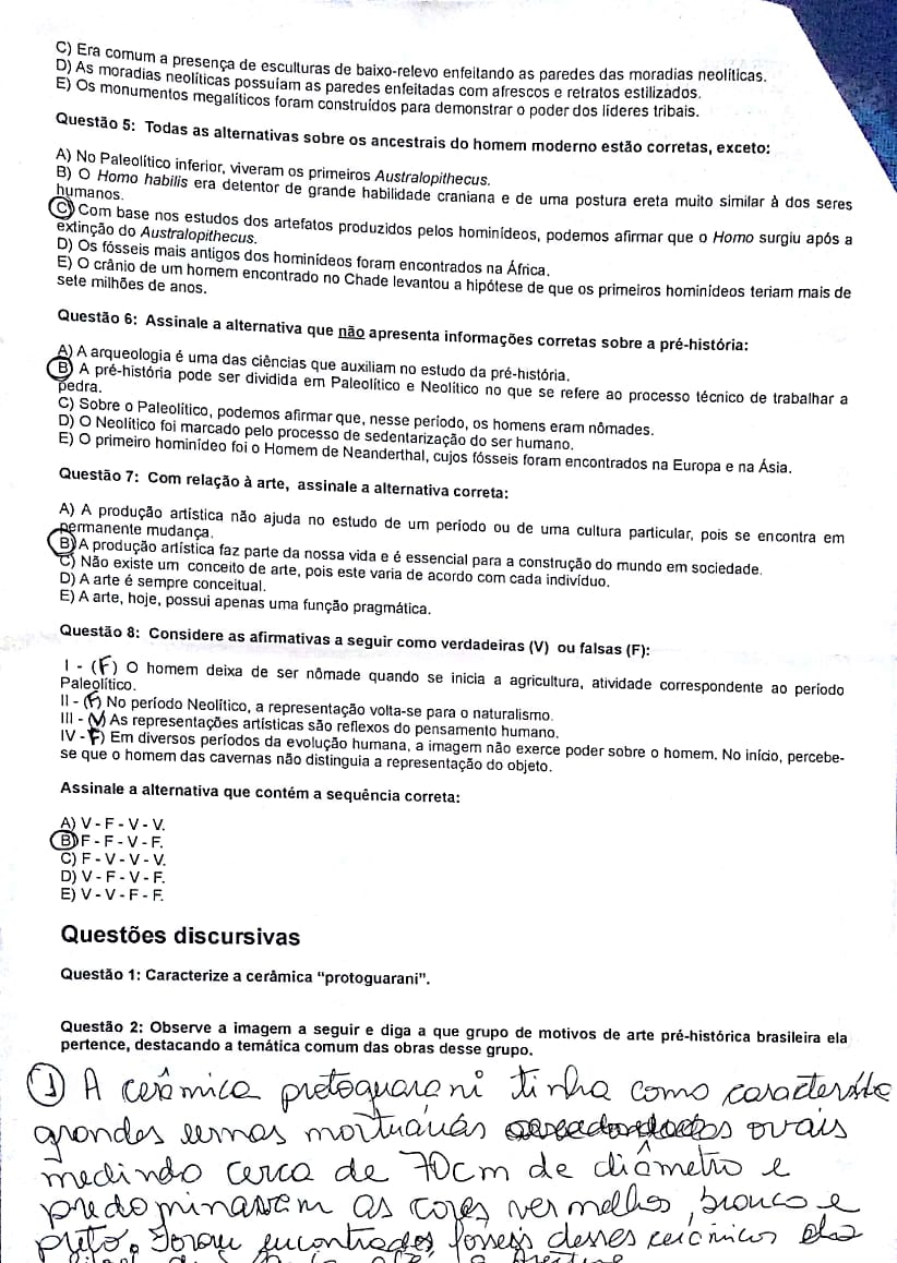 Questao 8: Considere as afirmativas a seguir como verdadeiras (V) ou falsas (F): 1 - (F) O homem deixa de ser nomade quando se inicia a agricultura, atividade correspondente ao periodo Paleolitico. 11 - No periodo Neolitico, a representacao volta-se para naturalismo. - As representacies artisticas sao reflexos do pensamento humano. IV - (F) Em diversos periodos da evolucao humana, a imagem nao exerce poder sobre homem. No inicio, percebe- se que 0 homem das cavernas nao distinguia a representacao do objeto. A) V F V. B) F F V. C) F - V - V - V. D) V - F - V F. E) V - V - F -