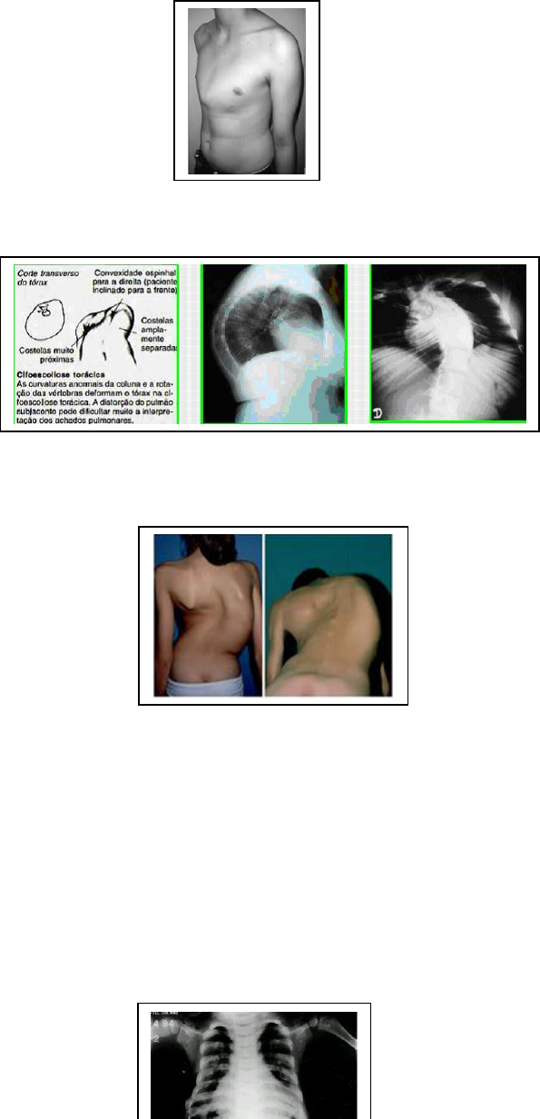 AVALIAÇÃO DO TÓRAX E ABDOME INSPEÇÃPO RESPIRATÓRIA Inspeção estática (avalia a forma física) Inspeção dinâmica: avalia tipo respiratório, ritmo e freqüência da respiração, amplitude, expansibilidade pulmonar. FORMAS DE TÓRAX IDENTIFICADAS NA INSPEÇÃO Tórax cariniforme (peito de Pombo) Esterno com abaulamento (saliente) Pode ser congênito ou adquirido (raquitismo na infância). Tórax cifoescoliótico União do tórax cifótico com o tórax escoliótico Tórax escoliótico Tórax assimétrico em conseqüência do desvio lateral da coluna torácica, tornando o semelhante a um S Tórax cifótico Causado pelo encurvamento da coluna torácica por defeito postural ou por lesão de vértebra torácica. Tórax piriforme (Tórax em sino) Caracterizado por alargamento da porção inferior do tórax parecendo um cone. Comum em hepatoesplenomegalias e ascite volumosa. Tórax infundibuliforme (tórax de sapateiro) Marcado pela presença de uma depressão no terço inferior do esterno Pode ser congênito ou adquirido Bastante presente no raquitismo Pode haver descolamento do coração por esta deformidade torácica. Tórax em barril Diâmetro Anteroposterior aumentado, igualando-se ao diâmetro transversal Característico de problemas respiratórios como enfisema pulmonar Pode estar presente em pacientes idosos sem doenças pulmonares associadas. Tórax plano ou chato Diâmetro anteroposterior diminuído sobressaindo da escápula sobre o tórax TIPOS DE RESPIRAÇÃO Respiração de cheyne-stokes Dispnéia periódica Respiração cada vez mais profunda até atingir amplitude máxima Após a amplitude máxima, ocorre a diminuição da amplitude até chegar a apnéia Após a apnéia, reinicia-se o ciclo IC grave, AVE, TCE, Intoxicações por Morfina ou barbitúricos Respiração de Biot Períodos de apnéia Forma de arritmia respiratória Meningite, Neoplasias de tórax, Hematoma extradural, lesões do centro respiratório, doenças graves do Encéfalo Mau Prognóstico. Respiração de Kusmaul Inspirações amplas e rápidas interrompidas por apnéia Expirações profundas e ruidosas seguidas de apnéia. Cetoacidose diabética, palpação da parede torácica para o exame do aparelho respiratório AVALIA-SE: Estrutura da parede torácica Expansibilidade ou mobilidade torácica Frêmito toracovocal Esta avaliação abrange tanto o tórax posterior quanto ao anterior, assim como a traquéia. TÓRAX Avaliar as estruturas subjacentes da pele e sensibilidade a dor através da palpação digital. Achados anormais: Enfisema subcutâneo Dor a palpação A avaliação abdominal tem como pontos de referências anatômicas as bordas costais, o ângulo de Charpyu, a cicatriz umbilical e as espinhas ilíacas anteriores e a sínfise púbica. Expansibilidade Avalia a capacidade dos pulmões se expandirem adequadamente na inspiração e retornar adequadamente a sua posição original Ápices e terço médio Com as mãos espalmadas sobre a região do ápice pulmonar, polegares levemente tocando um ao outro em ângulo reto. É solicitado que o paciente inspire profundamente e o examinador observa a locomoção das suas mãos. Diminuição da expansibilidade Unilateral: Processos infecciosos ou cicatriciais do ápice pulmonar – basal – derrame pleural, hepatoesplenomegalias; difusa – pneumotórax, atelectasia e traumas. Bilateral: Ápice: Infecções; Bases: Gravidez, ascite, Frêmito toracovocal Fornece dados sobre o conteúdo pulmonar através da vibração feita pela voz na parede torácica. A fala do paciente deve provocar vibrações de igual intensidade nos dois hemitóraxes A medida que o examinador desce à base e aproxima-se da periferia pulmonar, o frêmito diminui. Achados anormais. Diminuídos: Dificuldade na chegada de ar aos pulmões por doenças restritivas: Enfisema pulmonar, Derrame pleural, Atelectasia e Pneumotórax Aumento: Relacionado à consolidação pulmonar: Pneumonias, Exacerbação de secreções traqueobrônquicas. PONTOS DE PERCUSSÃO 1 ÁPICE 2 TERÇO MÉDIO 3 BASE DO PULMÃO Percussão torácica A percussão do tórax permite localizar os limites dos pulmões, presença de ar, líquidos e material sólido. 1 1 1 1 2 2 2 2 3 3 3 3 Antero Posterior SONS OBSERVADOS NA PERCUSSÃO DO TÓRAX. Maciço Curto, abafado Atelectasia e derrame pleural extenso Submaciço: Intensidade E altura moderada Encontrado em áreas sólidas Pneumonia Lobar Ressonante: Longo, alto e oco (tambor) Encontrado no tecido pulmonar normal Hiper-ressonante: Muito alto e grave Encontrado no pneumotórax, enfisema ou no pulmão Hiperinflado Timpânico: Alto, agudo Encontrado na coleção de ar como no pneumotórax volumoso. SONS RESPIRATÓRIOS Sons fisiológicos: Respiração brônquica Murmúrios Vesicular Respiração Bronco vesicular Sons anormais ou adventícios: Descontínuos: Estertores (bolhosos e creptantes) Inspiração Contínuos: Roncos, sibilos e estridor (expiração) De origem pleural: Atrito Pleural. Murmúrios vesiculares Auscultado na maior parte do tórax São produzidos pelo turbilhamento do ar quando se chocam com as bifurcações brônquicas Mais audível na inspiração. O murmúrio vesicular é mais suave quando comparado ao som brônquico São mais intensos no ápice do que nas bases pulmonar. Pode apresentar-se menos audíveis em obesos e pessoas com tecido muscular saliente Aumento da espessura do tórax. Pode variar sua intensidade dependendo da forma pela qual o paciente respira. São mais característico na inspiração na parte do ápice no terço médio do tórax Antero posterior. OS MURMÚRIOS VESICULARES Diminuição do MV sugere: Pneumotórax Derrame pleural Enfisema pulmonar Hipoventilação ou ventilação superficial Obstrução da VAs. (vias aéreas superiores) Respiração broncovesiculares: Somatória das respirações brônquicas (traqueal) com as vesiculares (pulmonares) São auscultados em todo o ciclo respiratório SONS ADVENTÍCIOS Ruídos respiratórios 