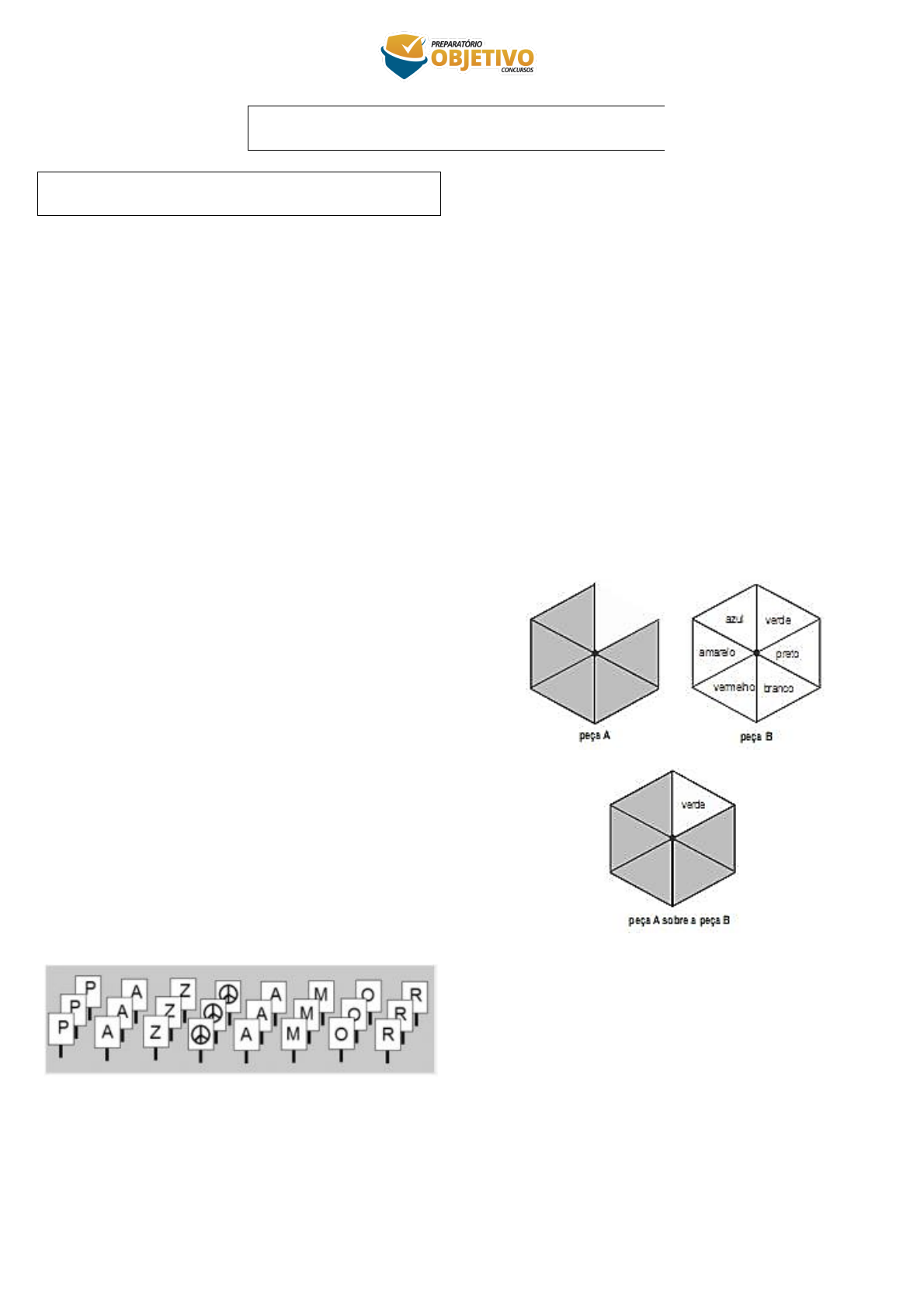 pág. 1 www.preparatorioobjetivo.com.br RLM PARA CONCURSOS PROF: PEDRO NOGUEIRA SEQUÊNCIA LÓGICA DE NÚMEROS, LETRAS, PALAVRAS E FIGURAS. 1 – Qual é o 6º termo da sequência dada a seguir? 2 3 5 7 A) 13 B) 11 C) 10 D) 9 E) 8 2 – Considere a sequência a seguir na qual as sílabas PI, PA, PA, PA, RA, PO se repetem incessantemente, reiniciando a partir da última, sempre na mesma ordem: (PI, PA, PA, PA, RA, PO, PI, PA, PA, PA, RA, PO, PI, PA, PA, PA, RA, PO, ...) É correto afirmar que o trigésimo termo dessa sequência é A) PI B) PA C) RA D) PO E) MI 3 – Se observarmos a sequência de palavras a seguir, perceberemos um padrão: pá; luz; sofá; lápis; caneca,... Qual seria a sétima palavra desta sequência? A) cadeira. B) xícara, C) televisão. D) ventilador. E) amendoim. 4 – Observe o quadro lógico abaixo: A partir da sequência de placas apresentada na figura acima, é correto concluir que a quantidade de maneiras distintas de trocar entre si as posições das placas e ainda obter a mesma formação inicial é igual a A) 83 B) 66! 6 C) 86 D) 2 46! 6 E) 6 26! 6 5 – Na sequência a seguir, simplificamos a forma de nos referirmos aos dias da semana. Podemos dizer que o oitavo termo da referida sequência é (Terça, Quinta, Sábado, Segunda, Quarta, ____) A) Domingo. B) Segunda. C) Terça. D) Quarta. E) Quinta. 6 – Observe as gravuras: As figuras acima ilustram um brinquedo que consiste em colocar a peça A sobre a peça B, de modo que a peça A permaneça fixa e a peça B gire em torno de seu eixo central, mostrando, a cada segundo(s), um triângulo diferente com o nome de uma cor. Se a rotação da peça B se der no sentido horário e, no instante t = 0 s, o brinquedo mostrar a cor verde, então, nos instantes t = 577 s e t = 578 s, serão mostradas, respectivamente, as cores A) amarelo e vermelho. B) azul e amarelo. C) preto e verde. pág. 2 www.preparatorioobjetivo.com.br D) verde e azul. E) branco e preto. 7 – João pretende completar as casas de um tabuleiro 3×3, utilizando as letras A, B ou C. Cada casa é formada por um quadrado, conforme apresentado na figura a seguir. Para completar o tabuleiro, preenchendo cada casa com apenas uma dessas letras, de modo que casas com lados adjacentes não sejam preenchidas com a mesma letra, João deverá escrever na casa destacada na figura A) somente a letra A. B) somente a letra B. C) somente a letra C. D) somente a letra B ou C. E) qualquer uma das letras A, B ou C. 8 – Na sequência DÓ, RÉ, MI, RÉ, DÓ, RÉ, MI, RÉ, DÓ, RÉ, .... o vigésimo termo é A) DÓ B) RÉ C) MÍ D) FÁ E) SÓ 9 – Por apresentar problemas técnicos, uma impressora imprimiu, seguidamente, sem espaços entre os caracteres, a palavra CANETA em uma página de papel em branco, de forma que o início da impressão era CANETACANETACANETACANETACANETA. ( ) Nessa situação hipotética, se a impressão foi interrompida no instante que a impressora imprimiu o caractere de número 1.043, então, esse último caractere impresso foi a letra “E”. 10 – Se os termos da sequência (5, 10, 26, 50, 122, 170, …) obedecem a uma sequência lógica na lei de sua formação, qual o sétimo termo? A) 280 B) 282 C) 286 D) 288 E) 290 11 - Admita n pedaços de papel contendo, cada um deles, uma sequência das oito letras da palavra TRINDADE, de modo que as três vogais da palavra sempre apareçam juntas. Veja os seguintes exemplos: TRIAENDD DAEITDNR TRAEINDD Se todas as sequências escritas nos n pedaços de papel são distintas entre si, o maior valor possível de n é igual a: A) 360 B) 720 C) 2160 D) 3680 E) 4540 12 – Podem ser vistas a seguir as 8 primeiras figuras e também a última, de uma sequência de 17 figuras. Alógica de formação da sequência acontece no sombreamento dos quadrados que formam o quadriculado. três, quatro, cinco e até nove figuras distintas da sequência inicial. No caso de ser um desenho obtido de quatro figuras distintas sobrepostas, a maior soma dos números das posições das quatro figuras utilizadas na sobreposição é A) 35 B) 37 C) 39 D) 41 E) 43 13 – Os números da tabela a seguir obedecem a uma regra lógica: 2 5 3 8 7 14 6 17 pág. 3 www.preparatorioobjetivo.com.br 5 6 20 2 2 13 4 ? De acordo com essa regra, o número que deve ocupar o lugar da interrogação é o: A) 26 B) 24 C) 22 D) 20 E) 18 14 – Observe a sequência abaixo A, A, B, C, E, F, E, I, J,... Qual o próximo termo da sequência? (Considere o alfabeto com as letras K, Y e W) A) A B) C C) D D) G E) K 15 – Observe que, quatro das figuras seguintes têm uma característica comum. A única figura que NÃO tem a característica das demais é A) B) C) D) E) 16 – A figura ilustra um tabuleiro do jogo RESTA UM. Começa-se o jogo com peças em todas as casas, exceto em uma, que está inicialmente vazia (Figura 1). Nesse jogo, todas as peças podem ser movimentadas. No entanto, cada casa comporta, no máximo, uma peça. Nesse jogo, a única jogada possível consiste em: dadas três casas consecutivas em linha, na horizontal ou na vertical, se uma das casas, que não a central, estiver vazia e as outras duas, ocupadas, uma das peças salta a outra, adjacente, retirando-se do jogo a que foi pulada. Se não for possível realizar a jogada, o jogo acaba. Na Figura 2, vê-se a casa A vazia e as casas B e C ocupadas. A peça que está em C pula a que está em B e passa a ocupar a casa A. A peça da casa B, que foi pulada, é retirada do jogo (Figura 3). Abaixo, está representada uma situação de jogo no Resta Um. ( ) Na situação apresentada, o jogo acaba com, no mínimo, um número de peças igual a 2. 17 – Assinale a alternativa que completa CORRETAMENTE a frase. O próximo elemento da sequência 2/3 , 7/5 , 11/13 , 19/17 , ... é: A) 23/31 . B) 21/23 . C) 23/27 . pág. 4 www.preparatorioobjetivo.com.br D) 31/29 . E) 23/29 . 18 – Entre os números 5028, 1331, 3375, 2744 e 4096, assinale a alternativa que apresenta aquele que não foi obtido a 