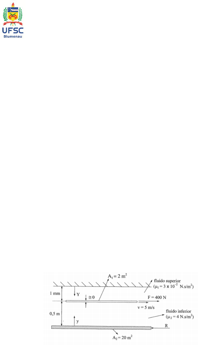 Universidade Federal de Santa Catarina – Campus Blumenau Fenômenos de Transferência I – Profa. Andrea Bierhalz 1ª Lista de exercícios – Propriedades dos fluidos/Viscosidade - 11/08/2017 1) A viscosidade cinemática de um óleo é 0,028 m2/s e o seu peso específico relativo é 0,85. Determinar a viscosidade dinâmica (usar g = 10 m/s2) R. 23,8 N.s/m2 2) O peso de 3 dm3 de uma substância é 23,5 N. A viscosidade cinemática é 10-5 m2/s. Se g = 10 m/s2, qual será a viscosidade dinâmica? R. 7,83 x10-3 N.s/m2 3) Um recipiente contém 30 kg de água ( = 9800 N/m3) e está completamente cheio. Após algum tempo 2/3 da água do recipiente é consumida e o recipiente é novamente completado, desta vez com óleo leve (g = 7742 N/m3) que, evidentemente, sobrenada sobre a água. Para estas novas condições, determine a massa total de fluido (óleo+água) presente no recipiente. R. 25,8 kg 4) O espaço entre duas placas paralelas está preenchido com óleo que apresenta viscosidade dinâmica igual a 4,56.10-2 N.s/m2. A placa inferior é imóvel e a superior está submetida a uma força F. Se a distância entre as duas placas é 2,5 mm, qual deve ser o valor de F para que a velocidade da placa superior seja igual a 0,9 m/s? Admita que a área efetiva da placa superior seja igual a 0,13 m2. R. 2,13N 5) Na figura, uma placa de espessura desprezível e área A1 = 2 m 2 desloca-se com v = 5 m/s constante, na interface de dois fluidos, tracionada por uma força F = 400 N. Na parte superior, ɛ = 1 mm e o diagrama de velocidade é considerado linear. Na base, tem-se uma placa com A2 = 20 cm2 e o diagrama de velocidade é dado por v = ay2 + by + c, onde a = 5, b = 7,5 e c=1. Pede-se: a) A tensão de cisalhamento na parte superior da placa em movimento (com área de 2 m2); b) A tensão de cisalhamento na parte inferior da mesma placa (com área de 2 m2) c) A força R que mantém a placa da base em repouso (com área de 20 m2) 6) Um êmbolo de 100 kg se move por gravidade no interior de um cilindro vertical. O diâmetro do êmbolo é de 200 mm e o diâmetro do cilindro de 200,1 mm. A altura do êmbolo é de 320 mm. O espaço entre o êmbolo e o cilindro está cheio de óleo com viscosidade dinâmica igual a 8,5 N.s/m2. Determinar a velocidade na descida considerando um perfil linear de velocidade. R. 2,87 cm/s 7) Ar a 20°C escoa sobre uma placa plana apresentando um perfil de velocidade senoidal tal como apresentado na figura. Determine a tensão de cisalhamento para y= 3,5 mm. Considere a massa específica do ar igual a 1,23 kg/m3 e viscosidade dinâmica igual a 1,8x10-5 Pa.s. O gradiente de velocidade é dado por: 8) Um canal é formado por duas placas paralelas separadas por 6 mm tendo entre elas glicerina a 20°C com massa específica igual a 1260 kg/m3 e viscosidade cinemática igual a 1,19 x10-3 m2/s. Determinar a força necessária para puxar a placa superior com uma velocidade v = 6 m/s considerando esta com superfície igual a 2 m2. R. 3000N 9) Uma placa retangular de 4 m x 5 m escorrega sobre o plano inclinado da figura, com velocidade constante, e se apoia sobre uma película de óleo de 1 mm de espessura e de = 0,01 N.s/m2. Se o peso da placa é de 100 N, quanto tempo levará para que sua parte dianteira alcance o fim do plano inclinado? R. 80 s 10) Um bloco de 39,7 lbm desliza sobre um placa com inclinação de 15° contendo uma camada de óleo (µ = 8,14.10-2 N.s/m2) com 3 mm de espessura. A área de contato é 0,3 m2. Determine a velocidade terminal do bloco. R: 5,62 m/s 11) Um cilindro de aço com massa específica 7850 kg/m3 com 40 mm de diâmetro e 350 mm de comprimento desliza no interior de um tubo com abertura de 40,2 mm. O espaçamento entre o cilindro e o tubo é preenchido com óleo com viscosidade de 0,440 N.s/m2. Qual é a velocidade alcançada pelo cilindro de aço? R: 0,17 m/s 12) O dispositivo da figura é constituído de dois pistões de mesmas dimensões geométricas que se deslocam em dois cilindros de mesmas dimensões. Entre os pistões e os cilindros existe um lubrificante de viscosidade dinâmica 10-2 N.s/m2. O peso específico do pistão (1) é 20000 N/m3. Qual é o peso específico do pistão (2) para que o conjunto se desloque na direção indicada com uma velocidade de 2 m/s constante? Desprezar o atrito na corda e nas roldanas. R. 16800 N/m3 13) Um eixo com diâmetro externo de 18 mm gira a 20 rotações por segundo dentro de um mancal de sustentação estacionário de 60 mm de comprimento. Uma película de óleo com espessura de 0,2 mm preenche a folga anular entre o eixo e o mancal. O torque necessário para girar o eixo é de 0,0036 N.m. Estime a viscosidade do óleo que se encontra na folga anular, em (Pa.s). R. 0,021 N.s/m2