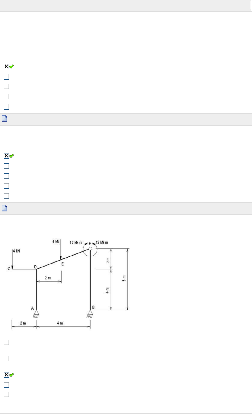 1 a Questão As estruturas podem ser classificadas de acordo com o número de reações de apoio para sustentação de uma estrutura mantendo um equilíbrio estático. Marque a alternativa que representa os tipos de estrutura que não permitem movimento na horizontal nem na vertical, ou seja o número de incógnitas à determinar é igual ao número de equações de equilíbrio. Isoestáticas Superestruturas Hiperestáticas Estáticas Hipoestáticas 2 a Questão Das alternativas apresentadas, qual condição é causada pelas cargas externas que tendem a fletir o corpo em torno do eixo que se encontra no plano da área? Momento Fletor Tensão de Cisalhamento Momento Tensão Torque Força Normal 3 a Questão Classifique a estrutura quanto a sua estaticidade. Frágil Elástica Isostática Hiperestática Hipoestática 4 a Questão Marque a alternativa em que se classifica o equilíbrio cujo arranjo de forças atuantes sobre determinado corpo em repouso de modo que a resultante dessas forças tenha módulo igual a zero. Dimensional Pontual Estático Real Dinâmico 3. A estrutura apresentada foi calculada para suportar uma Máquina de Ar Condicionado de um prédio comercial que pesa W=6 kN e as distâncias a e b valem, respectivamente, 4m e b=2m. Responda a afirmativa correta (considere as vigas horizontais rígidas e com peso desprezível). Se quisermos garantir a horizontalidade da viga, as barras verticais não podem possuir a mesma seção, uma vez que a carga não está centralizada as barras verticais devem ser projetadas com a mesma seção para garantir a horizontalidade da viga Como a carga nas barras verticais é diferente, é possível que a diferença de comprimento compense a diferença de tensão, possibilitando a utilização de seções iguais nas barras verticais, respeitada a tolerância de horizontalidade do equipamento. as barras verticais devem estar com a mesma tensão para garantir a horizontalidade da viga Não é possível a utilização de seções iguais e garantir a horizontalidade 5 a Questão A estrutura apresentada foi calculada para suportar uma Máquina de Ar Condicionado de um prédio comercial que pesa W=6 kN e as distâncias a e b valem , respectivamente, 4m e 2m. Responda a afirmativa correta (considere as vigas horizontais rígidas e com peso desprezível). As reações RA e RC são iguais As forças atuantes nas Barras AB e CD valem 2 kN e 4 kN, respectivamente Posso afirmar que RA - RC = 6kN Posso afirmar que RC - RA = 1kN As forças atuantes nas Barras AB e CD valem 5 kN e 1kN, respectivamente 6 a Questão Um material pode sofrer um esforço que se desenvolve quando as cargas externas tendem a torcer um segmento do corpo com relação a outro. Este movimento pode levar a fratura de um material. A qual classificação de aplicação de carga representa tal condição? Torque Força de cisalhamento Isostática Hiperestática Força Normal 7 a Questão ASSINALE A OPÇÃO CORRETA EM RELAÇÃO A DUCTIBILIDADE: PROPRIEDADE QUE REPRESENTA O GRAU DE DEFORMAÇÃO QUE UM MATERIAL SUPORTA ANTES DE SUA RUPTURA. PROPRIEDADE QUE REPRESENTA O GRAU DE DEFORMAÇÃO QUE UM MATERIAL SUPORTA ANTES DO SEU LIMITE DE PROPORCIONALIDADE. PROPRIEDADE QUE REPRESENTA O GRAU DE ALONGAMAENTO QUE UM MATERIAL SUPORTA ANTES DO SEU ESCOAMENTO PROPRIEDADE QUE REPRESENTA O GRAU DE DEFORMAÇÃO QUE UM MATERIAL SUPORTA ANTES DO SEU ESCOAMENTO. PROPRIEDADE QUE REPRESENTA O GRAU DE ESTRICÇÃO QUE UM MATERIAL SUPORTA ANTES DO SEU ESCOAMENTO. 8 a Questão Marque a afirmativa que considerar correta observando a figura ao lado e considerando que as vidas horizontais: são rígidas possuem peso próprio desprezível As forças nas Barras DE e BG são iguais Essa estrutura está hiperestática A Força AH vale 125 N e a DE vale aproximadamente 83 N Não posso usar a 3ª Lei de Newton para calcular as reações nas Barras As forças atuantes em AH e BG valem, respectivamente 300 e 200 N 7 a Questão A coluna está submetida a uma força axial de 8 kN no seu topo. Supondo que a seção transversal tenha as dimensões mostradas na figura, determinar a tensão normal média que atua sobre a seção a-a. 0,182 MPa 571 kPa 182 kPa 1,82 MPa 5,71 MPa 2 a Questão A barra de aço BC representada abaixo tem diâmetro igual a 5 cm e está submetida a um carregamento F igual a 150 KN. Sabendo que o comprimento inicial da barra é de 50 cm, calcule a variação linear do comprimento da barra e a tensão normal média atuante na mesma. Faça Eaço = 200 GPa. sméd = 76,39 MPa e d= 0,191 m sméd = 763,9 MPa e d= 1,91 mm sméd = 76,39 KN e d= 0,191 cm sméd = 76,39 MPa e d= 0,191 mm sméd = 763,9 KN e d= 1,91 mm Supondo que o eixo da figura abaixo possui um diâmetro de 20 mm; está submetido a uma força de 150 000N e tem o comprimento de 15 cm, calcule a tensão normal atuante e a variação linear no comprimento (∆L). ᴛ = 477,46 MPa e ∆L = 0,075 mm ᴛ = 777,46 MPa e ∆L = 1,75 mm ᴛ = 477,46 MPa e ∆L = 1,75 mm ᴛ = 777,46 MPa e ∆L = 0,75 mm ᴛ = 477,46 MPa e ∆L = 0,75 mm 1 a Questão CONSIDERANDO O GRÁFICO DE UM MATERIAL FRÁGIL É CORRETO AFIRMAR QUE: O LIMITE DE PROPORCIONALIDADE CORRESPONDE A TENSÃO MÁXIMA. O GRÁFICO É REPRESENTADO POR UMA RETA COM ALTO COEFICIENTE ANGULAR. MATERIAL FRÁGIL NÃO OBEDECE A LEI DE HOOKE. NÃO HÁ TENSÃO DE RUPTURA DEFINIDO. O ESCOAMENTO ACONTECE APÓS RESISTENCIA MÁXIMA. 2 a Questão Levando em consideração uma estrutura ao solo ou a outras partes da mesma vinculada ao solo, de modo a ficar assegurada sua imobilidade, salve pequenos deslocamentos devidos às deformações. A este conceito pode-se considerar qual tipo de ação? Reação de fratura Força tangente Estrutural Força normal Reação de apoio 3 a Questão A barra tem largura constante de 35 mm e espessura de 10 mm. Determine a tensão normal média máxima na barra quando ela é submetida à carga mostrada. 45,8 MPa 34,2 MPa 62,8 MPa 84,3 MPa 91,4 MPa 4 a Questão Calcule as reações no