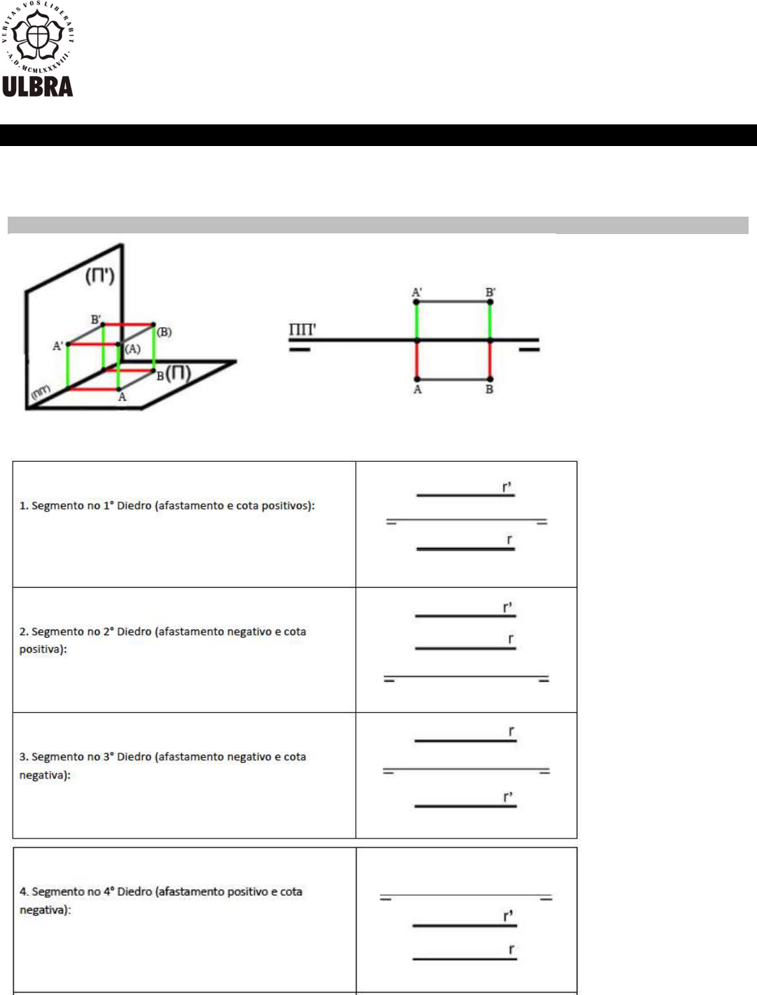 1 ULBRA TORRES Curso de Arquitetura e Urbanismo Disciplina de Desenho técnico e Geometria descritiva Profª. Anallu Barbosa RESUMO - ESTUDOS DA RETA Obs. Todos os exercícios devem constar na pasta para avaliação do G2. Resumo: RETA FRONTO-HORIZONTAL 2 3 RETA DE TOPO 4 RETA VERTICAL 5 RETA HORIZONTAL 6 RETA FRONTAL 7 RETA DE PERFIL RETA QUALQUER 8 ULBRA TORRES Curso de Arquitetura e Urbanismo Disciplina de Desenho técnico e Geometria descritiva Profª. Anallu Barbosa 2 LISTA DE EXERCÍCIOS SOBRE ESTUDOS DA RETA Obs. Todos os exercícios devem constar na pasta para avaliação do G2. 1) Representar as retas (A)(B), (C)(D), (EF) no espaço e em épura em um desenho separado, classificando-as quanto à sua posição em relação aos planos de projeção. Dados: (A) [ 10 ; 20 ; 10 ] (B) [ 30 ; 10 ; 30 ] (C) [ 0 ; 10 ; 20 ] (D) [ 30 ; 10 ; 20 ] 9 (E) [ -10 ; 10 ; -20 ] (F) [ 20 ; 20 ; -20 ] 2) Verificar se os pontos (C) e (D) pertencem à reta (A)(B). Dados: (A) [ 0 ; 30 ; 10 ] (B) [ 40 ; 10 ; 10 ] (C) [ 20 ; 20 ; 10 ] (D) [ 30 ; -10 ; -15 ] 3) Verificar se os pontos (G) e (H) pertencem à reta de perfil (E)(F). Dados: (E) [ 20 ; 10 ; 30 ] (F) [ 20 ; 30 ; 10 ] (G) [ 20 ; 20 ; 20 ] (H) [ 20 ; 20 ; 30 ] 10 4) Determine as projeções de um ponto (C) que pertence a reta que passa pelos pontos (A) e (B), sendo: (A) [ 0; 30 ; 10] (B) [ 40; 10; -30] (C) [ 30; ?; ?] 5) Verificar se os pontos C e D pertencem à reta AB. Dados: (A) [ -10; 20; 5] (B) [20; 30; 10] (C) [15; 26; 5] (D) [10; 0; -22] 6) Verificar se os pontos C e D pertencem à reta de perfil AB. Dados: (A) [ 10; 25; 0 ] (B) [?; 5; 25] (C) [ 10; 17; 10 ] (D) [ 10; 9; 20 ] 7) Determine as projeções de um ponto (C) que pertence a reta que passa pelos pontos (A) e (B), sendo: (A) [ 0; -30 ; -10] (B) [ -40; -10; 30] (C) [ .-30; ?; ?]