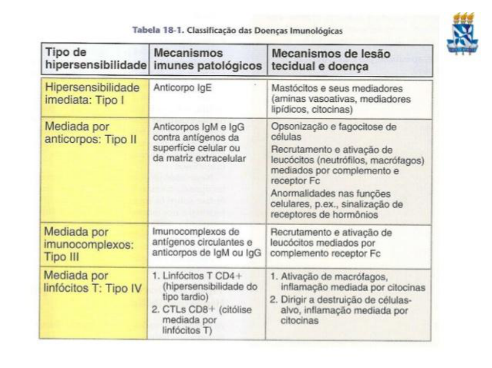 IMUNOLOGIA: REAÇÕES DE HIPERSENSIBILIDADE A imunidade adaptativa tem a importante função de defesa do hospedeiro contra infecções microbianas, mas as respostas imunológicas também são capazes de produzir lesão tecidual e doenças. Os distúrbios causados por respostas imunes são chamados de hipersensibilidade. Este termo surgiu da definição clínica de imunidade como uma sensibilidade, baseando-se na observação de que um indivíduo que tenha sido exposto a um antígeno exibe uma reação detectável, ou torna-se sensível, a encontros subsequentes com esse antígeno. Em geral, as respostas imunes erradicam os organismos infectantes sem provocar graves lesões aos tecidos do hospedeiro. No entanto, essas respostas são, algumas vezes, controladas de maneira inadequada, inapropriadamente direcionadas aos tecidos do hospedeiro ou desencadeadas por microrganismos comensais ou antígenos ambientais, os quais geralmente são inofensivos. Nestas situações, a resposta imune, normalmente benéfica, torna-se a causa da doença. Reações de hipersensibilidade são respostas exageradas do hospedeiro frente à exposição antigênica. Essas reações podem ser classificadas quanto ao mecanismo imune envolvido e são divididas em duas fases, independentemente de sua classificação: Fase de Sensibilização: fase em que o hospedeiro reconhece o antígeno e se torna sensível a ele. Fase Efetora Deletéria: fase prejudicial, onde uma segunda exposição ao antígeno ao qual o hospedeiro é sensível causa uma série de reações que lesam o hospedeiro. Classificação: Tipo I – Hipersensibilidade Imediata Tipo II – Hipersensibilidade Mediada por Ac Tipo III – Hipersensibilidade Mediada por Imunocomplexos (AgAc) Tipo IV – Hipersensibilidade Celular HIPERSENSIBILIDADE DO TIPO I: A hipersensibilidade imediata (hipersensibilidade do tipo I), causada por anticorpos IgE específicos para antígenos ambientais, é o tipo mais prevalente de hipersensibilidade. A hipersensibilidade imediata, comumente chamada de alergia ou atopia, é o exemplo de doença resultante da ativação de células T auxiliares produtoras de IL -4, IL -5 e IL -13, classicamente denominadas células Th2, onde as células T estimulam a produção de anticorpos IgE e a inflamação. A IgE sensibiliza os mastócitos e uma exposição subsequente ao alérgeno ativa os mastócitos para secretarem os mediadores que são responsáveis pelas reações patológicas de hipersensibilidade imediata. HIPERSENSIBILIDADE DO TIPO II: Os anticorpos IgG e IgM podem causar lesão tecidual por meio da ativação do sistema complemento, recrutando células inflamatórias e interferindo nas funções celulares normais. Alguns desses anticorpos são específicos para antígenos de determinadas células ou da matriz extracelular e são encontrados ligados a essas células ou tecidos ou como anticorpos livres na circulação; as doenças induzidas por esses anticorpos são chamadas de hipersensibilidade do tipo II. HIPERSENSIBILIDADE DO TIPO III: Outros anticorpos podem formar imunocomplexos na circulação, de modo que os complexos são subsequentemente depositados nos tecidos, particularmente nas paredes dos vasos sanguíneos e causar lesões. As doenças decorrentes de imunocomplexos também são chamadas de hipersensibilidade do tipo III. MECANISMOS EFETORES DA DOENÇA MEDIADA POR ANTICORPO: Os anticorpos opsonizam as células e podem ativar o complemento, gerando produtos do complemento que também opsonizam células, levando à fagocitose delas por meio dos receptores de Fc ou receptores para C 3 b nos fagócitos. Os anticorpos recrutam os leucócitos pela ligação aos receptores de Fc ou pela ativação do complemento e, então, liberam subprodutos que são quimiotáticos para leucócitos. Os anticorpos específicos para receptores de hormônios ou de neurotransmissores da superfície celular podem estimular a atividade desses receptores mesmo na ausência do hormônio, como se observa na doença de Graves (hipertireoidismo), ou podem inibir a ligação do neurotransmissor ao seu receptor, como ocorre na miastenia grave. HIPERSENSIBILIDADE DO TIPO IV: A lesão tecidual pode ocorrer em razão dos linfócitos T que induzem inflamação ou matam diretamente as células-alvo, tais condições são chamadas de hipersensibilidade do tipo IV. Elas são causadas principalmente pela ativação de células T auxiliares CD4+, as quais secretam citocinas que promovem a inflamação e ativam os leucócitos, especialmente neutrófilos e macrófagos. As células T auxiliares também estimulam a produção de anticorpos que danificam os tecidos e induzem a inflamação. Os CTLs contribuem para a lesão de tecidos em determinadas doenças.