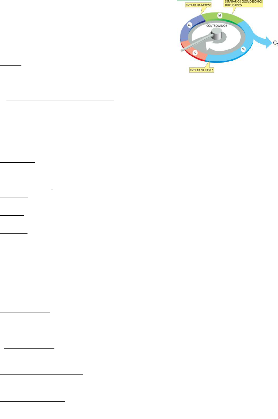 MITOSE Ciclo celular: Interfase: etapa de preparação para célula se dividir - G1 – síntese de RNA e proteínas - S – ocorre a replicação do DNA - G2 –Crescimento da célula e reparo do DNA Fase M: Mitose (divisão do núcleo) + citocinese (divisão do citoplasma) Pontos de checagem: - Entra na fase S: Controle externo - Entra em M: reparo do DNA e verificação da sua integridade. - Separar os cromossomos duplicados: Verificação se as fibras do fuso estão ligadas corretamente em todos os cromossomos. Centrossomo: Estrutura organizadora de microtúbulos (fuso-mitótico) Mitose Prófase: Condensação dos cromossomos, formação do fuso mitótico. - Condensina: proteínas que auxiliam na condensação os cromossomos, diminuindo a chance dos cromossomos se embaraçarem e tornando mais fácil a segregação. Prometáfase: Fragmentação do envoltório nuclear, fragmentação do nucléolo, ligação dos fusos mitóticos aos cinetocoros. - Cinetocoro: complexo de proteína especializado que se reúne nos cromossomos condensados, no final da prófase. Metáfase: Disposição dos cromossomos no plano equatorial – estado máximo de condensação dos cromossomos. Anáfase: Separação das cromátides irmãs para lados opostos da célula. A clivagem das coesinas que une as cromátides permite essa separação. Telófase: Os dois conjuntos de cromossomos chegam aos polos de fuso, reorganização do envelope nuclear e nucléolo, descondensação dos cromossomos, distribuição das organelas entre as células-filhas, início da formação do anel contrátil. Reorganização do envelope nuclear: Na telófase, as vesículas da membrana nuclear se agrupam ao redor dos cromossomos individuais e então se fundem para formar o novo envelope nuclear. As proteínas dos poros nucleares e as laminas nucleares são desfosforiladas, o que permite que se reconstituam e formem o envelope nuclear e a lâmina nuclear, respectivamente. As Proteínas nucleares são direcionadas para o núcleo (aumento de tamanho). Citocinese: processo pelo qual o citoplasma é dividido em dois, gerando duas células filhas. - Em célula animal: o citoplasma é dividido por um anel contrátil O anel contrátil é composto, principalmente, de uma sobreposição de filamentos de actina e miosina. Os deslizamentos dos filamentos de actina sobre os filamentos de miosina geram uma força contrátil. - Em célula vegetal: As duas células-filhas vegetais são separadas pela formação de uma nova parede que se forma dentro da célula em divisão. Divisão das organelas e macromoléculas -Mitocôndrias e cloroplastos: surgem somente do crescimento e da divisão das organelas preexistentes. Assim, elas serão herdadas facilmente se elas dobrarem em número durante o ciclo celular. RE e aparelho de Golgi: São fragmentadas durante a mitose e divididos entre as duas células- filhas Outros componentes celulares: (incluindo todas as proteínas solúveis) são herdados randomicamente quando a célula se divide. MEIOSE Reprodução sexuada: Organismos que se reproduzem sexuadamente são em geral diploides (cada célula contém dois conjuntos de cromossomos - 2n). Gametas: A meiose ocorre para formação de gametas (haploides), que são células de reprodução. Zigoto: primeira célula formada após a fusão de dois gametas. Meiose I Prófase I : condensação dos cromossomos, cada cromossomo paterno duplicado forma um par com seu homólogo materno, unindo-se longitudinalmente um ao outro. Recombinação genética entre os cromossomos maternos e paternos. - Bivalente: estrutura formada quando os cromossomos duplicados estão pareados (quatro cromátides). - Quiasma: conexão entre os dois cromossomos homólogos (promove a recombinação genética); OBS: na bivalentes possuem mais de um quiasma gerando múltiplas recombinações. Metáfase I: Bivalentes ligados ao fuso mitótico alinham-se na placa metafásica. Cada cromossomo homólogo encontra-se orientado para um dos polos (o direcionamento dos homólogos para cada célula filha ocorre de forma aleatória). Anáfase I: Separação e movimentação dos cromossomos homólogos em direção aos polos opostos da célula; Telófase I: Desorganização do fuso mitótico, reorganização do envelope nuclear, descondensação dos cromossomos. Meiose II Os estágios desta divisão são similares aos verificados na mitose. As cromátides-irmãs são separadas para a formação de células-filhas com conteúdo haploide de DNA. Mitose Meiose – Resulta em duas células geneticamente iguais – Resulta em quatro células geneticamente diferentes – Não há redução do número de cromossomos – Há redução do número de cromossomos – Não há permuta gênica entre cromossomos homólogos – Normalmente ocorre permuta gênica entre os cromossomos homólogos – Ocorre em células somáticas – Ocorre em células germinativas – Uma célula produzida por mitose, em geral, pode sofrer nova mitose – Uma célula produzida por meiose não pode sofrer meiose – É importante na reprodução assexuada de organismos unicelulares e na regeneração das células somáticas dos multicelulares – É importante na reprodução sexuada Meiose I Quasma e Bivalencia Formas de recombinação genética Mitose x meiose