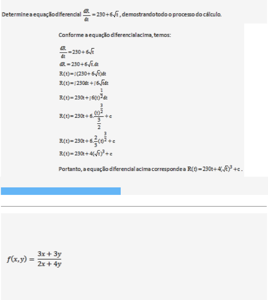 1. Analise a questão a seguir: Resposta Esperada: Resposta esperada: Anexos: Formulário - Equações Diferenciais (Saulo) 2. O domínio é um termo utilizado na matemática no estudo de funções. O domínio de uma função F de um conjunto A até um elemento de um conjunto B é definido como o subconjunto de todos os elementos de A que a função leva até um elemento de B. Sendo assim, descreva o domínio da função de duas variáveis a seguir: Resposta Esperada: A resposta esperada deve ser: