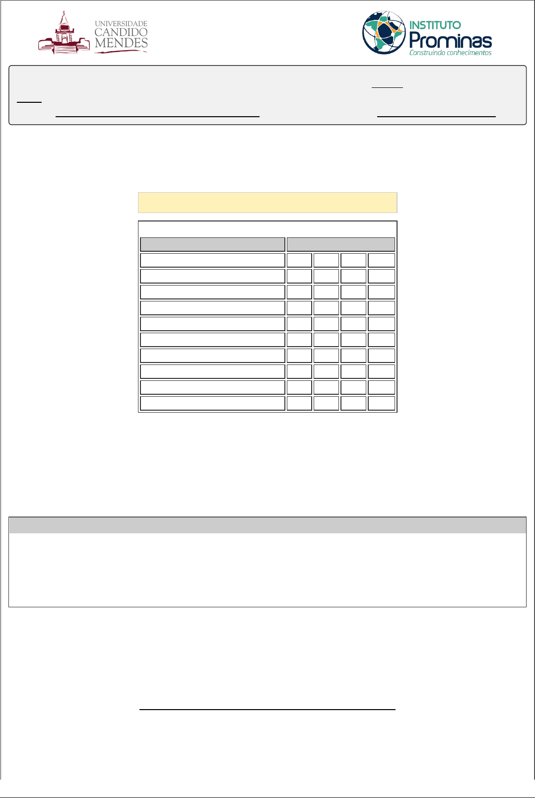 Avaliação Inicial Nome completo: ANA CLAUDIA RODRIGUES DE FREITAS COSTA RA: 88926 Data da prova: Curso: PSICOPEDAGOGIA E EDUCAÇÃO INFANTIL Unidade de Estudo: Código da Avaliação: 001822635A Teorias e Práticas da Psicopedagogia Institucional QUESTÃO ALTERNATIVAS 1 A B C D 2 A B C D 3 A B C D 4 A B C D 5 A B C D 6 A B C D 7 A B C D 8 A B C D 9 A B C D 10 A B C D Data de emissão: 06/03/2019 A CORREÇÃO ACONTECERÁ SOMENTE PELO GABARITO Instrução para a Avaliação a Distância - Devolver a prova juntamente com o gabarito. - Cada questão tem apenas 01(uma) alternativa correta. - Não pode ter rasura. - Use caneta azul ou preta. ASSINATURA POR EXTENSO DO ALUNO Pag. 1 Teorias e Práticas da Psicopedagogia Institucional 001822635 1) Quanto à Psicopedagogia, encontre a única alternativa FALSA:: A.( ) A Psicopedagogia é um campo de conhecimento e atuação em Saúde e Educação. B.( ) O profissional da Psicopedagogia trabalha com o processo de aprendizagem humana. C.( ) A Psicopedagogia trabalha com padrões normais e patológicos. D.( ) A Psicopedagogia atende apenas às crianças e adolescentes com dificuldades de aprendizagem. 2) Quanto ao que a Psicopedagogia conduz, todas estão corretas, exceto:: A.( ) A psicopedagogia leva em consideração que, para o seu desenvolvimento, o sujeito sofre influência e interferência do meio em que vive como, por exemplo, a família, a escola e a sociedade. B.( ) A Psicopedagogia busca desvelar os problemas de aprendizagem que podem ser determinantes no fracasso escolar e nos insucessos de cada ser humano. C.( ) A Psicopedagogia acredita que o ambiente escolar é o único fator causal das dificuldades de aprendizagem. D.( ) A Psicopedagogia busca a integração das várias segmentações como as ciências pedagógicas, psicológica, fonoaudiológica, neuropsicológica e psicolinguística. 3) Ainda sobre a Psicopedagogia e suas práticas, estaria INCORRETO afirmar que: : A.( ) A Psicopedagogia é um espaço transdisciplinar, pois se constitui a partir de uma nova compreensão acerca da complexidade dos processos de aprendizagem e na perspectiva das suas deficiências. B.( ) A Psicopedagogia é uma área das Ciências Humanas que se dedica ao estudo dos processos de aprendizagem. C.( ) Para a Psicopedagogia praticamente todos os fracassos na escola são resultantes de causas orgânicas identificadas e relacionadas às relações físicas do aluno. D.( ) As ações psicopedagógicas estão sendo aplicadas em vários segmentos, como: a escola, hospitais, empresariais, em organizações. 4) Para Bossa (2000), a Psicopedagogia Clínica tem como missão retirar as pessoas da sua condição inadequada de aprendizagem, dotando-as de sentimentos de alta auto-estima, fazendo-as perceber suas potencialidades, recuperando desta forma, seus processos internos de apreensão de uma realidade, nos aspectos:: A.( ) De conteúdos acadêmicos. B.( ) Todas as alternativas. C.( ) Afetivo-emocional. D.( ) Cognitivo. 5) O Psicopedagogo na escola, não deve:: A.( ) Possibilitar intervenção com o intuito de solucionar os problemas de aprendizagem tendo como eixo norteador o aluno. B.( ) Levantar discussões e oferecer assessoria psicopedagógica aos trabalhos realizados em cenários escolares. C.( ) Buscar a realização de um diagnóstico e intervenção psicopedagógica, utilizando métodos, instrumentos e técnicas próprias da psicopedagogia institucional. D.( ) Focar o aluno como única fonte de explicação para os problemas de aprendizagem. 6) Com relação à ação do Psicopedagogo, todas estão corretas, EXCETO:: A.( ) Deverá investir na possibilidade de melhoria das relações de aprendizagem e na construção da autonomia de alunos e educadores. B.( ) A escola serve de base para se fazer um diagnóstico psicopedagógico institucional com o intuito de detectar os problemas de aprendizagem, e, consequentemente tomar decisões adequadas no combate ao fracasso escolar. C.( ) A ação do psicopedagogo deve estar voltada para a prevenção das dificuldades de aprendizagem e prevenção do fracasso escolar só do aluno, excluindo do processo os educadores e todos os outros envolvidos. D.( ) Faz-se necessário a prática constante da investigação, da pesquisa, da reflexão e da ação psicopedagógica. 7) Quanto às funções do Psicopedagogo, marque V (para as verdadeiras) ou F (para as falsas): ( ) Ajudar os professores, auxiliando-os na melhor forma de elaborar um plano de aula para que os alunos possam entender melhor as aulas. ( ) Ajudar na elaboração do projeto pedagógico. ( ) Orientar os professores na melhor forma de ajudar, em sala de aula, aquele aluno com dificuldades de aprendizagem. ( ) Realizar um diagnóstico institucional para averiguar possíveis problemas pedagógicos que possam prejudicar o processo ensino-aprendizagem. ( ) A partir de avaliações psicopedagógicos, encaminhar o aluno para um profissional adequado como psicopedagogo, psicólogo, fonoaudiólogo, entre outros. ( ) Conversar com os pais para fornecer orientações. ( ) Auxiliar a direção da escola para que os profissionais da instituição possam ter um bom relacionamento entre si. ( ) Conversar com a criança ou adolescente quando este precisar de orientação. São verdadeiras:: Pag. 2 Teorias e Práticas da Psicopedagogia Institucional 001822635 A.( ) Todas acima são verdadeiras. B.( ) Quatro são verdadeiras. C.( ) Apenas duas são verdadeiras. D.( ) Nenhuma é verdadeira. 8) Para melhor atuação e uma prática psicopedagógica mais eficiente e eficaz, o psicopedagogo deve refletir e agir de acordo com os princípios abaixo, EXCETO:: A.( ) Tornar a prática do diálogo com as crianças um hábito no espaço escolar, com o intuito de buscar uma compreensão de suas angústias, inquietações, desejos e ansiedades que demonstram os mecanismos de aprendizagem de cada um. B.( ) Buscar de forma incessante a reintegração do aluno no contexto escolar, possibilitando