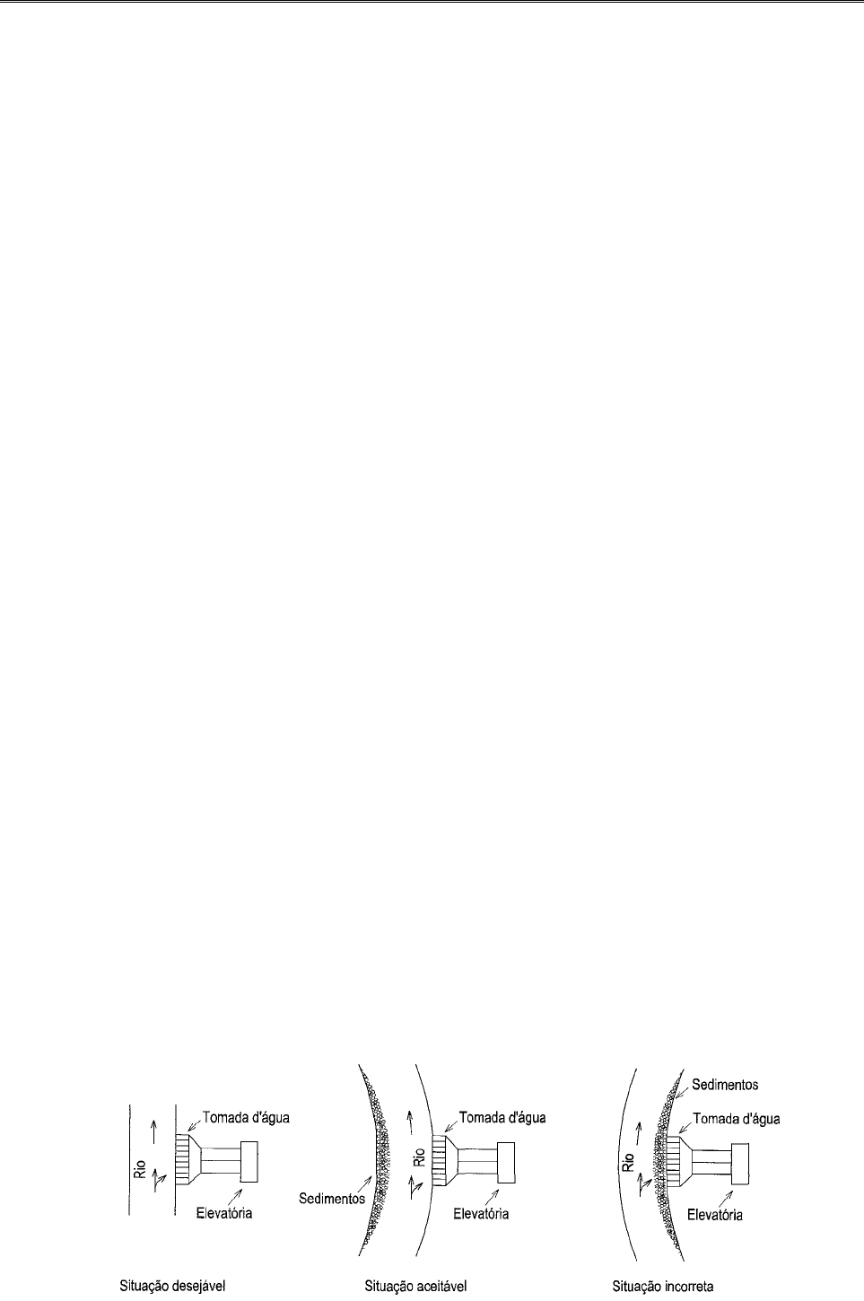 Notas de aula - 5. Captaçao OBS. As notas de aula são apenas um roteiro, estudem pelos livros. 5. CAPTAÇÃO 5.1 Introdução Captação é o conjunto de estruturas e dispositivos, construídos ou montados junto a um manancial, para a tomada de água destinada a um sistema de abastecimento. As captações consequentemente podem ser para coletar ou retirar águas atmosféricas, superficiais e subterrâneas. O reservatório de acumulação (regularização de vazões) muitas vezes é construído como parte integrante do sistema de captação. As obras de captação variam conforme as condições locais, hidrológicas, topográficas e, para as águas subterrâneas, também segundo as condições hidrogeológicas. A captação é a primeira unidade do sistema de abastecimento de água, e do seu constante e bom funcionamento depende o desempenho de todas as unidades subseqüentes. A concepção de uma unidade de captação de água deve considerar que não são admissíveis interrupções em seu funcionamento. Ao se desenvolver o projeto de captação deve-se ter em vista facilidades de operação e manutenção ao longo do tempo. É recomendado que as obras de captação sejam construídas em uma única etapa pois, por tratar-se de estruturas construídas junto ou dentro d’água, sua ampliação torna-se difícil. 5.2 Captação de águas superficiais Na elaboração do projeto de captação de águas superficiais, várias características quantitativas e qualitativas dos cursos d’águas devem ser avaliadas. Algumas das mais importantes são: - levantamento de dados fluviométricos; - informações sobre as oscilações de nível de água nos períodos de estiagem e enchente; - levantamento de dados hidrológicos da bacia ou de bacias próximas; - características físicas, químicas e bacteriológicas da água; - localização na bacia de focos poluidores atuais e potenciais. A escolha do local deve ser antecedida da avaliação dos seguintes fatores: - distância da captação à ETA; - eventuais custos com desapropriações; - necessidade de estação elevatória; - disponibilidade de energia elétrica; - facilidade de acesso. A concepção e a escolha do local de captação da água devem assegurar: - condições de fácil entrada d’água em qualquer época do ano; - assegurar tanto quanto possível a melhor qualidade da água do manancial; - garantir o funcionamento e a proteção contra danos e obstruções; - favorecer a economia das instalações; - facilitar a operação e manutenção ao longo do tempo; - planejamento e execução cuidadosa de estruturas junto ou dentro da água uma vez que a ampliação é geralmente muito trabalhosa; - prever proteção contra inundação. IMPORTANTE: - instalação de bombeamento conjugada à captação sempre ao abrigo das maiores enchentes previstas; - distância entre a bomba e o NA mínimo previsto no rio não deverá ultrapassar a capacidade de sucção das bombas; - obras de captação devem ser executadas em trechos retilíneos dos rios ou quando em curva devem ser localizadas junto à curvatura externa (margem côncava). Figura – Posicionamento em planta das captações em cursos de água superficial Notas de aula - 5. Captaçao OBS. As notas de aula são apenas um roteiro, estudem pelos livros. 5.2.1Partes constituintes de um sistema de captação (manancial de superfície) - barragem ou vertedores para manutenção do nível ou para regularização de vazão, enrrocamentos; - orgãos de tomada d’água com dispositivos para impedir a entrada de materiais flutuantes ou em suspensão: grades, telas, crivos, desarenador (cx. Areia); - dispositivos para controlar a entrada de água: comportas, adufas, registros e “stoplogs”; - canais ou tubulações de interligação e orgãos acessórios. - Poço de sucção e casa de bombas para alojar os conjuntos elevatórios, quando necessário. 5.3 Tipos de captação superficial As características dos tipos de captação são ditadas pelo porte e conformação do leito desses mananciais, associados à topografia e geologia locais, bem como pela velocidade, qualidade e variação do nível da água. 5.3.1 Captação direta A captação direta limita-se a tomada d’água, sendo empregada em cursos de água perenemente volumosos, sujeitos a pequena variação de nível. Quando o leito do rio for rochoso não há necessidade de revestimento do mesmo, porém se o leito for sujeito a erosão deverá ser feito um muro de sustentação à margem do rio ou o revestimento de um trecho da margem, neste caso a tubulação em cuja extremidade fica a tomada d’água pode ficar apoiada sobre pilares. Caso a margem do rio seja de pequena declividade e a espessura da lâmina d’água é pequena o crivo pode ser substituído por um ou mais tubos perfurados que se apoiam em pilares à margem do curso d’água (Sfuros>>>Stubulação). Tomada direta Nmín. Prof. = Nmín.rio – 1,0 m Caixa de tomada de água em captação a fio de água Fonte: HADDAD (1997) apud HELLER e PÁDUA (2010) Tubulação de tomada com tubos perfurados Fonte: HADDAD (1997) apud HELLER e PÁDUA (2010) Obs.: a Norma permite captação direta por bombas quando: - Quando dispensável o desarenador; - as bombas servirem como recalque intermediário entre o rio e a caixa de areia (bombas submerssíveis ou flutuantes); - população menor que 10.000 habitantes. 5.3.2 Barragem de nível: A barragem de regularização de nível é muito utilizada para pequenos cursos d’água, principalmente quando o suprimento é feito por gravidade e o leito do rio se apresenta rochoso no local em que a barragem vai ser construída. É empregada quando a captação direta não pode ser utilizada devido ao rio apresentar pequena lâmina d’água, portanto a finalidade da barragem de nível é elevar o nível d’água no local da captação. Só deve ser utilizada quando a vazão mínima do rio supera a demanda média do dia de maior consumo. O rep