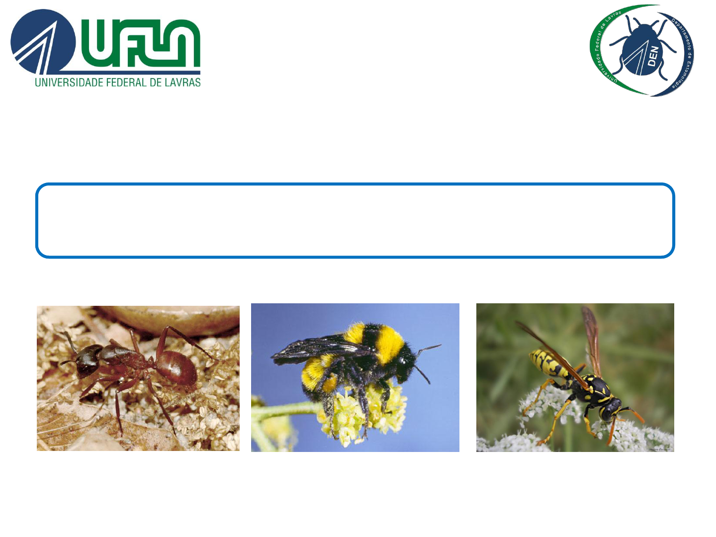 * Ordem: Hymenoptera Universidade Federal de Lavras Departamento de Entomologia Disciplina: Entomologia Geral (GET 101) Lavras/MG 2016 * Ordem Hymenoptera (hymen = membrana; ptera = asas) Abelhas; Vespas; Formigas etc Pouco daninhos à agricultura Exceção: saúvas causam danos nas culturas no Brasil Espécies úteis: abelhas produção de mel, cera, geleia real e na polinização de plantas Inimigos naturais: parasitoides e predadores Ocupam 3° lugar em número de espécies CARACTERÍSTICAS * * Ordem Hymenoptera (hymen = membrana; ptera = asas) Cabeça bem desenvolvida, destacada do corpo, unida ao tórax “pescoço” móvel e mais ou menos alongado Olhos compostos bem desenvolvidos; atrofiados ou rudimentares em certas espécies Ocelos presentes (3) dispostos em triângulo no vértice da cabeça Antenas bem desenvolvidas e de vários tipos: geniculado; genículo-clavado; filiforme Aparelho bucal de 2 tipos: mastigador (vespas, formigas) ou lambedor (abelhas e mamangavas) CARACTERÍSTICAS * Cabeça livre e bem desenvolvida; destacada do corpo * Olhos compostos bem desenvolvidos; Ocelos presentes (3) * Antenas geniculada, clavada e filiforme * Antenas pectinada e serreada Dimorfismo sexual entre Diprionidae ♀ ♂ * Aparelho bucal mastigador * Aparelho bucal lambedor * Ordem Hymenoptera (hymen = membrana; ptera = asas) Tórax normal mesotórax mais desenvolvido Pernas ambulatórias; exceção das abelhas e mamangavas pernas posteriores coletoras (1° tarsômero mais desenvolvido – basitarso corbícola ou escopa) Tarsos pentâmeros Asas membranosas, transparentes ou coloridas; as anteriores são maiores que as posteriores Acoplamento das asas: hâmulos série de ganchinhos da asa posterior que encaixa na asa anterior Formigas (operárias) e fêmeas da formiga-feiticeira: ápteras CARACTERÍSTICAS * Tórax Mesotórax mais desenvolvido * Pernas coletoras (abelhas) e ambulatórias (demais) * Asas membranosas * Ordem Hymenoptera (hymen = membrana; ptera = asas) Abdome séssil (Subordem Symphyta) e pedunculado ou livre (Subordem Apocrita) Abdome pedunculado: 1° urômero (propódeo) está fundido ao metatórax os segmentos torácicos + propódeo formam o mesossoma Abdome pedunculado: demais urômeros formam duas partes distintas: pecíolo (constrição formada pelo 2° ou 2° e 3° urômeros) e gáster (parte volumosa do abdome); pecíolo + gáster = metassoma Apêndices abdominais ausentes Ovipositor de 2 tipos: em forma de térebra ou em forma de ferrão (meio de defesa ou de ataque) CARACTERÍSTICAS * Abdome séssil (Symphyta) e pedunculado ou livre (Apocrita) * Gáster Pecíolo Geralmente apêndices abdominais ausentes * Ovipositor * Ordem Hymenoptera (hymen = membrana; ptera = asas) Reprodução sexuada cópula efetua-se durante o vôo Desenvolvimento por holometabolia Larvas de 2 tipos: eruciforme (Subordem Symphyta) - fitófagas; vermiformes (Subordem Apocrita) – melívoras, polenófagas,fungívoras, parasitoides Pupas exaradas (livres) Adultos alimentam-se de néctar e pólen ou, do fluido que extravasa do corpo do hospedeiro (parasitoides) CARACTERÍSTICAS * Reprodução sexuada * Ordem Hymenoptera (hymen = membrana; ptera = asas) IMPORTÂNCIA ECONÔMICA 1° grupo: espécies nocivas – saúvas; formigas quen-quéns; espécies cecidógenas (causadoras de galhas); vespas fitófagas (Symphyta); abelha-irapuá (pragas de flores e citros); hiperparasitoides (atacam os parasitoides) 2° grupo: espécies úteis – abelhas (mel, cera, geleia real, polinização); vespas predadoras e os microimenópteros parasitoides CARACTERÍSTICAS * Ordem Hymenoptera (hymen = membrana; ptera = asas) Subordem Symphyta: abdome séssil; trocanter dítroco; asas com sistema de nervação complexo; larvas eruciformes e fitófagas; ovipositor serreado, pouco saliente Subordem Apocrita: abdome livre ou pedunculado; trocanter simples ou dítroco; nervação das asas simples; fêmea com ovipositor estiliforme nunca serreado; larvas ápodas de hábitos variados 2 SUBORDENS * Ordem Hymenoptera Subordem Symphyta Subordem Apocrita Família Siricidae Família Apidae Família Cimbicidae Família Diprionidae Família Ichneumonidae Família Pergidae * Subordem Apocrita Família Figitidae Família Cynipidae Família Trichogrammatidae Família Agaontidae Família Eulophidae Família Pteromalidae Família Encyrtidae Família Scelionidae Família Chalcididae Família Evaniidae Família Bethylidae Família Chrysididae Família Vespidae Família Mutillidae * Família Pompilidae Família Scoliidae Família Formicidae Família Anthophoridae Família Sphecidae Família Megachilidae Família Halictidae Família Andrenidae Família Colletidae Família Oxaeidae Família Tenthredinidae Família Aphidiidae Subordem Apocrita Família Braconidae * Subordem Symphyta Abdome séssil com sistema de nervação complexo nas asas * Siricidae * Cimbicidae * Diprionidae * Pergidae * Subordem Apocrita Abdome livre ou pedunculado com nervações simples nas asas * Apidae Corbícola presente * Ichneumonidae Asas anteriores com 2 nervuras recorrentes * Cynipidae * Figitidae * Trichogrammatidae * Eulophidae * Agaontidae * Pteromalidae * Encyrtidae * Chalcididae Fêmures posteriores muito desenvolvidos * Scelionidae * Evaniidae Gáster curto inserido na parte superior do propódeo * Chrysididae * Bethylidae * Vespidae Olhos compostos com reentrância e sutura mesopleural ausente * Mutillidae Pecíolo abdominal sem nódulo * Scoliidae Asas anteriores sem células fechadas no 1/3 apical * Pompilidae Olhos compostos sem reentrância e/ou sutura mesopleural presente * Formicidae Pecíolo abdominal com 1 ou 2 nódulos * Sphecidae Pêlos não ramificados * Anthophoridae Escopa presente * Megachilidae Asas posteriores com o lobo jugal menor do que a célula submediana * Halictidae Asas anteriores com a nervura basal encurvada * Colletidae Glossa truncada ou bilobada * Andrenidae Antenas com o 1° artículo do flagelo mais curto do que o escapo * Oxae