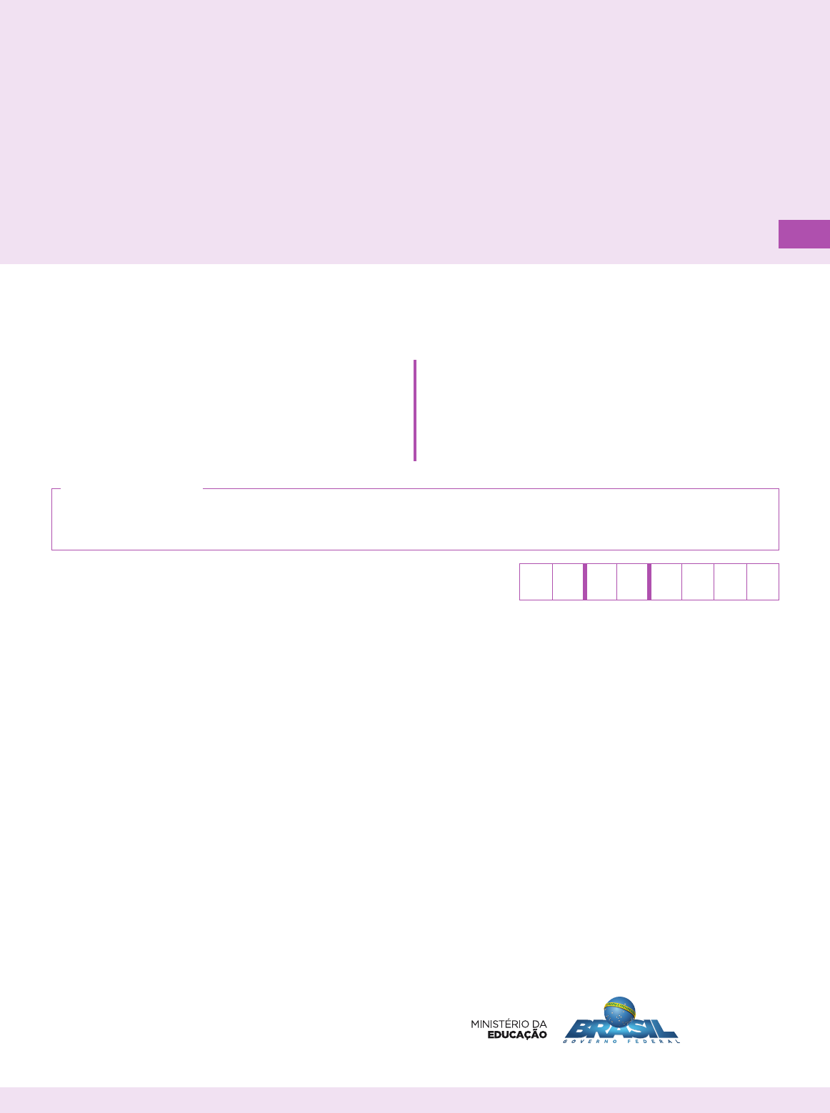 Caderno M0305 MATEMÁTICA Alfabetização Nome do aluno(a) Data de Nascimento do aluno(a) NOVO MAIS EDUCAÇÃO 2017 MT3EF Caro(a) aluno(a), Você está participando do Novo Mais Educação. Sua participação é muito importante para sabermos como está a educação em nosso país. • Hoje, você vai fazer atividades de Matemática. • Responda com calma, procurando não deixar nenhuma questão em branco. Bom teste! NOVO MAIS EDUCAÇÃO BL03M03 Questão 01 M010550E4 Fábio comprou a garrafa de número quatro. Qual foi a garrafa que ele comprou? A 3 B 4 C 5 D 6 M0305 1 BL03M03 Questão 02 M020447E4 Observe abaixo os preços dos produtos que Sueli comprou em um supermercado. PRODUTOS PREÇO 2 REAIS Leite 5 REAIS 3 REAIS 4 REAIS De acordo com essa tabela, qual é o preço do leite? A 2 REAIS. B 3 REAIS. C 4 REAIS. D 5 REAIS. Questão 03 M010212E4 Carlos tinha 8 bolinhas de gude e distribuiu igualmente essa quantidade para seus 2 amigos. Qual a quantidade de bolinhas de gude que cada um desses amigos recebeu? A 4 B 6 C 10 D 16 M0305 2 BL03M03 Questão 04 M010317E4 Qual dos objetos abaixo lembra a forma de um cubo? A B C D Questão 05 M020213E4 Paulo foi à feira e comprou 6 maçãs e 8 laranjas. Quantas frutas Paulo comprou ao todo na feira? A 2 FRUTAS. B 8 FRUTAS. C 13 FRUTAS. D 14 FRUTAS. M0305 3 BL03M03 Questão 06 M020501E4 Adriana trabalhou em um empresa durante 1 ano. Quantos meses, no total, Adriana trabalhou nessa empresa? A 13 B 12 C 11 D 10 Questão 07 M010548E4 Observe abaixo os materiais escolares que Maria comprou para seus filhos. Qual desses materiais Maria comprou em menor quantidade? A B C D M0305 4 BL07M03 Questão 08 M020430E4 Qual é o varal de roupas mais comprido? A B C D Questão 09 M010029E4 Carla fez 10 docinhos para vender. Patrícia fez o dobro de docinhos de Carla. Quantos docinhos Patrícia fez? A 5 B 12 C 20 D 22 M0305 5 BL07M03 Questão 10 M020267E4 Observe abaixo a quantidade de aviões que Pedro desenhou. Pedro desenhou um total de A 3 aviões. B 6 aviões. C 11 aviões. D 12 aviões. M0305 6 BL07M03 Questão 11 M020071D3 Observe o cilindro abaixo. Qual caixa tem a forma que lembra um cilindro? A B C D M0305 7 BL07M03 Questão 12 ESM.68.2526 Bruno precisa completar 24 pontos em um jogo para ganhar um brinde. Ele já conseguiu fazer 17 pontos. Para Bruno ganhar esse brinde, faltam quantos pontos para ele fazer? A 7 B 8 C 24 D 41 Questão 13 M010525E4 Observe no relógio abaixo o horário em que a aula de informática de Marcela começou. Qual é o horário em que a aula de informática de Marcela começou? A 12 hORAS E 9 MInUTOS. B 12 hORAS. C 9 hORAS E 12 MInUTOS. D 9 hORAS. M0305 8 BL07M03 Questão 14 M010554E4 Qual é o número que vem logo depois do número 3? A 2 B 3 C 4 D 5 M0305 9 BL05M03 Questão 15 M010572E4 Observe abaixo as 13 fi gurinhas de Fernando. Ele deu 6 dessas figurinhas para um amigo. Com quantas figurinhas Fernando ficou? A 7 B 8 C 13 D 19 M0305 10 BL05M03 Questão 16 M020324E4 Observe abaixo os palhaços de um circo que se apresentam com pernas de pau. Qual é o palhaço que utiliza as pernas de pau mais compridas? A 1 B 2 C 3 D 4 M0305 11 BL05M03 Questão 17 M020488E4 Adriana foi à farmácia e comprou 3 cartelas de remédio com 9 comprimidos em cada cartela. Observe abaixo o desenho de uma dessas cartelas. R e m é d io Quantos comprimidos Adriana comprou, no total, nessa farmácia? A 3 B 9 C 12 D 27 M0305 12 BL05M03 Questão 18 M030018E4 Uma academia oferece diversas atividades a seus alunos. No gráfico abaixo está representada a quantidade de pessoas que participaram de cada uma dessas atividades em uma semana. 50 40 30 20 10 0 NATAÇÃO GINÁSTICA DANÇA PILATES De acordo com esse gráfico, quantas pessoas, ao todo, participaram da atividade de ginástica nessa semana? A 50 B 40 C 30 D 20 M0305 13 BL05M03 Questão 19 M030091E4 Observe o número que está no quadro abaixo. 615 A escrita por extenso desse número é A SEIS E QUInZE. B SESSEnTA E QUInZE. C SESSEnTA E UM E CInCO. D SEISCEnTOS E QUInZE. Questão 20 M020149E4 Observe a nota de dinheiro abaixo. Raul trocou essa nota por outras que juntas têm esse mesmo valor. Quais notas Raul recebeu nessa troca? A B C D M0305 14 BL05M03 Questão 21 M030177E4 Observe abaixo a numeração de algumas camisas. 98 19 89 99 91 A numeração dessas camisas, organizadas em ordem crescente, é A 99 – 98 – 91 – 89 – 19. B 19 – 91 – 89 – 98 – 99. C 19 – 89 – 91 – 98 – 99. D 19 – 98 – 91 – 89 – 99. M0305 15