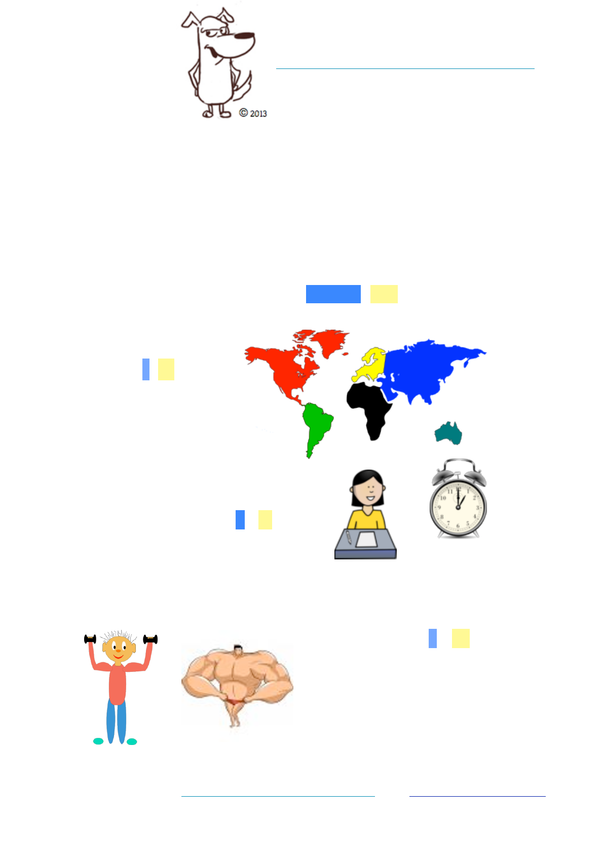 Adjektiv-Steigerung: Komparativ & Superlativ ! 1. Wie bilde ich den Komparativ :Umlaut, -er, Europa ist groß. Afrika ist größer. 10 Minuten Deutsch lernen ist kurz. 5 Minuten Deutsch lernen ist kürzer. Tim: Arnold: Tim ist stark. Arnold ist stärker. learn German fast. easy. 100% free http://www.free-german-lessons-online.com All rights are reserved. http://www.free-german-lessons-online.com freeGermanlessons@gmail.com Pictures are in the public domain, Picture „dog“ © by free-german-lesson-online.com 1 Anna: Lina: Anna trainiert jeden Tag eine Stunde Ballett. Das ist lang. Lina trainiert länger. Moritz: Lulu: Moritz ist intelligent. Lulu ist intelligenter. mehr intelligent Umlaut: a --> ä u --> ü o --> ö Übung: Bilde den Komparativ hart ___________ schwarz ___________ weit ___________ alt ___________ groß ___________ schön ___________ arm ___________ dumm ___________ lieb ___________ kalt ___________ jung ___________ billig ___________ krank ___________ klug ___________ scharf ___________ nah ___________ gesund ___________ intelligent ___________ warm ___________ schwach ___________ interessant ___________ Lösung härter schwärzer weiter älter größer schöner ärmer dümmer lieber kälter jünger billiger kränker klüger schärfer näher gesünder schwächer wärmer schwächer interessanter learn German fast. easy. 100% free http://www.free-german-lessons-online.com All rights are reserved. http://www.free-german-lessons-online.com freeGermanlessons@gmail.com Pictures are in the public domain, Picture „dog“ © by free-german-lesson-online.com 2 kein Umlaut bei anderen Adjektiven Adjektivendung: -el und –er: kein -e im Komparativ Ausnahme: Adjektive aus romanischen Sprachen/Latein: clever, koscher dunkel - dunkler (nicht: dunkeler) Übung: Bilde den Komparativ teuer __________ sauer __________ edel __________ Lösung teurer, saurer, edler learn German fast. easy. 100% free http://www.free-german-lessons-online.com All rights are reserved. http://www.free-german-lessons-online.com freeGermanlessons@gmail.com Pictures are in the public domain, Picture „dog“ © by free-german-lesson-online.com 3 2. Wie bilde ich den Superlativ? -ste / sten groß größer am größten schön schöner am schönsten intelligent, intelligenter, am intelligentesten Superlativ + Nomen: Der Mount Everest ist der höchste Berg in der Welt. Die Eule ist das intelligenteste Tier in der Welt. Der Leopard ist das schnellste Tier in der Welt. Schneewittchen ist die schönste Prinzessin. Bienen sind die fleissigsten Tiere in der Welt. Der Superlativ wird wie ein Adjektiv dekliniert: - Kennst du den höchsten Berg in der Welt? - Er möchte mit der schönsten Prinzessin tanzen. learn German fast. easy. 100% free http://www.free-german-lessons-online.com All rights are reserved. http://www.free-german-lessons-online.com freeGermanlessons@gmail.com Pictures are in the public domain, Picture „dog“ © by free-german-lesson-online.com 4 endet das Adjektiv auf -d, -ß, -sch, -t, -tz, -x oder -z: -esten Superlativ ohne Nomen (ABSOLUT): Europa ist groß. Afrika ist größer. Asien ist am größten. Moritz ist intelligent. Lulu ist intelligenter. Einstein ist am intelligentesten. Einstein ist der intelligenteste Physiker der Welt. Tim ist stark. Arnold ist stärker. Pippi Langstrumpf ist am stärksten. Pippi Langstrumpf von Astrid Lindgren ist das stärkste Mädchen der Welt! Übung: Bilde den Komperativ und Superlativ groß: Tokyo ist _____________ Stadt (fem.) der Welt. reich: Bill Gates ist ______________ Mann der Welt. schnell: der Bugatti ist _____________ Auto (neut.) der Welt. interessant: Ist Berlin _______________ Stadt (fem.) der Welt? Ein Igel ist langsam, eine Schildkröte ist ___________, eine Schnecke ist _________. learn German fast. easy. 100% free http://www.free-german-lessons-online.com All rights are reserved. http://www.free-german-lessons-online.com freeGermanlessons@gmail.com Pictures are in the public domain, Picture „dog“ © by free-german-lesson-online.com 5 3. Sätze: größer ALS + Nominativ | gleich groß WIE Bello Wuff Bello ist genauso/gleich/so groß wie Wuff. Wuff bellt genauso laut wie Bello = Wuff ist genauso schön wie Bello. 4. Besondere Formen gut besser am besten hoch höher am höchsten nah näher am nächsten viel / sehr mehr am meisten gern lieber am liebsten Tonio isst gern Pommes. Er ist lieber Pasta. Am liebsten isst er Pizza. learn German fast. easy. 100% free http://www.free-german-lessons-online.com All rights are reserved. http://www.free-german-lessons-online.com freeGermanlessons@gmail.com Pictures are in the public domain, Picture „dog“ © by free-german-lesson-online.com 6 Ich bin groß. Bobi ist größer als ich. Bobi ist stark. Aber ich bin stärker als Bobi. Ich bin auch schöner als Bobi! Doris spielt gut Fussball, Andrea spielt besser, Schweinsteiger spielt am besten. 5. Übungen a) schön: = Lisa ist _______________________ Anna. Lisa Anna nett > Lisa ist _________________ Anna dumm > >> der Polizist ist _________________ die Polizistin. der Polizist die Polizistin learn German fast. easy. 100% free http://www.free-german-lessons-online.com All rights are reserved. http://www.free-german-lessons-online.com freeGermanlessons@gmail.com Pictures are in the public domain, Picture „dog“ © by free-german-lesson-online.com 7 Fülle ein: als/wie und die Adjektivformen (Komparativ: >, Superlativ: >> ) b) 1. viel, groß München ist eine große Stadt mit vielen Einwohnern. (>)______ Menschen wohnen in Berlin ____ in München. Natürlich ist Berlin auch (>)________________ ____ München. Zürich ist die (>>)___________ Stadt in der Schweiz. Genf ist (>)_______ ___ Luzern. Zürich ist auch die Stadt mit (>>)__________________ Einwohnern. 2. schwierig Russisch ist (=) _____________ ____ Deutsch. Deutsch und Russisch sind (>)____________ Englisch. Diese Grammatik ist schwierig. Ist sie die (>>) __________ Grammatik in Deutsch? Ich denke ni
